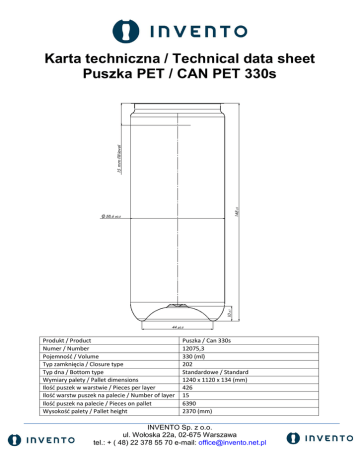 Karta techniczna / Technical data sheet Puszka PET / CAN PET 330s Produkt / Product Numer / Number Pojemność / Volume Typ zamknięcia / Closure type Typ dna / Bottom type Wymiary palety / Pallet dimensions Ilość puszek w warstwie / Pieces per layer Ilość warstw puszek na palecie / Number of layer Ilość puszek na palecie / Pieces on pallet Wysokość palety / Pallet height Puszka / Can 330s 12075,3 330 (ml) 202 Standardowe / Standard 1240 x 1120 x 134 (mm) 426 15 6390 2370 (mm) INVENTO Sp. z o.o. ul. Wołoska 22a, 02-675 Warszawa tel.: + ( 48) 22 378 55 70 e-mail: [email protected]