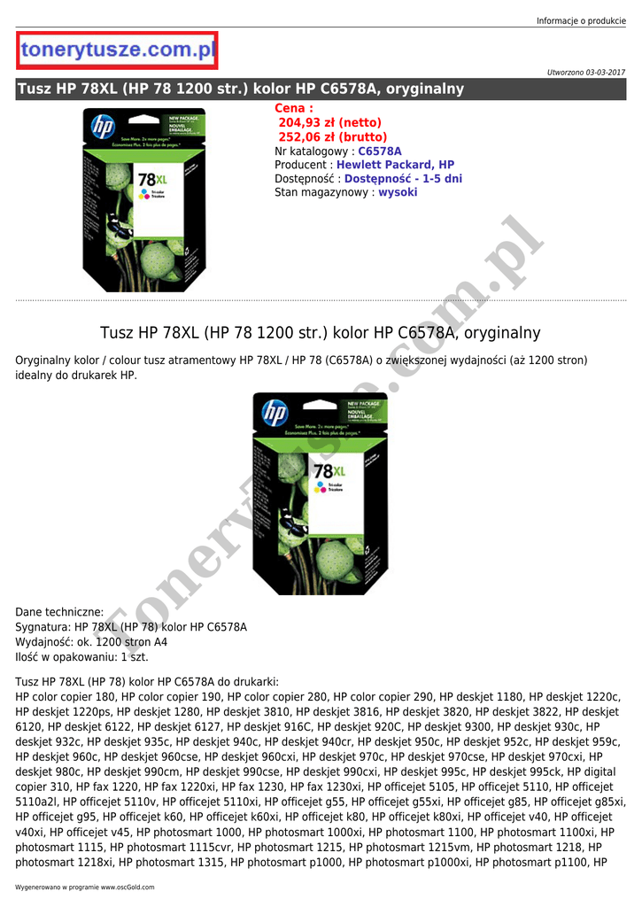 Informacje o produkcie Utworzono 03-03-2017 Tusz HP 78XL (HP 78 1200 str.) kolor HP C6578A, oryginalny Cena : 204,93 zł (netto) 252,06 zł (brutto) om .p l Nr katalogowy : C6578A Producent : Hewlett Packard, HP Dostępność : Dostępność - 1-5 dni Stan magazynowy : wysoki Tusz HP 78XL (HP 78 1200 str.) kolor HP C6578A, oryginalny ne r yT u sz e. c Oryginalny kolor / colour tusz atramentowy HP 78XL / HP 78 (C6578A) o zwiększonej wydajności (aż 1200 stron) idealny do drukarek HP. To Dane techniczne: Sygnatura: HP 78XL (HP 78) kolor HP C6578A Wydajność: ok. 1200 stron A4 Ilość w opakowaniu: 1 szt. Tusz HP 78XL (HP 78) kolor HP C6578A do drukarki: HP color copier 180, HP color copier 190, HP color copier 280, HP color copier 290, HP deskjet 1180, HP deskjet 1220c, HP deskjet 1220ps, HP deskjet 1280, HP deskjet 3810, HP deskjet 3816, HP deskjet 3820, HP deskjet 3822, HP deskjet 6120, HP deskjet 6122, HP deskjet 6127, HP deskjet 916C, HP deskjet 920C, HP deskjet 9300, HP deskjet 930c, HP deskjet 932c, HP deskjet 935c, HP deskjet 940c, HP deskjet 940cr, HP deskjet 950c, HP deskjet 952c, HP deskjet 959c, HP deskjet 960c, HP deskjet 960cse, HP deskjet 960cxi, HP deskjet 970c, HP deskjet 970cse, HP deskjet 970cxi, HP deskjet 980c, HP deskjet 990cm, HP deskjet 990cse, HP deskjet 990cxi, HP deskjet 995c, HP deskjet 995ck, HP digital copier 310, HP fax 1220, HP fax 1220xi, HP fax 1230, HP fax 1230xi, HP officejet 5105, HP officejet 5110, HP officejet 5110a2l, HP officejet 5110v, HP officejet 5110xi, HP officejet g55, HP officejet g55xi, HP officejet g85, HP officejet g85xi, HP officejet g95, HP officejet k60, HP officejet k60xi, HP officejet k80, HP officejet k80xi, HP officejet v40, HP officejet v40xi, HP officejet v45, HP photosmart 1000, HP photosmart 1000xi, HP photosmart 1100, HP photosmart 1100xi, HP photosmart 1115, HP photosmart 1115cvr, HP photosmart 1215, HP photosmart 1215vm, HP photosmart 1218, HP photosmart 1218xi, HP photosmart 1315, HP photosmart p1000, HP photosmart p1000xi, HP photosmart p1100, HP Wygenerowano w programie www.oscGold.com To ne r yT u sz e. c om .p l photosmart p1100xi, HP psc 720, HP psc 750, HP psc 750cxi, HP psc 750se, HP psc 750xi, HP psc 760, HP psc 950, HP psc 950se, HP psc 950vr, HP psc 950x