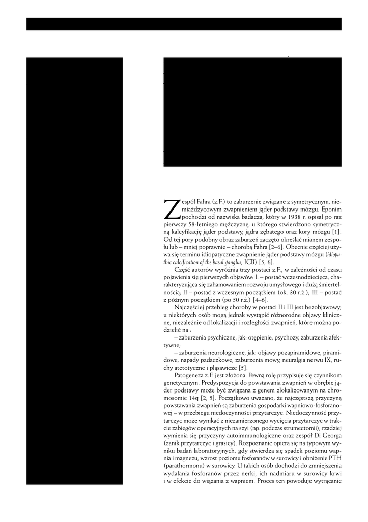 OPIS PRZYPADKU – CASE REPORT STRESZCZENIE Omówiono stan wiedzy na temat zespo∏u Fahra: prawdopodobnych przyczyn choroby, przebiegu klinicznego zaburzeƒ psychicznych i neurologicznych, zmian w badaniach neuroobrazowych, zmian w badaniach psychologicznych, odchyleƒ w badaniach laboratoryjnych. Praca powsta∏a na podstawie doniesieƒ z piÊmiennictwa polskiego i obcego, przedstawiajàcego opisy przypadków wyst´powania zaburzeƒ psychicznych w przebiegu zespo∏u Fahra. Opisano równie˝ chorà, hospitalizowanà w Klinice Psychiatrii Doros∏ych Akademii Medycznej w Poznaniu z rozpoznaniem zaburzeƒ neurokognitywnych w przebiegu zespo∏u Fahra. Przedstawiono jej stan psychiczny, nieprawid∏owoÊci w wynikach badaƒ neuroobrazowych, neurofizjologicznych, psychologicznych i laboratoryjnych, przebieg leczenia i jego efekty. S∏owa kluczowe: zespó∏ Fahra, zaburzenia neurokognitywne S U M M A RY The paper presents an overview of the current knowledge about the causes of the Fahr syndrome, a description of the clinical picture of neurological and psychological disorders, as well as abnormalities in results of radiological, psychological and laboratory examinations in patients with this diagnosis. The article is based on Polish and foreign literature, describing the presence of psychiatric disorders in the course of Fahr syndrome. The case of female patient is described, who was hospitalized at Department of Adult Psychiatry in Poznaƒ with neurocognitive disorders in the course of the Fahr syndrome. Her mental status, abnormalities in results of neuroimaging, neurophysiological, psychological and laboratory examinations, her treatment and its outcome were presented. K e y w o r d s : Fahr syndrome, neurocognitive disorders AGNIESZKA HEYMANN-SZLACHCI¡SKA JACEK KISIELEWSKI JANUSZ RYBAKOWSKI Klinika Psychiatrii Doros∏ych Akademii Medycznej w Poznaniu Zaburzenia neurokognitywne u chorej z zespo∏em Fahra Neurocognitive disorders in female patient with Fahr syndrome espó∏ Fahra (z.F.) to zaburzenie zwiàzane z symetrycznym, niemia˝d˝ycowym zwapnieniem jàder podstawy mózgu. Eponim pochodzi od nazwiska badacza, który w 1938 r. opisa∏ po raz pierwszy 58-letniego m´˝czyzn´, u którego stwierdzono symetrycznà kalcyfikacj´ jàder podstawy, jàdra z´batego oraz kory mózgu [1]. Od tej pory podobny obraz zaburzeƒ zacz´to okreÊlaç mianem zespo∏u lub – mniej poprawnie – chorobà Fahra [2–6]. Obecnie cz´Êciej u˝ywa si´ terminu idiopatyczne zwapnienie jàder podstawy mózgu (idiopathic calcification of the basal ganglia, ICB) [5, 6]. Cz´Êç autorów wyró˝nia trzy postaci z.F., w zale˝noÊci od czasu pojawienia si´ pierwszych objawów: I. – postaç wczesnodzieci´ca, charakteryzujàca si´ zahamowaniem rozwoju umys∏owego i du˝à ÊmiertelnoÊcià; II – postaç z wczesnym poczàtkiem (ok. 30 r.˝.); III – postaç z póênym poczàtkiem (po 50 r.˝.) [4–6]. Najcz´Êciej przebieg choroby w postaci II i III jest bezobjawowy; u niektórych osób mogà jednak wystàpiç ró˝norodne objawy kliniczne, niezale˝nie od lokalizacji i rozleg∏oÊci zwapnieƒ, które mo˝na podzieliç na : – zaburzenia psychiczne, jak: ot´pienie, psychozy, zaburzenia afektywne; – zaburzenia neurologiczne, jak: objawy pozapiramidowe, piramidowe, napady padaczkowe, zaburzenia mowy, neuralgia nerwu IX, ruchy atetotyczne i plàsawicze [5]. Patogeneza z.F. jest z∏o˝ona. Pewnà rol´ przypisuje si´ czynnikom genetycznym. Predyspozycja do powstawania zwapnieƒ w obr´bie jàder podstawy mo˝e byç zwiàzana z genem zlokalizowanym na chromosomie 14q [2, 5]. Poczàtkowo uwa˝ano, ˝e najcz´stszà przyczynà powstawania zwapnieƒ sà zaburzenia gospodarki wapniowo-fosforanowej – w przebiegu niedoczynnoÊci przytarczyc. NiedoczynnoÊç przytarczyc mo˝e wynikaç z niezamierzonego wyci´cia przytarczyc w trakcie zabiegów operacyjnych na szyi (np. podczas strumectomii), rzadziej wymienia si´ przyczyny autoimmunologiczne oraz zespó∏ Di Georga (zanik przytarczyc i grasicy). Rozpoznanie opiera si´ na typowym wyniku badaƒ laboratoryjnych, gdy stwierdza si´ spadek poziomu wapnia i magnezu, wzrost poziomu fosforanów w surowicy i obni˝enie PTH (parathormonu) w surowicy. U takich osób dochodzi do zmniejszenia wydalania fosforanów przez nerki, ich nadmiaru w surowicy krwi i w efekcie do wiàzania z wapniem. Proces ten powoduje wytràcanie Z 36 WIADOMOÂCI PSYCHIATRYCZNE (tom VII) Nr 1/2004 wapnia w tkankach mi´kkich pochodzenia ektodermalnego i obni˝enie st´˝enia w osoczu. Za przyczyn´ tzw. pseudoidiopatycznej niedoczynnoÊci przytarczyc uwa˝a si´ powstawanie PTH pozbawionego dzia∏ania biologicznego – tutaj tak˝e poziom wapnia jest obni˝ony, a fosforanów zwi´kszony. St´˝enie PTH nie jest obni˝one, lecz najcz´Êciej zwi´kszone. W przypadku rozpoznania niedoczynnoÊci przytarczyc jako przyczyny powstawania zwapnieƒ w o.u.n. zaleca si´ d∏ugotrwa∏e stosowanie witaminy D3, ograniczenie fosforanów w diecie oraz podawanie wodorotlenku glinu w celu ograniczenia wch∏aniania fosforanów [2–6]. Przyczynà powstawania zwapnieƒ mogà byç anomalie naczyniowe, które doprowadzajà do zwolnienia przep∏ywu krwi w jàdrach podstawy w porównaniu z szybkoÊcià przep∏ywu w korze mózgowej, co powoduje uszkodzenie bariery krew-mózg, a nast´pnie wytràcanie si´ bia∏ek surowicy i ich mineralizacj´. Mówi si´ tak˝e o roli fosfatazy alkalicznej, bioràcej udzia∏ w transporcie komórkowym. U osób z ICBG stwierdzono wzrost aktywnoÊci tego enzymu w jàdrach podstawy mózgu, przy prawid∏owym st´˝eniu w surowicy krwi [5]. Rozpoznanie z.F. opiera si´ na stwierdzeniu zwapnieƒ w obr´bie jàder podstawy mózgu za pomocà badania rentgenowskiego lub tomografii komputerowej (TK), a tak˝e tomografii rezonansu magnetycznego (MR). Najcz´stszà lokalizacjà zwapnieƒ jest ga∏ka blada [4, 5]. Badania prowadzone na uniwersytecie w Heidelbergu wykaza∏y