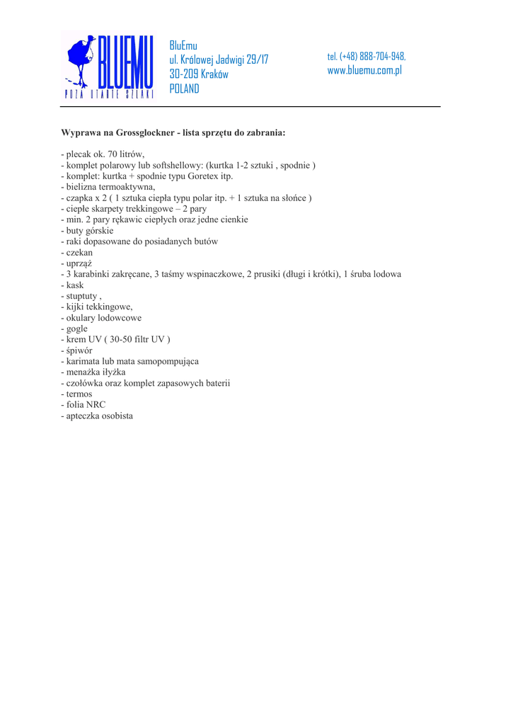 BluEmu ul. Królowej Jadwigi 29/17 30-209 Kraków POLAND tel. (+48) 888-704-948, www.bluemu.com.pl Wyprawa na Grossglockner - lista sprzętu do zabrania: - plecak ok. 70 litrów, - komplet polarowy lub softshellowy: (kurtka 1-2 sztuki , spodnie ) - komplet: kurtka + spodnie typu Goretex itp. - bielizna termoaktywna, - czapka x 2 ( 1 sztuka ciepła typu polar itp. + 1 sztuka na słońce ) - ciepłe skarpety trekkingowe – 2 pary - min. 2 pary rękawic ciepłych oraz jedne cienkie - buty górskie - raki dopasowane do posiadanych butów - czekan - uprząż - 3 karabinki zakręcane, 3 taśmy wspinaczkowe, 2 prusiki (długi i krótki), 1 śruba lodowa - kask - stuptuty , - kijki tekkingowe, - okulary lodowcowe - gogle - krem UV ( 30-50 filtr UV ) - śpiwór - karimata lub mata samopompująca - menażka iłyżka - czołówka oraz komplet zapasowych baterii - termos - folia NRC - apteczka osobista