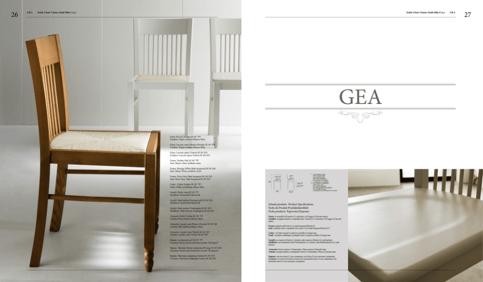 26 GEA Sedia Chair Chaise Stuhl Silla Стул Sedia Chair Chaise Stuhl Silla Стул GEA Fusto: Rovere Nodato SCAV 797 Fondino: Paglia sintetica Bianco Mais Fusto: Laccato opaco Bianco Prestige SCAV 028 Fondino: Paglia sintetica Bianco Mais Fusto: Laccato opaco Tortora SCAV 855 Fondino: Laccato opaco Tortora SCAV 855 Frame: Nodato Oak SCAV 797 Seat: Maize white synthetic straw Frame: Prestige White Matt lacquered SCAV 028 Seat: Maize White synthetic straw Frame: Dove Grey Matt lacquered SCAV 855 Seat: Dove Grey Matt lacquered SCAV 855 Cadre : Chêne Nodato SCAV 797 Fond : Paille synthétique Blanc Maïs Gestell: Eiche Astig SCAV 797 Sitzfläche: Kunststroh Maisweiß Gestell: Matt lackiert Prestigeweiß SCAV 028 Sitzfläche: Kunststroh Maisweiß Gestell: Matt lackiert Taubengrau SCAV 855 Sitzfläche: Matt lackiert Taubengrau SCAV 855 Armazón: Roble Nodato SCAV 797 Asiento: Paja sintética Blanco Maíz Armazón: Lacado mate Blanco Prestige SCAV 028 Asiento: Paja sintética Blanco Maíz 83 45,5* 43** 43* 41** 46,5* 43,5** 43 43.5 * con fondino legno with wooden seat avec fond en bois mit Holz-Sitzfläche con asiento de madera с сиденьем из дерева ** con fondino impagliato with straw seat avec fond empaillé mit Strohgeflecht-Sitzfläche con asiento de paja с сиденьем-плетенкой из соломы Scheda prodotto Product Specifications Fiche du Produit Produktdatenblatt Ficha producto Карточка Изделия Fusto: in massello di Frassino (1) verniciato o di Faggio (2) laccato opaco. Fondino: in paglia sintetica o impiallacciato Frassino (1) verniciato o di Faggio (2) laccato opaco. Frame: painted solid Ash (1) or matt lacquered Beech (2). Seat: synthetic straw or painted Ash veneer (1) or matt lacquered Beech (2).” Armazón: Lacado mate Tórtola SCAV 855 Asiento: Lacado mate Tórtola SCAV 855 Cadre : en Frêne massif (1) peint ou en Hêtre (2) laqué mat. Fond : en paille synthétique ou plaqué Frêne (1) peint ou Hêtre (2) laqué mat. Каркас: узловатый дуб SCAV 797 Сиденье: белая синтетическая солома “Кукуруза” Gestell: aus massiver Esche (1), lackiert, oder massiver Buche (2), matt lackiert. Sitzfläche: aus Kunststroh oder Eschenfurnier (1), lackiert, oder Buchenfurnier (2), matt lackiert. Каркас: Матовая белая лакировка Prestige SCAV 028 Сиденье: белая синтетическая солома “Кукуруза” Каркас: Матовая лакировка Tortora SCAV 855 Сиденье: Матовая лакировка Tortora SCAV 855 Armazón: Fresno macizo (1) barnizado o Haya maciza (2) lacada mate. Asiento: de paja sintética o enchapado Fresno (1) barnizado o Haya (2) lacada mate. Каркас: массив ясеня (1) под лакировку или бука (2) под матовую лакировку. Сиденье: из синтетической соломы или ясеневый шпон (1) под лакировку или буковый шпон (2) под матовую лакировку GEA 27 28 GEA Sedia Chair Chaise Stuhl Silla Стул Sedia Chair Chaise Stuhl Silla Стул Fusto: Rovere Nodato SCAV 797 Fondino: Paglia sintetica Bianco Mais Frame: Nodato Oak SCAV 797 Seat: Maize White synthetic straw GEA 29 Finiture disponibili Available finishes Finitions disponibles Verfügbare Finishs Acabados disponibles Возможные виды отделки Cadre : Chêne Nodato SCAV 797 Fond : Paille synthétique Blanc Maïs Fondino impagliato Straw seat Fond empaillé Strohgeflecht-Sitzfläche Asiento de paja Сиденье-плетёнка из соломы Gestell: Eiche Nodato SCAV 797 Sitzfläche: Kunststroh Maisweiß Fondino legno Wooden seat Fond en bois Holz Sitzfläche Asiento de madera Сиденье из дерева Armazón: Roble Nodato SCAV 797 Asiento: Paja sintética Blanco Maíz Каркас: Nodato дуб SCAV 797 Сиденье: белая синтетическая солома “Кукуруза” Bianco Mais Maize white Blanc Maïs Maisweiß Blanco Maíz Белый Кукуруза Impiallacciato Veneered Plaqué Furniert Enchapado фанерованный, шпонированный Bianco Mais Maize White Blanc Maïs Maisweiß Blanco Maíz Белый Кукуруза Laccato opaco Matt lacquered Laqué mat Matt lackiert Lacado mate Лакированная матовая Bianco Mais Maize white Blanc Maïs Maisweiß Blanco Maíz Белый Кукуруза Laccato opaco Matt lacquered Laqué mat Matt lackiert Lacado mate Лакированная матовая (1) SCAV 797 (2) SCAV 028 (2) SCAV 855 Tavolo Gea Table Gea Table Gea Tisch Gea Mesa Gea Стол Gea
