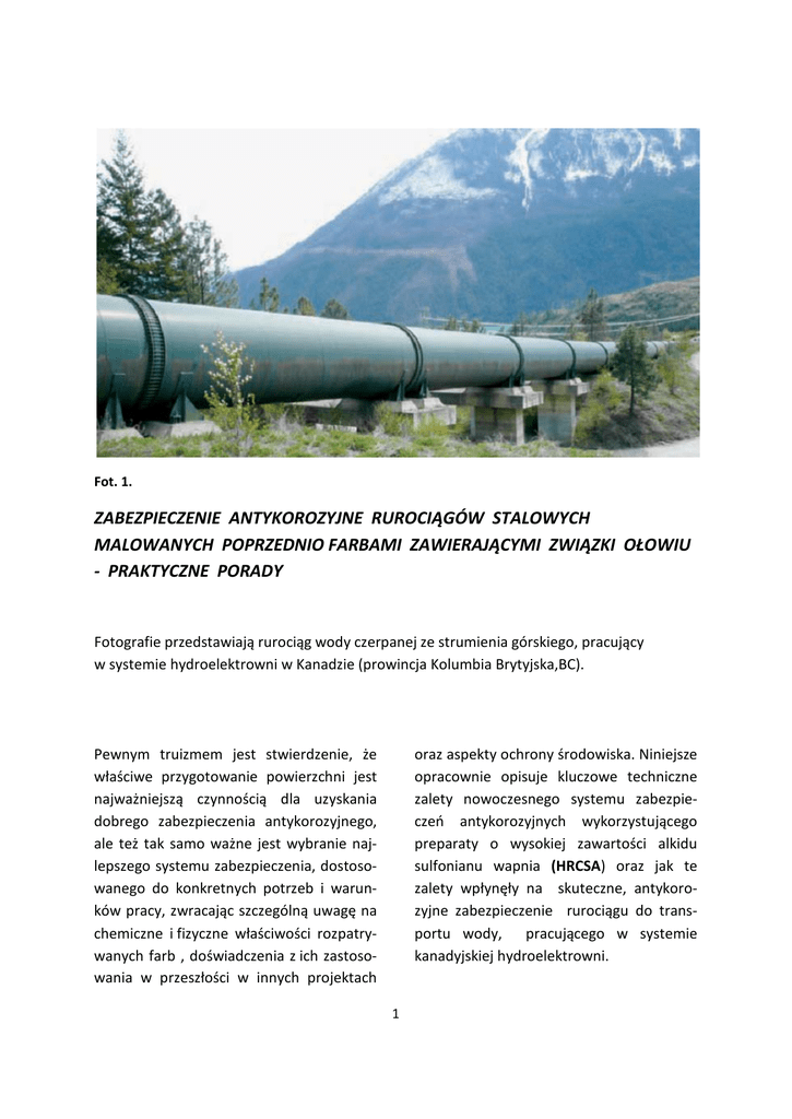 Fot. 1. ZABEZPIECZENIE ANTYKOROZYJNE RUROCIĄGÓW STALOWYCH MALOWANYCH POPRZEDNIO FARBAMI ZAWIERAJĄCYMI ZWIĄZKI OŁOWIU - PRAKTYCZNE PORADY Fotografie przedstawiają rurociąg wody czerpanej ze strumienia górskiego, pracujący w systemie hydroelektrowni w Kanadzie (prowincja Kolumbia Brytyjska,BC). Pewnym truizmem jest stwierdzenie, że właściwe przygotowanie powierzchni jest najważniejszą czynnością dla uzyskania dobrego zabezpieczenia antykorozyjnego, ale też tak samo ważne jest wybranie najlepszego systemu zabezpieczenia, dostosowanego do konkretnych potrzeb i warunków pracy, zwracając szczególną uwagę na chemiczne i fizyczne właściwości rozpatrywanych farb , doświadczenia z ich zastosowania w przeszłości w innych projektach oraz aspekty ochrony środowiska. Niniejsze opracownie opisuje kluczowe techniczne zalety nowoczesnego systemu zabezpieczeń antykorozyjnych wykorzystującego preparaty o wysokiej zawartości alkidu sulfonianu wapnia (HRCSA) oraz jak te zalety wpłynęły na skuteczne, antykorozyjne zabezpieczenie rurociągu do transportu wody, pracującego w systemie kanadyjskiej hydroelektrowni. 1 Zazwyczaj zaleca się całkowite usuwanie starych powłok, ale możliwe jest również wybiórcze czyszczenie powierzchni, usuwa się tylko te fragmenty starych powłok, które są znieszczone - nazywa się to czyszczeniem strefowym. Dotychczas, opisywany system TR jest powszechnie znany z zastosowań do zabezpieczeń antykorozyjnych mostów o konstrukcji stalowej. Stosuje się go w pełnym zakresie, z pełnym oczyszczeniem całych powierzchni i całkowitym pokryciem nową, jednolitą powłoką. Technologia pozwala pozostawić nieoczyszczone miejsca pokryte starymi powłokami. Gdy nie poddają się czyszczeniu wysokociśnieniową myjką wodną, pozwala traktować je jako pełnocenną warstwę podkładową (przyczepność do podłoża po takim myciu daje dostateczną gwarancję). Dla osiągnięcia sukcesu podczas planowania i wykonania zabezpieczenia antykorozyjnego należy spełnić następujące wymagania: - staranne wybrać system zabezpieczenia, zwracając szczególną uwagę na jego skuteczność w ekstremalnych warunkach użytkowania. - przewidzieć konieczność jego stosowania w czasie zimnych pór roku (jeśli taka może wystąpić) ze względu na możliwe utrudnienia w aplikacji preparatów - przeprowadzić rygorystyczną inspekcję planowanej do zabezpieczenia konstrukcji przed przystąpieniem do prac - przygotować dokładną instrukcję dla każdego etapu planowanych prac - stosować rygorystyczny nadzór każdego etapu wykonywanych prac Opisany jest tu konkretny przypadek, w którym system TR poradził sobie doskonale z zatrzymaniem korozji szczelinowej i wżerowej. Ze względu na prawie natychmiastowe gruntowanie oczyszczonych, zdegradowanych miejsc, system ten określany jest przez specjalistów „z branży” jako system kompaktowy. Jego ważną zaletą jest zdolność pokrywania pozostałości starych powłok z zawartością związków ołowiu, co przy bezołowiowym składzie preparatów, wchodzących w jego skład pozwala osiągnąć bezołowiową, finalną powłokę. Dla osiągnięcia oczekiwanych, pozytywnych rezultatów należy dokładnie przestrzegać procedur związanych z przeprowadzeniem każdego etapu prac i wykonywać je pod ciągłym , restrykcyjnym nadzorem. System TR już na etapie przygotowania powierzchni wyraźnie pokazuje swoje zalety: - koszty przygotowania powierzchni są wyraźnie mniejsze niż w przypadku stosowania innych technologii stosowanie wysokociśnieniowego mycia gorącą wodą zamiast piaskowania - wymogi związane z zachowaniem bezpieczeństwa pracy są mniej rygorystyczne - zmniejszona ilość odpadów do usunięcia, przy jednoczesnej redukcji ich szkodliwości (woda zamiast piaskowania) Wszystkie te argumenty przemawiają na rzecz wyboru technologii TR dla renowacji rurociągów pokrywanych poprzednio farbami z zawartością ołowiu. Argumenty te pozostają aktualne również w przypadku zabezpieczania nowych instalacji. 2 Tab. 1. Cechy wspomagające optymalne funkcjonowanie systemu TR. • • • • • • • • • • • • • • • • • • • • • szeroka kompatybilność z wszelkimi innymi rodzajami pokryć (szczególnie alkidowymi) łatwe pokrywanie powierzchni czyszczonych ręcznie, narzędziami mechanicznymi oraz wodą pod wysokim ciśnieniem udowodniona długotrwała elastyczność powłok ciągła chemiczna aktywność powłok doskonała penetracja wwszelkich szczelin, ubytków i peknięć konstrukcji wprowadzanie inhibitorów korozji w trudno dostępne miejsca struktury stalowej zdolność odblokowywania (uwalniania) zablokowanych korozją łożysk penetrant posiada wystarczająco wysokie ph aby zneutralizować kwasowość w skupiskach korozji duża zdolność penetranta do nawilżania, duża przyczepność i zdolność do głębokoiego wnikania w kapilarne szczeliny (niska lepkość) wysoka zawartość części stałych, jeśli trzeba nawet do 100% (brak rozpuszczalnika); ważne przy nanoszeniu na wszelkie krawędzie,również te z pozostałością starych powłok zdolność do tworzenia bariery przed dalszą korozją ( w innych systemach np. epoxydowych po względnie krótkim czasie powłoki odstają od podłoża pozorując zabezpieczenie, a pod nimi ma miejsce przyspieszona korozja) brak lub bardzo niska kurczliwość podczas sieciowania (wysychania) elastyczność powłok niska temperatura sieciowania łatwy sposób nanoszenia (pędzle, wałki, natrysk) powłoki penetranta jak i pokrycia końcowego pozostają mokre przez przedłużony czas zanim usieciują się zdolność wypierania wody ze szczelin lub częściowej z nią reakcji (staranie dobrany współczynnik sieciowania) minimalne naprężenia na granicy warstw (ważne przy pokrywaniu starych powłok) ciągłe inhibitowanie korozji odporność na promieniowanie UV samoistna biodegradowalność – system przyjazny dla natural