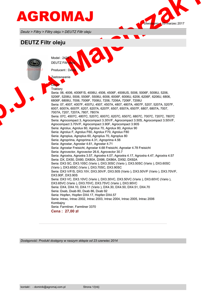 i k a z r h Utworzono : 03 marzec 2017 c j a Deutz > Filtry > Filtry oleju > DEUTZ Filtr oleju DEUTZ Filtr oleju M . Model : 2435 DEUTZ Filtr oleju Producent : Deutz A . Zastosowanie J . p Deutz Traktory Seria: 06, 4006, 4006F/S, 4006U, 4506, 4506F, 4506US, 5006, 5006F, 5006U, 5206, 5206F, 5206U, 5506, 5506F, 5506U, 6006, 6006F, 6006U, 6206, 6206F, 6206U, 6806, 6806F, 6806U, 7006, 7006F, 7006U, 7206, 7206A, 7206F, 7206U Seria: 07, 4007, 4007F, 4007U, 4507, 4507A, 4807, 4807A, 4807F, 5207, 5207A, 5207F, 6007, 6007A, 6007F, 6207, 6207A, 6207F, 6507, 6507A, 6507F, 6807, 6807A, 7007, 7007A, 7207, 7207A, 7807, 7807A Seria: 07C, 4507C, 4807C, 5207C, 6007C, 6207C, 6507C, 6807C, 7007C, 7207C, 7807C Seria: Agrocompact 3, Agrocompact 3.30V/F, Agrocompact 3.50S, Agrocompact 3.50V/F, Agrocompact 3.70V/F, Agrocompact 3.90F, Agrocompact 3.90S Seria: Agrolux, Agrolux 60, Agrolux 70, Agrolux 80, Agrolux 90 Seria: Agrolux F, Agrolux F60, Agrolux F70, Agrolux F80 Seria: Agroplus, Agroplus 60, Agroplus 70, Agroplus 80 Seria: Agroprima, Agroprima 4.31, Agroprima 4.56 Seria: Agrostar, Agrostar 4.61, Agrostar 4.71 Seria: Agrostar Freisicht, Agrostar 4.68 Freisicht, Agrostar 4.78 Freisicht Seria: Agrovector, Agrovector 26.6, Agrovector 30.7 Seria: Agroxtra, Agroxtra 3.57, Agroxtra 4.07, Agroxtra 4.17, Agroxtra 4.47, Agroxtra 4.57 Seria: DX, DX50, DX80, DX80A, DX86, DX86A, DX92, DX92A Seria: DX3 SC, DX3.10SC (Vario ), DX3.30SC (Vario ), DX3.50SC (Vario ), DX3.60SC (Vario ), DX3.65SC (Vario ), DX3.70SC, DX3.90SC Seria: DX3 V/F/S, DX3.10V, DX3.30V/F, DX3.50S (Vario ), DX3.50V/F (Vario ), DX3.70V/F, DX3.90F, DX3.90S Seria: DX3 VC, DX3.10VC (Vario ), DX3.30VC, DX3.50VC (Vario ), DX3.60VC (Vario ), DX3.65VC (Vario ), DX3.70VC, DX3.75VC (Vario ), DX3.90VC Seria: DX4, DX4.10, DX4.11 (Vario ), DX4.30, DX4.50, DX4.51, DX4.70 Seria: Dxab, Dxab 80, Dxab 86, Dxab 92 Seria: Hopfen, Hopfen DX4.17, Hopfen DX4.57 Seria: Intrac, Intrac 2002, Intrac 2003, Intrac 2004, Intrac 2005, Intrac 2006 Kombajny Seria: Farmliner, Farmliner 3370 Cena : 27,00 zł Dostępność: Produkt dostępny w naszym sklepie od 23 czerwiec 2014 kontakt : - [email protected] Strona 1/{nb}