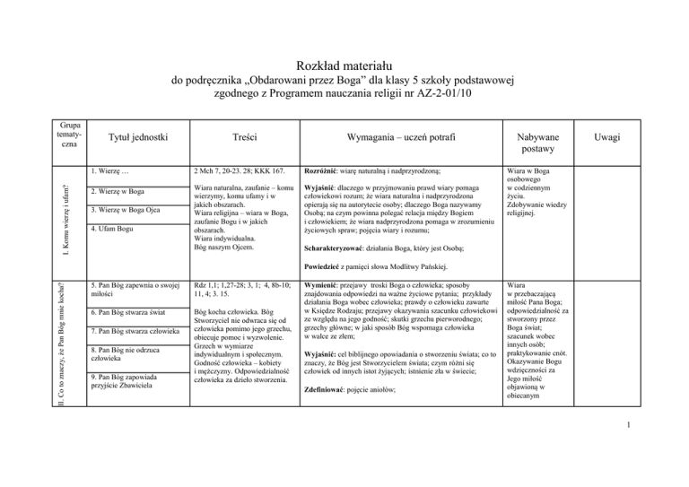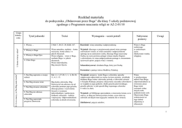 Rozkład materiału do podręcznika „Obdarowani przez Boga” dla klasy 5 szkoły podstawowej zgodnego z Programem nauczania religii nr AZ-2-01/10 I. Komu wierzę i ufam? Grupa tematyczna Tytuł jednostki Treści Wymagania – uczeń potrafi 1. Wierzę … 2 Mch 7, 20-23. 28; KKK 167. Rozróżnić: wiarę naturalną i nadprzyrodzoną; 2. Wierzę w Boga Wiara naturalna, zaufanie – komu wierzymy, komu ufamy i w jakich obszarach. Wiara religijna – wiara w Boga, zaufanie Bogu i w jakich obszarach. Wiara indywidualna. Bóg naszym Ojcem. Wyjaśnić: dlaczego w przyjmowaniu prawd wiary pomaga człowiekowi rozum; że wiara naturalna i nadprzyrodzona opierają się na autorytecie osoby; dlaczego Boga nazywamy Osobą; na czym powinna polegać relacja między Bogiem i człowiekiem; że wiara nadprzyrodzona pomaga w zrozumieniu życiowych spraw; pojęcia wiary i rozumu; 3. Wierzę w Boga Ojca 4. Ufam Bogu Nabywane postawy Uwagi Wiara w Boga osobowego w codziennym życiu. Zdobywanie wiedzy religijnej. Scharakteryzować: działania Boga, który jest Osobą; II. Co to znaczy, że Pan Bóg mnie kocha? Powiedzieć z pamięci słowa Modlitwy Pańskiej. 5. Pan Bóg zapewnia o swojej miłości Rdz 1,1; 1,27-28; 3, 1; 4, 8b-10; 11, 4; 3. 15. 6. Pan Bóg stwarza świat Bóg kocha człowieka. Bóg Stworzyciel nie odwraca się od człowieka pomimo jego grzechu, obiecuje pomoc i wyzwolenie. Grzech w wymiarze indywidualnym i społecznym. Godność człowieka – kobiety i mężczyzny. Odpowiedzialność człowieka za dzieło stworzenia. 7. Pan Bóg stwarza człowieka 8. Pan Bóg nie odrzuca człowieka 9. Pan Bóg zapowiada przyjście Zbawiciela Wymienić: przejawy troski Boga o człowieka; sposoby znajdowania odpowiedzi na ważne życiowe pytania; przykłady działania Boga wobec człowieka; prawdy o człowieku zawarte w Księdze Rodzaju; przejawy okazywania szacunku człowiekowi ze względu na jego godność; skutki grzechu pierworodnego; grzechy główne; w jaki sposób Bóg wspomaga człowieka w walce ze złem; Wyjaśnić: cel biblijnego opowiadania o stworzeniu świata; co to znaczy, że Bóg jest Stworzycielem świata; czym różni się człowiek od innych istot żyjących; istnienie zła w świecie; Zdefiniować: pojęcie aniołów; Wiara w przebaczającą miłość Pana Boga; odpowiedzialność za stworzony przez Boga świat; szacunek wobec innych osób; praktykowanie cnót. Okazywanie Bogu wdzięczności za Jego miłość objawioną w obiecanym 1 Zinterpretować: biblijne opowiadanie o grzechu pierwszych ludzi; treść protoewangelii. III. Dlaczego wierzę i ufam Panu Bogu? 10. Pan Bóg ratuje 11. Pan Bóg zapewnia o swej przyjaźni Rdz 6, 9-12; 7, 1; Rdz 12, 1-3; Rdz 28, 10-15; Rdz 45, 3-8; Wj 14, 15-18. 31. Opowiedzieć: historię Noego, Abrahama, Józefa Egipskiego, Mojżesza. Wyjaśnić: biblijne obrazy (potop, drabina, aniołowie z opowiadania o Jakubie, Józef Egipski, wyprowadzenie Izraelitów z niewoli egipskiej); w jaki sposób Bóg w Jezusie Chrystusie wypełnia obietnice zbawienia; związek pomiędzy sakramentem chrztu i przymierzem Boga z ludźmi; dlaczego Abrahama nazywamy ojcem wiary; pojęcie opatrzności Bożej; Stare Przymierze – Nowe Przymierze; czemu służyły słowa i czyny Jezusa; związek sakramentów z paschą Jezusa; 15. Pan Bóg wyzwala Postaci biblijne (Noe, Abraham, Jakub, Józef, Mojżesz) obrazem obecności i opieki Boga. Przymierza wyrazem działania Pana Boga. Nowe Przymierze uobecniane w liturgii i sakramentach. Człowiek wierzący odpowiada na zaproszenie do życia we wspólnocie z Bogiem i ludźmi. Chrystus Zmartwychwstały przez sakramenty Kościoła prowadzi ludzi. Nowe Przymierze wypełnieniem Bożych obietnic i ratunkiem dla człowieka. 16. Przyjmuję Boże wskazania Pwt 5, 1-22; 30, 15-20. Wymienić: przykazania Dekalogu; 17. Jestem Bogu posłuszny Troska Pana Boga o człowieka; obecność Pana Boga w historii ludzkości; Pan Bóg pragnie zbawienia wszystkich ludzi; Pan Bóg powierza ludziom prawo przymierza – dekalog; Stare i Nowe Przymierze; Nowe Przymierze w Jezusie Chrystusie wypełnieniem Bożych obietnic; zapowiedzi prorockie odnoszące się do Mesjasza i ich miejsce w przeżywaniu roku liturgicznego Rozróżnić: przykazania, które odnoszą się do relacji człowieka z Bogiem, a które regulują zasady życia z ludźmi; 12. Pan Bóg błogosławi 13. Pan Bóg otacza opieką 14. Pan Bóg przeprowadza 18. Nie lękam się Bożych przykazań 19. Pragnę spotykać się z Bogiem Zbawicielu. Dochowanie wierności Bogu; okazywanie Bogu wiary i zaufania; wdzięczność za przymierze i chrzest. . Wymienić: przyczyny biblijnego potopu. Uzasadnić: że Dekalog jest wyrazem miłości Boga o człowieka; że na chrzcie świętym zostaliśmy wezwani do życia w świętości; że Pan Bóg wypełnia obietnicę zawarcia nowego przymierza; Wyjaśnić: na czym polega świętość; znaczenie adwentu; pojęcie paruzji; Okazywanie Bogu wdzięczności za Jego troskę o człowieka wyrażoną w Dekalogu. Gotowość dążenia świętości; zaufanie i wierność Bogu; odpowiedzialność za kształtowanie własnego sumienia. Scharakteryzować: sposoby dochowywania wierności Bogu; 2 IV. Jak okażę Panu Bogu, że Go kocham? V. Dlaczego Pan Bóg posyła swojego Syna? 20. Jezus spełnia Boże obietnice 21.Pan Jezus prowadzi do Boga Ojca 22. Pan Jezus staje się człowiekiem 23. Pan Jezus przynosi zbawienie 24. Pan Jezus jest prawdziwym Bogiem i prawdziwym człowiekiem 25. Pan Jezus jest światłem na drodze do Ojca (adwent – początek roku liturgicznego). znaki i symbole adwentowe. Mt 1, 18-24. Wymienić: imiona proroków zapowiadających przyjście Mesjasza; znaki potwierdzające mesjańską godność Jezusa; warunki konieczne do przyjęcia Mesjasza; chrześcijańskie i pozachrześcijańskie świadectwa o Jezusie; Przyjście Jezusa spełnieniem ludzkich oczekiwań i pragnień; Emanuel – Bóg z nami; Jezus postacią historyczną; biblijne i pozabiblijne źródła wiedzy o Jez