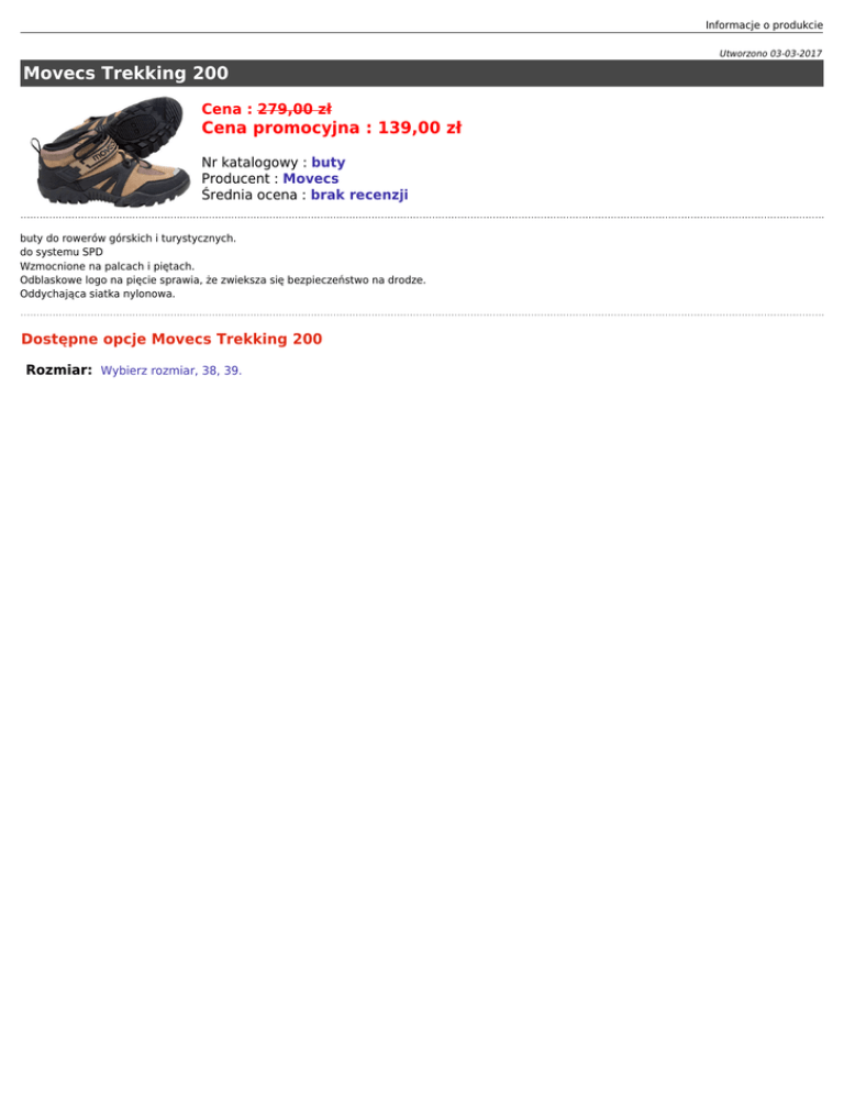 Informacje o produkcie Utworzono 03-03-2017 Movecs Trekking 200 Cena : 279,00 zł Cena promocyjna : 139,00 zł Nr katalogowy : buty Producent : Movecs Średnia ocena : brak recenzji buty do rowerów górskich i turystycznych. do systemu SPD Wzmocnione na palcach i piętach. Odblaskowe logo na pięcie sprawia, że zwieksza się bezpieczeństwo na drodze. Oddychająca siatka nylonowa. Dostępne opcje Movecs Trekking 200 Rozmiar: Wybierz rozmiar, 38, 39.