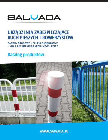 URZĄDZENIA ZABEZPIECZAJĄCE RUCH PIESZYCH I ROWERZYSTÓW BARIERY DROGOWE • SŁUPKI CHODNIKOWE • MAŁA ARCHITEKTURA MIEJSKA TYPU RETRO Katalog produktów www.salvada.pl DROGOWE BARIERY OCHRONNE SŁUPKI CHODNIKOWE BLOKUJĄCE MAŁA ARCHITEKTURA MIEJSKA TYP RETRO INNE PRODUKTY Z OBSZARU DROGOWEGO 4 14 Kompleksowa oferta firmy SALVADA w zakresie barier chodnikowych oraz słupków blokujących pozwala na zaspokojenie potrzeb najbardziej wymagających klientów. Posiadamy duże doświadczenie produkcyjne, wykwalifikowaną kadrę i z sukcesem współpracujemy z krajowymi i zagranicznymi kontrahentami. Jesteśmy w stanie podjąć się realizacji nietypowych 18 zleceń produkcyjnych. Udzielamy wszelkich informacji związanych bezpośrednio z naszymi produktami oraz oferujemy fachową pomoc przy ich wyborze, zakupie oraz montażu. 26 Dzięki stałemu utrzymywaniu odpowiednio wysokich stanów magazynowych oraz doskonale zorganizowanej logistyce, nasze produkty dostarczamy na terenie całej Polski oraz Europy w atrakcyjnych terminach przy zachowaniu konkurencyjnych poziomów cenowych. SALVADA Kokoszyński Garncarz s.c. PRZECŁAW 81A/4 72-005 PRZECŁAW +48 694 288 261 +48 793 403 823 [email protected] www.salvada.pl 2 SZYBKA DOSTAWA na terenie całej Polski REALIZUJEMY NIESTANDARDOWE ZLECENIA PRODUKCYJNE! Jeżeli w naszej standardowej ofercie zabrakło produktu odpowiadającego Państwa potrzebom, prosimy o kontakt, abyśmy mogli przygotować spersonalizowaną ofertę i wycenę dopasowaną do Państwa oczekiwań. KOMPLEKSOWOŚĆ WYSOKA JAKOŚĆ ATRAKCYJNA CENA 3 3 DROGOWE BARIERY OCHRONNE URZĄDZENIA ZABEZPIECZAJĄCE RUCH PIESZYCH I ROWERZYSTÓW Bariery chodnikowe i słupki blokujące stosuje się w celu wyeliminowania lub ograniczenia niebezpieczeństw, na jakie jest narażony pieszy lub rowerzysta korzystający z drogi i obiektów przy niej położonych (np. chodniki, ścieżki rowerowe). Bariera rurowa U12a z poprzeczką Bariera rurowa U12a z poprzeczką (barierka rurowa typu trzepak, bariera wygrodzeniowa z poprzeczką, bariera segmentowa U12a ) - to prosta w montażu, bardzo trwała i praktyczna bariera ochronna o estetycznym wyglądzie stosowana przede wszystkim ze względów bezpieczeństwa w miejscach, gdzie wskazane jest odgrodzenie od siebie obszarów o różnym przeznaczeniu np. chodnika dla pieszych i jezdni czy terenów zielonych i parkingów. Rurowa bariera chodnikowa U12a z poprzeczką zbudowana jest z ocynkowanej rury stalowej, do której dołączona jest pozioma poprzeczka. Dane techniczne: Długość 1500 mm lub 2000 mm Wysokość 1500-1600 mm (nad gruntem 1100 mm) Rura nośna stal Ø 48,3 mm ze ścianką o grubości 2 mm lub Ø 60,3/2 mm Rura poprzeczna stal Ø 48,3/2 mm lub Ø 60,3/2 mm lub Ø 40/2 mm Zabezpieczenie ocynk + malowanie proszkowe na dowolny kolor z palety RAL Sposób montażu betonowanie w gruncie (opcjonalnie – przykręcanie do podłoża) Inne wymiary na zamówienie indywidualne 4 DROGOWE BARIERY OCHRONNE Bariera U12a z poprzeczką z pasami z folii odblaskowej I lub II generacji Bariera biało-czerwona (RAL 9003 + pasy z folii odblaskowej) - dł. 1,5 m lub 2 m Bariera żółto-czarna (RAL 1003 + pasy z folii odblaskowej) - dł. 1,5 m lub 2 m Bariera rurowa U12a z poprzeczką wersja ocynkowana ogniowo wg normy EN ISO 1461. Nie wymaga dodatkowego zabezpieczenia w postaci malowania proszkowego Certyfikaty i deklaracje zgodności dostępne dla każdego produktu. Bariera rurowa U12a wersja z dwoma poprzeczkami Dane techniczne: Długość 1500 mm lub 2000 mm Wysokość 1500-1600 mm (nad gruntem 1100 mm) Rura nośna stal Ø 48,3 mm ze ścianką o grubości 2 mm lub Ø 60,3/2 mm Rury poprzeczne stal Ø 48,3/2 mm lub Ø 60,3/2 mm lub Ø 40/2 mm Zabezpieczenie ocynk + malowanie proszkowe na dowolny kolor z palety RAL Sposób montażu betonowanie w gruncie (opcjonalnie – przykręcanie do podłoża) Inne wymiary na zamówienie indywidualne 5 5 DROGOWE BARIERY OCHRONNE Bariera rurowa U12a typ olsztyński Bariera rurowa U12a typu olsztyńskiego jest stosowana w podobnych miejscach jak bariera U12a z poprzeczką. Spełnia te same funkcje zabezpieczające. Barierka U12a typu olsztyńskiego zbudowana jest ze słupka z ocynkowanej rury stalowej, do którego dołączone jest owalne przęsło o wysokości 550 mm. Górna krawędź bocznego słupka posiada specjalną nakładkę, która nie pozwala gromadzić się wodzie wywołującej korozję. Przy konfiguracji ilości barier montowanych w jednym ciągu należy uwzględnić dodatkowy słupek kończący, który zamyka ciąg montażowy (ilość barier + 1 słupek). W przypadku montażu barier w kilku odcinkach, do każdego ciągu należy uwzględnić dodatkowy słupek kończący. Dane techniczne Długość 1500 mm lub 2000 mm Wysokość 1500-1600 mm (nad gruntem 1100 mm) Słupek stal Ø 48,3 mm ze ścianką o grubości 2 mm lub Ø 60,3/2 mm Owalne przęsło stal Ø 48,3/2 mm lub Ø 60,3/2 mm lub Ø 40/2 mm Zabezpieczenie ocynk + malowanie proszkowe na dowolny kolor z palety RAL Sposób montażu betonowanie w gruncie (opcjonalnie –przykręcanie do podłoża) Inne wymiary na zamówienie indywidualne Akcesoria montażowe do barier typu olsztyńskiego Akcesoria montażowe służą do łączenia słupków z owalnymi przęsłami. Składają się na nie gwintowane pręty M10 o długości 1000 mm (do cięcia przy montażu) lub śruby M10 oraz nakrętki i podkładki (ocynk galwaniczny, ogniowy lub stal nierdzewna A2). 6 DROGOWE BARIERY OCHRONNE Bariera U12a typ olsztyński z pasami z folii odblaskowej I lub II generacji Bariera biało-czerwona (RAL 9003 + pasy z folii odblaskowej) – dł. 1,5 m lub 2 m Bariera żółto-czarna (RAL 1003 + pasy z folii odblaskowej) – dł. 1,5 m lub 2 m Bariera U12a typ olsztyński – wersja ocynkowana ogniowo wg normy EN ISO 1461. Nie wymaga dodatkowego zabezpieczenia w postaci malowania proszkowego. Certyfikaty i deklaracje zgodności dostępne dla każdego produktu. Bariera rurowa U12a wersja do przyk