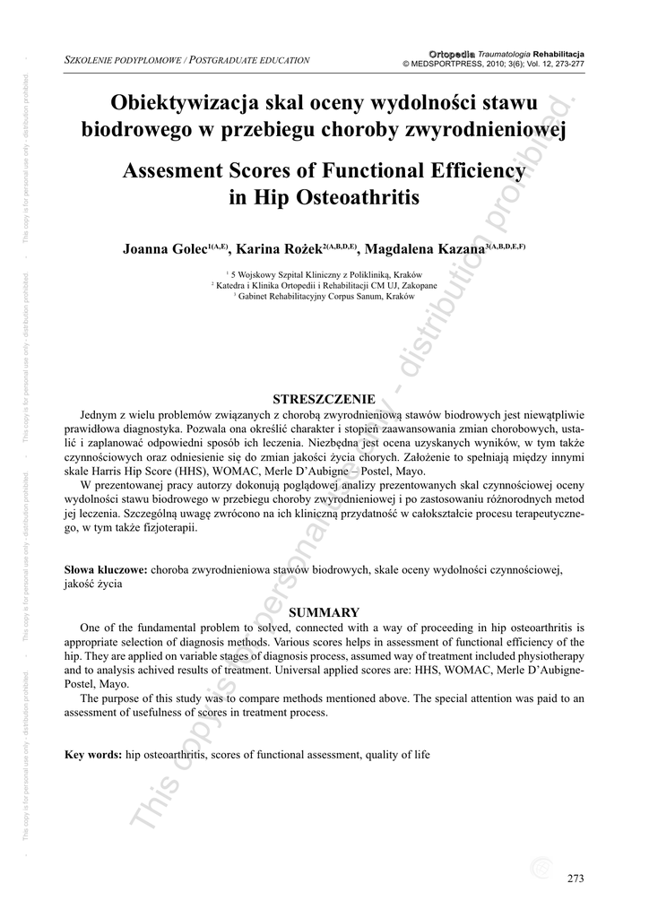 ed . tio np roh ibit Assesment Scores of Functional Efficiency in Hip Osteoathritis Joanna Golec1(A,E), Karina Rożek2(A,B,D,E), Magdalena Kazana3(A,B,D,E,F) 1 5 Wojskowy Szpital Kliniczny z Polikliniką, Kraków Katedra i Klinika Ortopedii i Rehabilitacji CM UJ, Zakopane 3 Gabinet Rehabilitacyjny Corpus Sanum, Kraków ly - dis tr ibu 2 STRESZCZEnIE rso na lu se on Jednym z wielu problemów związanych z chorobą zwyrodnieniową stawów biodrowych jest niewątpliwie prawidłowa diagnostyka. Pozwala ona określić charakter i stopień zaawansowania zmian chorobowych, ustalić i zaplanować odpowiedni sposób ich leczenia. Niezbędna jest ocena uzyskanych wyników, w tym także czynnościowych oraz odniesienie się do zmian jakości życia chorych. Założenie to spełniają między innymi skale Harris Hip Score (HHS), WOMAC, Merle D’Aubigne – Postel, Mayo. W prezentowanej pracy autorzy dokonują poglądowej analizy prezentowanych skal czynnościowej oceny wydolności stawu biodrowego w przebiegu choroby zwyrodnieniowej i po zastosowaniu różnorodnych metod jej leczenia. Szczególną uwagę zwrócono na ich kliniczną przydatność w całokształcie procesu terapeutycznego, w tym także fizjoterapii. pe Słowa kluczowe: choroba zwyrodnieniowa stawów biodrowych, skale oceny wydolności czynnościowej, jakość życia SUMMARY op y is for One of the fundamental problem to solved, connected with a way of proceeding in hip osteoarthritis is appropriate selection of diagnosis methods. Various scores helps in assessment of functional efficiency of the hip. They are applied on variable stages of diagnosis process, assumed way of treatment included physiotherapy and to analysis achived results of treatment. Universal applied scores are: HHS, WOMAC, Merle D’AubignePostel, Mayo. The purpose of this study was to compare methods mentioned above. The special attention was paid to an assessment of usefulness of scores in treatment process. is c Key words: hip osteoarthritis, scores of functional assessment, quality of life Th This copy is for personal use only - distribution prohibited. This copy is for personal use only - distribution prohibited. This copy is for personal use only - distribution prohibited. - Obiektywizacja skal oceny wydolności stawu biodrowego w przebiegu choroby zwyrodnieniowej - This copy is for personal use only - distribution prohibited. O r t o p e d i a Traumatologia Rehabilitacja © MEDSPORTPRESS, 2010; 3(6); Vol. 12, 273-277 SZKOLENIE PODYPLOMOWE / POSTGRADUATE EDUCATION 273 se on ly - dis tr ibu tio np roh ibit ed . przez jednostkę jej pozycji życiowej w kontekście kultury i systemu wartości ją otaczających w relacji do jej celów, oczekiwań i standardów [7]. Wg Wells’a jakość życia to subiektywna percepcja dobrego samopoczucia, satysfakcja z życia i codziennego funkcjonowania [8]. U osób z chorobą zwyrodnieniową stawów biodrowych ujawniają się z czasem mechanizmy, które powodują wyraźne obniżenie jakości ich życia. Przyjmują one postać zaburzeń fizjologicznych, psychologicznych i społecznych [9]. Do niedawna choroba zwyrodnieniowa uznawana była za jeden z objawów „starzenia się” tkanek, jednak ciężki i przewlekły jej przebieg, znaczący odsetek występowania w poszczególnych populacjach oraz wysokie koszty leczenia sprawiły, że stale pozostaje w sferze zainteresowania środowiska ortopedów, traumatologów i fizjoterapeutów. Przejawem takiego stanu rzeczy jest także przyjęcie przez ONZ lat 2000-2009 „Dekadą Kości i Stawów”, a także uznanie choroby zwyrodnieniowej stawów chorobą cywilizacyjną [5]. Wzrastająca każdego roku liczba zachorowań oraz wykonywanych totalnych alloplastyk stawu biodrowego zmuszają do poszukiwania stale nowych rozwiązań zwłaszcza operacyjnych w leczeniu zmian zwyrodnieniowych stawu biodrowego. Niewątpliwy postęp w tym zakresie oraz względy ekonomiczne warunkują konieczność obiektywnego monitorowania oraz oceny skuteczności postępowania w tych sytuacjach. Celem podejmowanego leczenia jest przede wszystkim zmniejszenie dolegliwości bólowych oraz optymalna poprawa funkcji stawu. Nie tylko zatem dokładna ocena kliniczna – badanie przedmiotowe, podmiotowe i obrazowe, ale również ocena subiektywna jest niezastąpiona na każdym etapie leczenia. Istotne jest aby skale, kwestionariusze i klasyfikacje opisujące stan kliniczny stawu biodrowego odzwierciedlały jego faktyczny stan funkcjonalny. Zdarza się bowiem tak, że prawidłowy zakres ruchomości stawu biodrowego współistnieje z określonymi trudnościami podczas wykonywania czynności dnia codziennego jak zakładanie butów, skarpetek czy też samoobsługowych. Ocena czynnościowa stawu biodrowego dokonywana przez samego pacjenta w połączeniu z oceną kliniczną, daje w sumie pełny obraz jego funkcji i powinna być w szerszym stopniu brana pod uwagę przy analizowaniu uzyskanych wyników leczenia. for pe rso na lu Według definicji podanej w 1995 roku przez Keuttnera i Goldberga choroba zwyrodnieniowa to wynik zarówno biologicznych, jak i mechanicznych zdarzeń, które destabilizują powiązane ze sobą procesy degradacji i syntezy chrząstki stawowej, w tym chondrocytów i macierzy pozakomórkowej oraz warstwy podchrzęstnej kości [1]. Proces ten zapoczątkowany jest zwykle przez różnorodne czynniki. Przejawia się morfologicznymi, biochemicznymi, molekularnymi i biomechanicznymi zmianami komórek macierzy, które prowadzą do rozmiękania i włókienkowatości z utratą masy chrząstki stawowej, sklerotyzacji tkanki kostnej oraz rozwoju osteofitów i torbieli w warstwie podchrzęstnej. Choroba zwyrodnieniowa stawu biodrowego w początkowym okresie manifestuje się przede wszystkim dolegliwościami bólowymi w pachwinie, związanymi z narastającym przykurczem torebki stawowej oraz ograniczeniem ruchomości rotacyjnej, zwłaszcza rotacji do wewnątrz. Z biegiem czasu narastająca degradacja stawu i tkanek oko