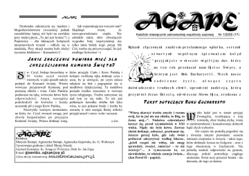 ® AGAPE Dyskoteka zakończyła się Apelem i błogosławieństwem (wcześniej jednak zaszaleliśmy lepiej, niż byki na corridzie przy tradycyjnym „To już jest koniec”) ;) Poprawiny – dla łaknących kolejnych niesamowitych wrażeń – odbyły się w niedzielę. Przy okazji można było złożyć życzenia Jubilatowi – Konradowi C. Jak wspominają ten wieczór inni? Skądinąd wiem, że niewypowiedzianie ciepło. Nie zabrakło także słów chwalących wygodne buty (najwyraźniej nie tylko mnie bolały nogi- przyp. M) Cóż, trzeba się przyzwyczajać, bo już niedługo Sylwester =) JAKIE ZNACZENIE POWINNA MIEĆ DLA CHRZEŚCIJANINA KOMUNIA ŚWIĘTA? w. Cyryl, biskup Jerozolimy w IV wieku uczył swoich wiernych, w jaki sposób należy podejść do Komunii świętej. Wierni wówczas przyjmowali Komunię pod postacią chleba i wina. Ciało Pańskie podawano na rękę, wówczas łatwo było odpowiedzieć: Amen, następnie podchodzili do kielicha i każdy uczestnik pił z niego Krew Pańską. Niezwykle ważnym momentem, na który św. Cyryl zwracał uwagę, jest chwila bezpośrednio po przyjęciu Komunii świętej. Poleca dotknąć warg, które przyjęły Ciało i Krew Pańską i kolejno zwilżoną ręką dotknąć oczu i uszu, by je uświęcić, po czym zaleca odejście na bok i pogrążenie się w modlitwie dziękczynnej. Ta modlitwa posiada wielkie znaczenie w rozwoju życia religijnego. Trzeba zatrzymać się nad tym co się stało. To nie jest połknięcie kawałka chleba lub łyku wina, to jest pokarm boski i trzeba by zawartą w nim energię Bożej miłości przyjął umysł i serce, wola i uczucia. c.d.n. Marysia Stempi, Agnieszka Stempi, Agnieszka Gajewska, ks. G. Wołoszyn Katolicki miesięcznik ostrowieckiej wspólnoty oazowej Nr 1/2005 (17) Rękami z łąc z onymi z naki e m pr z e łamane go opłat ka , s e r c ami o t wa r t y mi ws p ó l n y m ś p i e wa n i e m ko l ę d pr z yj mi j c i e w wi e c z ór wi gi l i j ny dar , kt ór y na t e n r ok pr z e kaz ał nam Oj c i e c Świ ęt y , a kt ór ym j e s t Rok Euc har ys t i i . Ni e c h nas z e c o dz i e nne życi e, ni os ąc e częs t o doświ adc z e ni e t r udnyc h c hwi l , opr omi e ni nadz i e j ą , kt ór ą pr z yni ós ł Je z us Dz i e c i ę , od-wi e c z ne Słowo Oj c a , z r odz one z TEKST DOTYCZĄCY "Wiarą ukorzyć trzeba zmysły i rozum swój, bo tu już nie ma chleba, to Bóg, to Jezus mój...". Niełatwo człowiekowi korzyć się, przed czymkolwiek w XXI wieku. Nigdy nie było łatwo. Zawsze chciał dotknąć, zobaczyć, przekonać się. Jeszcze gorzej było, gdy cały świat próbował odczytywać według klucza:, „jeżeli czegoś nie widzę, nie mogę sprawdzić, zważyć, zmierzyć - to nie istnieje"... A tymczasem to, co niewidzialne, to właśnie esencja świata... (Jan Paweł II – papież). ROKU EUCHARYSTII ielu ludzi jest w stanie przyjąć Ewangelię, wynikającą z niej wzniosłą, choć trudną etykę, wiarę w nieśmiertelność i konsekwencje dobrych bądź złych wyborów. Ale często nie potrafią pogodzić się z dwiema innymi prawdami: sensem istnienia cierpienia w świecie - także tego, które dotknęło Jezusa na Golgocie - oraz z Jego obecnością w Eucharystii. Nie potrafią znaleźć odpowiedzi na pytanie, dlaczego miłość potrzebuje ciągłego umierania. Świat uczy przecież brania - nie dawania, do tego za darmo. AGAPE Eucharystia to Najtrudniejsza Obecność. To najpiękniejszy dar. "Kto spożywa moje ciało i pije moją krew, ma życie wieczne, a Ja go wskrzeszę w dniu ostatecznym" (J 6, 56). D l a c z e g o n i e r o z u mi e my t e j Obecności? Dlaczego tylu "staczy" i "kibiców" - do tego niemych - na niedzielnej Mszy św.? Co zagubili? - Zerwała się nić, która łączyła wiarę z życiem. Oba światy zaczęły dryfować oddzielnie, oddalać się od siebie. Msza Święta, zamiast być szczytem życia chrześcijańskiego, stała się nudną, straconą godziną. Dramatycznie zaczęło brakować świadomości, że pojęcia: wygrana - przegrana, w języku miłości niekoniecznie znaczą tyle samo, co w potocznym rozumowaniu. I że jest jedna największa Miłość, która kocha za darmo i chce być kochana. Do końca. Jeden z moich znajomych użył kiedyś bardzo trafnego porównania: Wyobraź sobie, że ktoś prowadzi cię do wielkiej hali. Pokazuje stertę kamieni i mówi: "To jest szczyt Mount Everestu. Dokładnie odtworzony widziałem na zdjęciach. Stań tu i poczuj się, jakbyś był na wierzchołku najwyższej góry świata!". I co? Stajesz na stercie kamieni, patrzysz pod nogi, w górę, na dach, ściany - dalej jesteś w hali i myślisz sobie: "Jakież to oszustwo, gdzież ta osławiona wolność? Czego zabrakło? - 8 km w dół i chmur pod stopami..." Mówi się, że Eucharystia to szczyt. Ale aby ją pojąć, trzeba całe swoje życie przemienić. Nie można wystraszyć się trudu wspinaczki, słuchania, tracenia siebie. Inaczej dalej będą ściany, stłamszona wolność i nuda. Nawet jeśli nauczysz się wszystkich dialogów, będziesz pięknie śpiewał - z pamięci! pieśni eucharystyczne, ale nie pojmiesz, że to twoja codzienność ma cię tutaj przyprowadzać, nic nie zrozumiesz... Bo Jezus nie przychodzi po to, aby było święto, ale po to, aby dać ci światło, moc przemiany, siłę do nadawania życiu sensu. Po to też Jan Paweł II ustanowił Rok Eucharystii, abyśmy tę prawdę głębiej zrozumieli. I nie zmarnowali szansy. Zapraszam wszystkich do podjęcia tego trudu. Zapraszam też do pochylania się nad Trudną Obecnością, szukania "chmur pod stopami" i wolności krzyża, która ciągle dopełnia się na ołtarzu Pana w czasie każdej Eucharystii. AGAPE „T O J U Ż J E S T udowna Oaza z nie-wielkiego, aczkolwiek prężnego dekanatu ostrowieckiego rozwija się szybciej niż akcja w serialu brazylijskim (względnie: włoskopotrugalsko-wietnamskim) – tak można krótko podsumować ostatnią większą imprezę, zorganizo