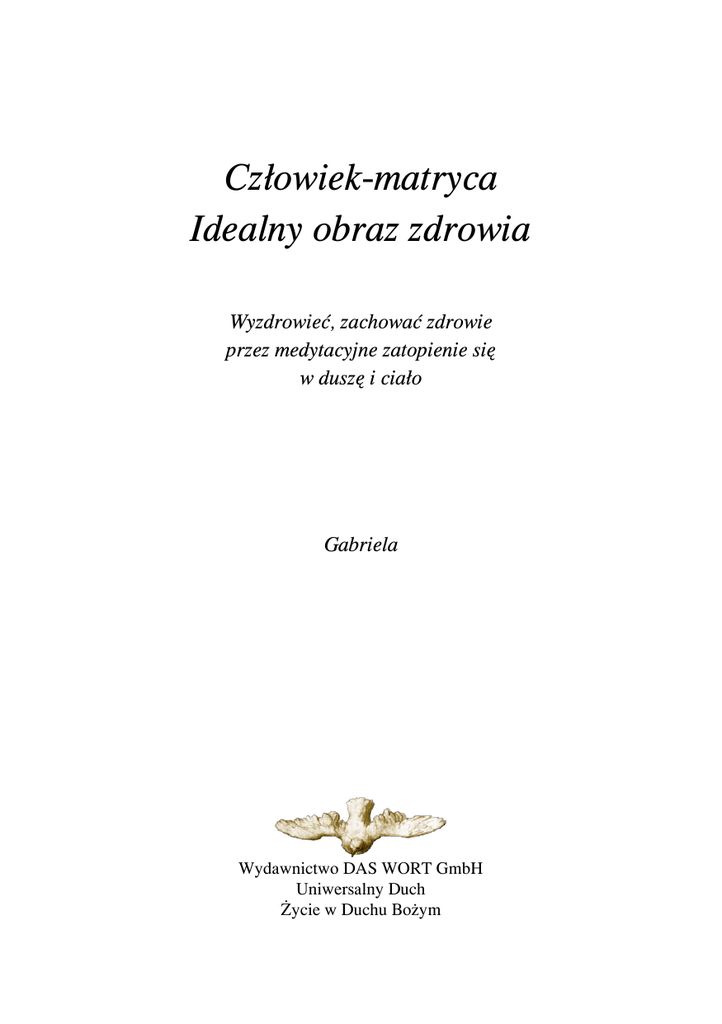 Człowiek-matryca Idealny obraz zdrowia Wyzdrowieć, zachować zdrowie przez medytacyjne zatopienie się w duszę i ciało Gabriela Wydawnictwo DAS WORT GmbH Uniwersalny Duch Życie w Duchu Bożym Wydanie licencyjne za zezwoleniem wydawnictwa Verlag DAS WORT GmbH Max-Braun-Strasse 2 D-97828 Marktheidenfeld-Altfeld Tytuł niemieckiego oryginału: „Der matrix-Mensch. Leitbild zur Gesundheit Mal anders Meditieren – aktiv Meditieren Mit Musik zur Meditation” S 335 pl Polnisch Stowarzyszenie dla Popierania Życia Uniwersalnego skr. poczt. 22, 00-952 Warszawa Wszystkie prawa zastrzeżone. W języku polskim książka nie została wydana 2 Wprowadzenie Medytować inaczej – medytować aktywnie. Pod tym hasłem w październiku 1999 r. została nagrana na kasetę i płytę kompaktową audycja Człowiek-matryca. Idealny obraz zdrowia. Znajdują się tam słowa z Miłości i Mądrości Boga, zaczerpnięte ze strumienia bytu przez Gabrielę, prorokinię i orędowniczkę Boga. Gabriela szczegółowo wyjaśnia duchowe zależności zachodzące między zamroczeniem duszy a zakłóceniem funkcji ludzkiego organizmu. Pokazuje inną, konkretną drogę, na której każdy, kto tylko tego pragnie, może się rozpoznać i usunąć ze swojej duszy negatywne zakodowania, uniemożliwiające rozświetlenie duszy, a zatem również uzdrowienie ciała. Kiedy bowiem dusza jest intensywniej zasilana ze źródła siły i życia, wtedy i ciało może odbierać uzdrawiające światło Boga. Medytacja Człowiek-matryca. Idealny obraz zdrowia pomogła już wielu ludziom w osiągnięciu lub zachowaniu duchowej stabilności i fizycznej sprawności. Ponadto pomogła im w wykorzystaniu cennych ziemskich dni, w duchu prawdziwej nauki Jezusa z Nazaretu, dla osiągnięcia pokoju, dynamiki i radości, a więc pozytywnej jakości życia. Dlatego na ogólne życzenie wydano teraz ten klejnot boskiej Mądrości w postaci książki. W trakcie aktywnej medytacji pomocne jest słuchanie dobrej, spokojnej muzyki, która może towarzyszyć kolejnym fazom uwewnętrznienia i samoobserwacji. W tym celu załączono do tej książki płytę kompaktową z odpowiednią muzyką. Pragniemy przyłączyć się do słów Gabrieli i życzyć wszystkim czytelnikom „wiele, wiele światła” oraz „błogosławieństwa tego światła, które promieniuje w każdym z nas”. 3 Człowiek-matryca Idealny obraz zdrowia Wyzdrowieć, zachować zdrowie przez medytacyjne zatopienie się w duszę i ciało Jak możemy wyzdrowieć bądź zachować zdrowie? Pierwszym krokiem do prawdziwego uzdrowienia – uzdrowienia całościowego, jest zatopienie się w swojej duszy w celu zgłębienia, co sprzecznego z Prawem, a więc ciemnego, jest w niej zakodowane. Dlaczego powinniśmy to zrobić? Ponieważ negatywne zakodowania w naszej duszy stanowią zaporę na drodze do odzyskania i zachowania zdrowia naszego ciała. Dlatego konieczne jest wcześniejsze rozpoznanie tego, co zasłania światło duszy, a przez to uniemożliwia ciału bycie zdrowym i kiedyś może stać się przyczyną choroby. W medytacyjnym zatopieniu się w duszy z pomocą potężnego Ducha wszechświata, Boga w nas, zauważamy, co ciemnego i groźnego dla duszy i ciała zakodowaliśmy, a więc co powinniśmy usunąć, żeby móc odbierać uzdrawiające światło Boże niezbędne do uzdrowienia ciała lub zachowania go w zdrowiu. Rozświetlenie duszy i wyzdrowienie ciała prowadzi do uzdrowienia całościowego, do osiągnięcia stanu pełnego zdrowia. Uzdrowienie całościowe może dokonać się jedynie wtedy, gdy pozbawimy ciemność w swojej duszy władzy. Uzdrowienie całościowe można rozumieć następująco: Przez swoje błędne postępowanie, czyli uczucia, odczucia, myśli, słowa i czyny skierowane przeciw bliźnim i dalszym bliźnim, zwierzętom – nazywamy to też grzechami, które codziennie świadomie lub nieświadomie popełniamy – stwarzamy negatywne energie, które zamraczają naszą duszę. Te negatywne zakodowania, te obciążenia, 4 które nosi nasza dusza, cechują nas, cechują to, co robimy i czego nie robimy, i zarazem kształtują przebieg naszych ziemskich dni. Nie jesteśmy jednak bezsilni wobec skutków i konsekwencji tych obciążeń, ponieważ każdy dzień pokazuje nam aspekty tego, co zakodowaliśmy w swojej duszy. Dzień mówi do nas na przykład przez wzburzające nas myśli, rozgorączkowane rozmowy, mówi do nas przez kłótnie i spory. Za każdym razem, kiedy się denerwujemy lub chcemy wykazać, przybieramy odpowiednią pozę. Jeśli nasze ja nadyma się i pragnie się w jakiś sposób zaprezentować, to wyraźnie świadczy to o naszych sprzecznych z Prawem zakodowaniach. A zatem dzień w różnorodny sposób zadaje nam pytanie, d l a c z e g o tak myślimy lub dlaczego tak postępujemy. Ale również piękne i radosne wydarzenia są naszym udziałem. Jeśli przyjmujemy je z miłością i wdzięcznością i dzięki tym pozytywnym siłom sprawiamy znowu radość innym, to takie wydarzenia są pozytywnymi impulsami naszego dnia. Są to świetlne siły duszy. Jeśli chcemy doznać naszego dnia, to powinniśmy żyć świadomie, biorąc pod lupę swoje zachowanie w jego różnorakich przejawach, ponieważ dzień mówi do nas przez wiele sytuacji i wydarzeń. Jeśli jesteśmy gotowi rozpoznawać samych siebie i jeśli jesteśmy chętni do tego, żeby z pomocą wewnętrznego światła oczyścić swoje błędne postępowanie, a więc swoje grzechy, i tego samego lub podobnego więcej już nie robić, to pozbawiamy ciemność mocy nad swoją duszą i wtedy światło uzdrowienia i zdrowia wschodzi w nas niby jutrzenka, żeby zdziałać w naszym ciele to, co jest dobre dla duszy i ciała – uzdrowienie całościowe. Prosta reguła życia, której zastosowanie sprawia, że możemy wyzdrowieć na duszy i na ciele lub pozostać zdrowymi brzmi: Rozpoznaj samego siebie. Pożałuj za popełnione błędy, oczyść je i tych samych ani podobnych błędów już więcej nie pope