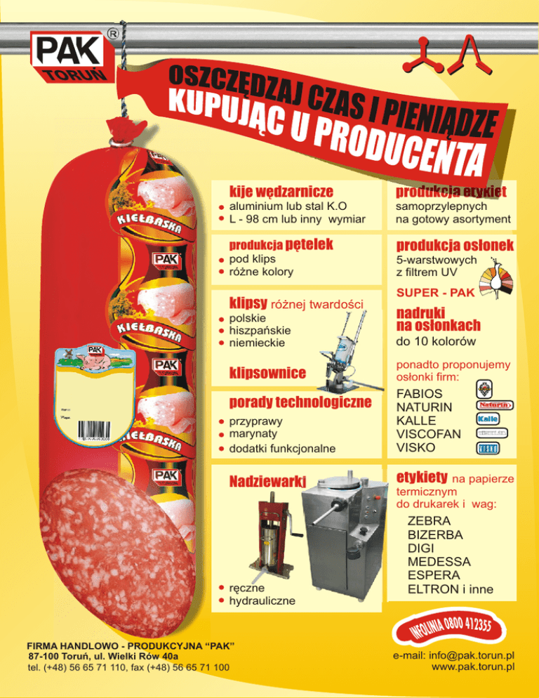 kije wędzarnicze produkcja etykiet aluminium lub stal K.O L - 98 cm lub inny wymiar samoprzylepnych na gotowy asortyment produkcja pętelek produkcja osłonek pod klips różne kolory 5-warstwowych z filtrem UV klipsy różnej twardości SUPER - PAK nadruki na osłonkach polskie hiszpańskie niemieckie do 10 kolorów klipsownice ponadto proponujemy osłonki firm: porady technologiczne przyprawy marynaty dodatki funkcjonalne Nadziewarki ręczne hydrauliczne FIRMA HANDLOWO - PRODUKCYJNA “PAK” 87-100 Toruń, ul. Wielki Rów 40a tel. (+48) 56 65 71 110, fax (+48) 56 65 71 100 FABIOS NATURIN KALLE VISCOFAN VISKO etykiety na papierze termicznym do drukarek i wag: ZEBRA BIZERBA DIGI MEDESSA ESPERA ELTRON i inne e-mail: [email protected] www.pak.torun.pl