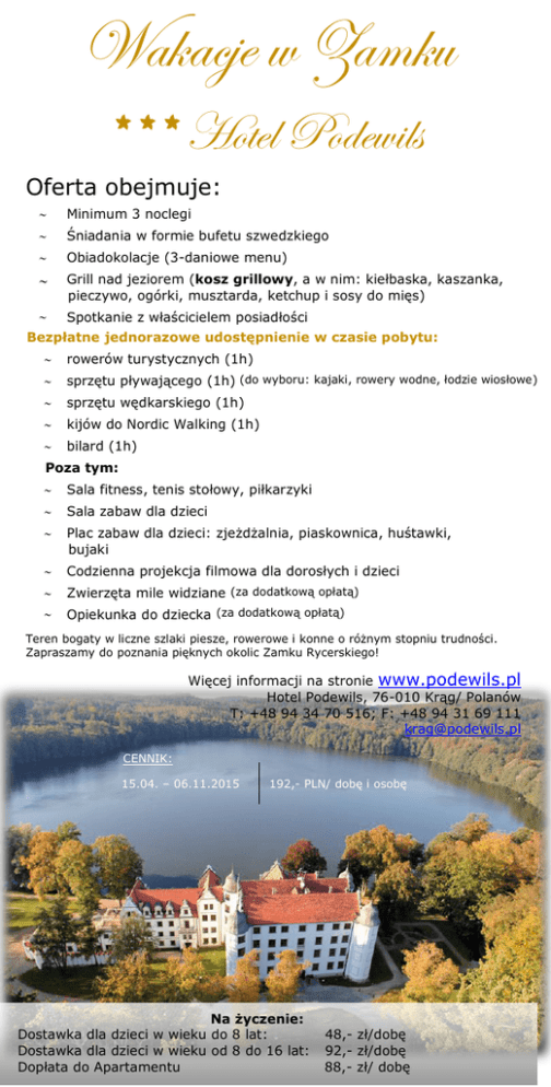 Wakacje w Zamku ***Hotel Podewils Oferta obejmuje: Minimum 3 noclegi Śniadania w formie bufetu szwedzkiego Obiadokolacje (3-daniowe menu) Grill nad jeziorem (kosz grillowy, a w nim: kiełbaska, kaszanka, pieczywo, ogórki, musztarda, ketchup i sosy do mięs) Spotkanie z właścicielem posiadłości Bezpłatne jednorazowe udostępnienie w czasie pobytu: rowerów turystycznych (1h) sprzętu pływającego (1h) (do wyboru: kajaki, rowery wodne, łodzie wiosłowe) sprzętu wędkarskiego (1h) kijów do Nordic Walking (1h) bilard (1h) Poza tym: Sala fitness, tenis stołowy, piłkarzyki Sala zabaw dla dzieci Plac zabaw dla dzieci: zjeżdżalnia, piaskownica, huśtawki, bujaki Codzienna projekcja filmowa dla dorosłych i dzieci Zwierzęta mile widziane (za dodatkową opłatą) Opiekunka do dziecka (za dodatkową opłatą) Teren bogaty w liczne szlaki piesze, rowerowe i konne o różnym stopniu trudności. Zapraszamy do poznania pięknych okolic Zamku Rycerskiego! Więcej informacji na stronie www.podewils.pl Hotel Podewils, 76-010 Krąg/ Polanów T: +48 94 34 70 516; F: +48 94 31 69 111 [email protected] CENNIK: 15.04. – 06.11.2015 192,- PLN/ dobę i osobę Na życzenie: Dostawka dla dzieci w wieku do 8 lat: Dostawka dla dzieci w wieku od 8 do 16 lat: Dopłata do Apartamentu 48,- zł/dobę 92,- zł/dobę 88,- zł/ dobę