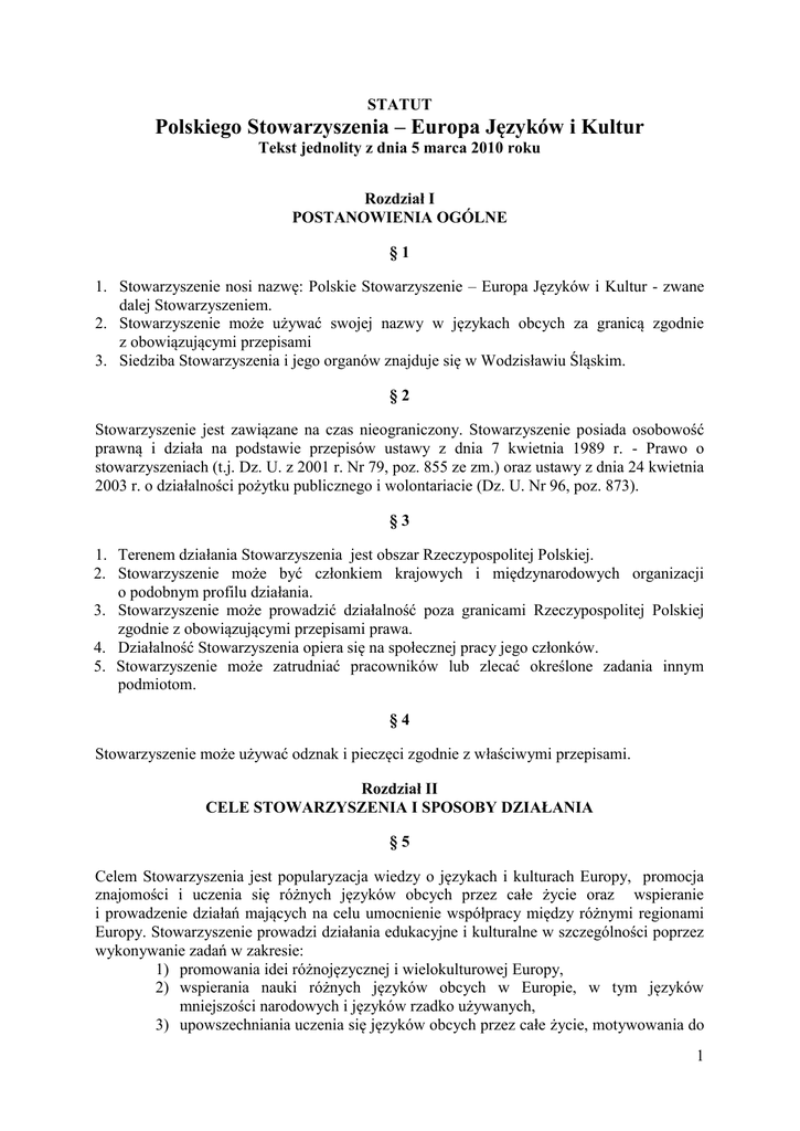 STATUT Polskiego Stowarzyszenia – Europa Języków i Kultur Tekst jednolity z dnia 5 marca 2010 roku Rozdział I POSTANOWIENIA OGÓLNE §1 1. Stowarzyszenie nosi nazwę: Polskie Stowarzyszenie – Europa Języków i Kultur - zwane dalej Stowarzyszeniem. 2. Stowarzyszenie może używać swojej nazwy w językach obcych za granicą zgodnie z obowiązującymi przepisami 3. Siedziba Stowarzyszenia i jego organów znajduje się w Wodzisławiu Śląskim. §2 Stowarzyszenie jest zawiązane na czas nieograniczony. Stowarzyszenie posiada osobowość prawną i działa na podstawie przepisów ustawy z dnia 7 kwietnia 1989 r. - Prawo o stowarzyszeniach (t.j. Dz. U. z 2001 r. Nr 79, poz. 855 ze zm.) oraz ustawy z dnia 24 kwietnia 2003 r. o działalności pożytku publicznego i wolontariacie (Dz. U. Nr 96, poz. 873). §3 1. Terenem działania Stowarzyszenia jest obszar Rzeczypospolitej Polskiej. 2. Stowarzyszenie może być członkiem krajowych i międzynarodowych organizacji o podobnym profilu działania. 3. Stowarzyszenie może prowadzić działalność poza granicami Rzeczypospolitej Polskiej zgodnie z obowiązującymi przepisami prawa. 4. Działalność Stowarzyszenia opiera się na społecznej pracy jego członków. 5. Stowarzyszenie może zatrudniać pracowników lub zlecać określone zadania innym podmiotom. §4 Stowarzyszenie może używać odznak i pieczęci zgodnie z właściwymi przepisami. Rozdział II CELE STOWARZYSZENIA I SPOSOBY DZIAŁANIA §5 Celem Stowarzyszenia jest popularyzacja wiedzy o językach i kulturach Europy, promocja znajomości i uczenia się różnych języków obcych przez całe życie oraz wspieranie i prowadzenie działań mających na celu umocnienie współpracy między różnymi regionami Europy. Stowarzyszenie prowadzi działania edukacyjne i kulturalne w szczególności poprzez wykonywanie zadań w zakresie: 1) promowania idei różnojęzycznej i wielokulturowej Europy, 2) wspierania nauki różnych języków obcych w Europie, w tym języków mniejszości narodowych i języków rzadko używanych, 3) upowszechniania uczenia się języków obcych przez całe życie, motywowania do 1 doskonalenia ich znajomości poprzez realizację projektów o charakterze edukacyjnym i kulturalnym, 4) rozwijania tolerancji i zrozumienia między ludźmi należącymi do różnych obszarów kulturowych i tradycji językowych, kształtowania otwartej postawy wobec innych narodów, wspierania zaangażowania wszystkich grup społecznych w życie publiczne i rozwój społeczeństwa obywatelskiego, 5) prowadzenia badań i zwalczanie stereotypów kulturowych i etnicznych poprzez wzbogacanie wiedzy o krajach, językach i kulturach europejskich i pozaeuropejskich, propagowanie idei integracji europejskiej, 6) ułatwiania nawiązywania kontaktów pomiędzy nauczycielami języków obcych w Polsce z ich potencjalnymi partnerami za granicą poprzez organizację kursów, szkoleń, seminariów, konferencji, imprez integracyjnych, 7) zachęcania członków stowarzyszenia do kształcenia ustawicznego, przygotowania stosownej oferty edukacyjnej, współorganizacji odpowiednich studiów podyplomowych oraz wspierania wszelkiej przedsiębiorczości, 8) integracji środowiska nauczycieli na wszystkich szczeblach edukacyjnych w Polsce oraz nawiązywania kontaktów z nauczycielami z zagranicy, 9) popularyzacji języka francuskiego w Polsce i w świecie, przyczynianie się do wzrostu poziomu jego znajomości, rozbudzania zamiłowania do języka i kultury francuskiej i krajów frankofońskich oraz w szerszym znaczeniu przyczyniania się do rozwoju kontaktów i wymiany na płaszczyźnie językowej i kulturowej oraz ekonomicznej ułatwiających proces wzajemnego poznania się Europejczyków, 10) współpracy z samorządami terytorialnymi oraz osobami, instytucjami i organizacjami realizującymi cele podobne jak Stowarzyszenia, 11) propagowania idei frankofonii w kraju i poza jego granicami oraz promocji kultur krajów frankofońskich, 12) dbałości o język polski i jego promocję w kraju, w Europie i na świecie, nawiązywania kontaktów z Polonią oraz wspierania jej działań, 13) wymiany informacji i doświadczeń pomiędzy różnymi partnerami, również zagranicznymi o charakterze interdyscyplinarnym, łączącym naukę, technikę, kulturę, edukację, oświatę i wychowanie, 14) prowadzenia działań na rzecz zdrowego, aktywnego trybu życia dzieci, młodzieży i dorosłych oraz współpracę z publicznymi i niepublicznymi jednostkami służby zdrowia, 15) działalności charytatywnej. Rozdział III CZŁONKOWIE STOWARZYSZENIA §6 1. Członkowie Stowarzyszenia dzielą się na: a) członków zwyczajnych, b) członków wspierających, c) członków honorowych. 2. Członkiem zwyczajnym Stowarzyszenia może być pełnoletni obywatel Rzeczypospolitej Polskiej lub cudzoziemiec, także mający miejsce zamieszkania poza terytorium Rzeczypospolitej Polskiej. 2 3. Kandydat do Stowarzyszenia składa pisemną deklarację zawierającą oświadczenie o przystąpieniu i zobowiązanie do opłacania składek, a ponadto: a) osoby fizyczne: imię (imiona) i nazwisko, datę i miejsce urodzenia, adres, numer PESEL, b) osoby prawne: nazwę (firmę), siedzibę, adres, numer Regon, numer NIP, dołączając także odpis z właściwego rejestru, jeżeli podlegają wpisowi do rejestru. 4. Przyjęcie do Stowarzyszenia wymaga pisemnej rekomendacji co najmniej dwóch członków Stowarzyszenia, złożenia deklaracji członkowskiej oraz podjęcia przez Zarząd uchwały o nadaniu członkostwa. 5. Zarząd nadaje członkostwo Stowarzyszenia w drodze uchwały podjętej zwykłą większością głosów. 6. Zarząd nie jest zobowiązany do podania uzasadnienia uchwały o odrzuceniu wniosku o nadanie członkostwa. Decyzja Zarządu jest ostateczna. §7 1. Członek zwyczajny Stowarzyszenia ma prawo brać udział w życiu Stowarzyszenia, a w szczególności: a) przysługuje mu bierne i czynne prawo wyborcze, b) może wnioskować we wszystkich s