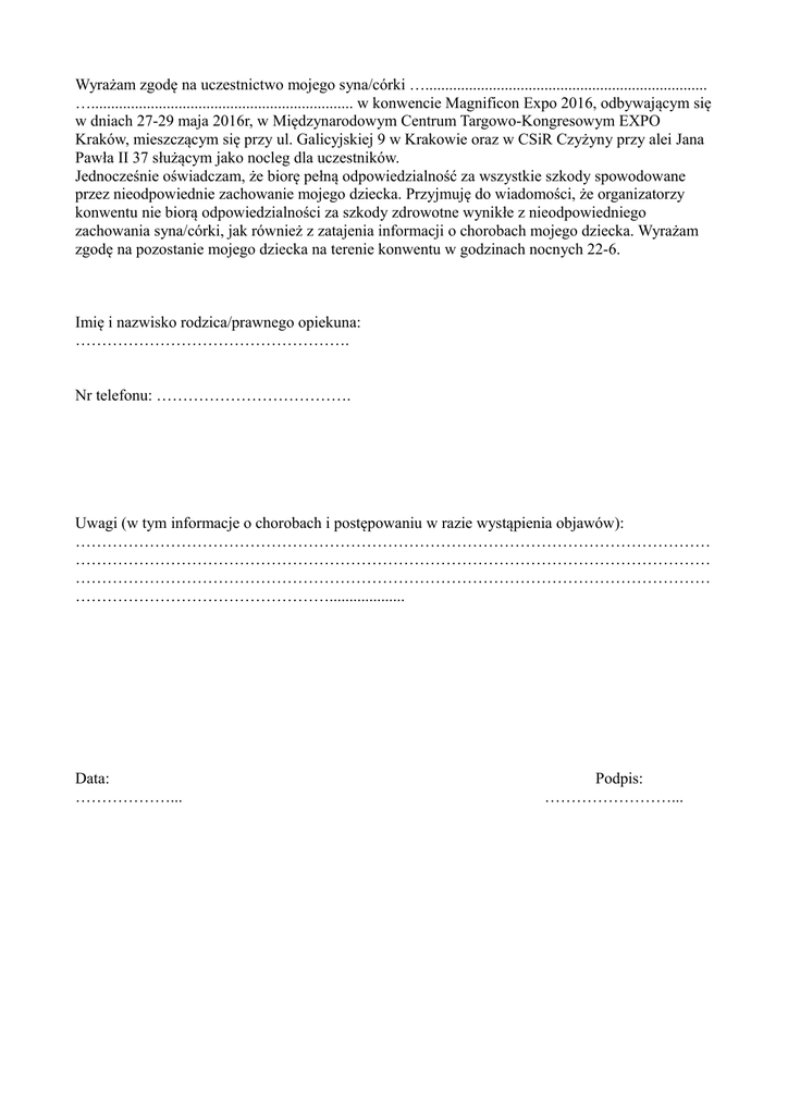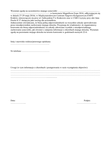 Wyrażam zgodę na uczestnictwo mojego syna/córki …....................................................................... ….................................................................. w konwencie Magnificon Expo 2016, odbywającym się w dniach 27-29 maja 2016r, w Międzynarodowym Centrum Targowo-Kongresowym EXPO Kraków, mieszczącym się przy ul. Galicyjskiej 9 w Krakowie oraz w CSiR Czyżyny przy alei Jana Pawła II 37 służącym jako nocleg dla uczestników. Jednocześnie oświadczam, że biorę pełną odpowiedzialność za wszystkie szkody spowodowane przez nieodpowiednie zachowanie mojego dziecka. Przyjmuję do wiadomości, że organizatorzy konwentu nie biorą odpowiedzialności za szkody zdrowotne wynikłe z nieodpowiedniego zachowania syna/córki, jak również z zatajenia informacji o chorobach mojego dziecka. Wyrażam zgodę na pozostanie mojego dziecka na terenie konwentu w godzinach nocnych 22-6. Imię i nazwisko rodzica/prawnego opiekuna: ……………………………………………. Nr telefonu: ………………………………. Uwagi (w tym informacje o chorobach i postępowaniu w razie wystąpienia objawów): ………………………………………………………………………………………………………… ………………………………………………………………………………………………………… ………………………………………………………………………………………………………… …………………………………………................... Data: ………………... Podpis: ……………………...