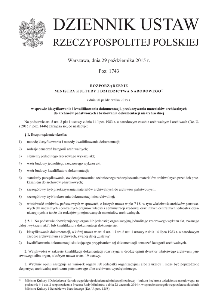 DZIENNIK USTAW RZECZYPOSPOLITEJ POLSKIEJ Warszawa, dnia 29 października 2015 r. Poz. 1743 ROZPORZĄDZENIE MINISTRA KULTURY I DZIEDZICTWA NARODOWEGO 1) z dnia 20 października 2015 r. w sprawie klasyfikowania i kwalifikowania dokumentacji, przekazywania materiałów archiwalnych do archiwów państwowych i brakowania dokumentacji niearchiwalnej Na podstawie art. 5 ust. 2 pkt 1 ustawy z dnia 14 lipca 1983 r. o narodowym zasobie archiwalnym i archiwach (Dz. U. z 2015 r. poz. 1446) zarządza się, co następuje: § 1. Rozporządzenie określa: 1)metodę klasyfikowania i metody kwalifikowania dokumentacji; 2)rodzaje oznaczeń kategorii archiwalnych; 3)elementy jednolitego rzeczowego wykazu akt; 4)wzór budowy jednolitego rzeczowego wykazu akt; 5)wzór budowy kwalifikatora dokumentacji; 6)standardy porządkowania, ewidencjonowania i technicznego zabezpieczania materiałów archiwalnych przed ich przekazaniem do archiwów państwowych; 7)szczegółowy tryb przekazywania materiałów archiwalnych do archiwów państwowych; 8)szczegółowy tryb brakowania dokumentacji niearchiwalnej; 9)właściwość archiwów państwowych w sprawach, o których mowa w pkt 7 i 8, w tym właściwość archiwów państwowych dla naczelnych i centralnych organów władzy i administracji rządowej oraz innych centralnych jednostek organizacyjnych, a także dla rodzajów przejmowanych materiałów archiwalnych. § 2. 1. Na podstawie obowiązującego organ lub jednostkę organizacyjną jednolitego rzeczowego wykazu akt, zwanego dalej „wykazem akt”, lub kwalifikatora dokumentacji dokonuje się: 1)klasyfikowania dokumentacji, o której mowa w art. 5 ust. 1 i art. 6 ust. 1 ustawy z dnia 14 lipca 1983 r. o narodowym zasobie archiwalnym i archiwach, zwanej dalej „ustawą”; 2)kwalifikowania dokumentacji skutkującego przypisaniem tej dokumentacji oznaczeń kategorii archiwalnych. 2. Wątpliwości w zakresie kwalifikacji dokumentacji rozstrzyga w drodze opinii dyrektor właściwego archiwum państwowego albo organ, o którym mowa w art. 19 ustawy. 3. Wydanie opinii następuje na wniosek organu lub jednostki organizacyjnej albo z urzędu i może być poprzedzone ekspertyzą archiwalną archiwum państwowego albo archiwum wyodrębnionego. 1) Minister Kultury i Dziedzictwa Narodowego kieruje działem administracji rządowej – kultura i ochrona dziedzictwa narodowego, na podstawie § 1 ust. 2 rozporządzenia Prezesa Rady Ministrów z dnia 22 września 2014 r. w sprawie szczegółowego zakresu działania Ministra Kultury i Dziedzictwa Narodowego (Dz. U. poz. 1258). Dziennik Ustaw –2– Poz. 1743 4. Wniosek o wydanie opinii zawiera w szczególności: 1)nazwę organu lub jednostki organizacyjnej wnioskującej o opinię; 2)nazwę organu lub jednostki organizacyjnej, której dokumentacja ma podlegać kwalifikacji na podstawie opinii; 3)charakterystykę dokumentacji przez określenie jej rodzajów, typów oraz tematyki; 4)informację o rocznych datach skrajnych wytworzonej dokumentacji; 5)dotychczasową podstawę kwalifikowania lub informację o jej braku. 5. Sposób oznaczania kategorii archiwalnych określa załącznik nr 1 do rozporządzenia. 6. Jeżeli przepisy szczególne tak stanowią, dopuszcza się inne niż określone w załączniku nr 1 do rozporządzenia sposoby liczenia okresów przechowywania dokumentacji. § 3. 1. Wykaz akt jest konstruowany z zestawu klas w kolejnych rzędach podziału dziesiętnego. Każdy rząd podziału składa się z co najmniej dwóch, a maksymalnie z dziesięciu klas. 2. Podział, o którym mowa w ust. 1, jest prowadzony aż do utworzenia klasy końcowej, w ramach której rejestruje się sprawy albo grupuje się dokumentację bez wymogu jej rejestracji. 3. Klasy końcowe oznacza się symbolem określającym kategorię archiwalną. 4. Klasa składa się z symbolu klasyfikacyjnego oraz hasła klasyfikacyjnego. Hasło klasyfikacyjne może zostać uszczegółowione przez określenie typu dokumentacji przyporządkowanej do tej klasy. 5. Symbol klasyfikacyjny w systemie dziesiętnym jest konstruowany z zestawu cyfr arabskich zapisanych w następujący sposób: 1)dla klas pierwszego rzędu jako symbol jednocyfrowy od cyfry „0” do „9”; 2)dla klas drugiego rzędu jako symbol dwucyfrowy wyrażony zbiorem cyfr od „00” do „99”; 3)dla klas trzeciego rzędu jako symbol trzycyfrowy wyrażony zbiorem cyfr od „000” do „999”; 4)dla klas czwartego rzędu jako symbol czterocyfrowy wyrażony zbiorem cyfr od „0000” do „9999”; 5)dla klas piątego rzędu jako symbol pięciocyfrowy wyrażony zbiorem cyfr od „00000” do „99999”; 6)dla klas szóstego rzędu jako symbol sześciocyfrowy wyrażony zbiorem cyfr od „000000” do „999999”; 7)dla klas siódmego rzędu jako symbol siedmiocyfrowy wyrażony zbiorem cyfr od „0000000” do „9999999”; 8)dla klas ósmego rzędu jako symbol ośmiocyfrowy wyrażony zbiorem cyfr od „00000000” do „99999999”; 9)dla klas dziewiątego rzędu jako symbol dziewięciocyfrowy wyrażony zbiorem cyfr od „000000000” do „999999999”; 10)dla klas dziesiątego rzędu jako symbol dziesięciocyfrowy wyrażony zbiorem cyfr od „0000000000” do „9999999999”. 6. Budowa wykazu akt jest niezależna od struktury organizacyjnej i od podziału kompetencji wewnątrz organu lub jednostki organizacyjnej. 7. Każda klasa powinna być rzeczowo powiązana z klasą wyższego i niższego rzędu, a klasa niższego rzędu zawsze powinna wynikać z klasy wyższego rzędu. 8. W wykazie akt: 1)pierwsze cztery klasy pierwszego rzędu dotyczą klasyfikowania i kwalifikowania dokumentacji związanej z zarządzaniem, sprawami kadrowymi, administrowaniem środkami rzeczowymi oraz finansami; 2)piąta i następne klasy pierwszego rzędu dotyczą klasyfikowania i kwalifikowania dokumentacji związanej z zagadnieniami merytorycznymi, do których realizacji organ lub jednostka organizacyjna zostały utworzone. 9. Schemat klas pierwszego i drugiego rzędu