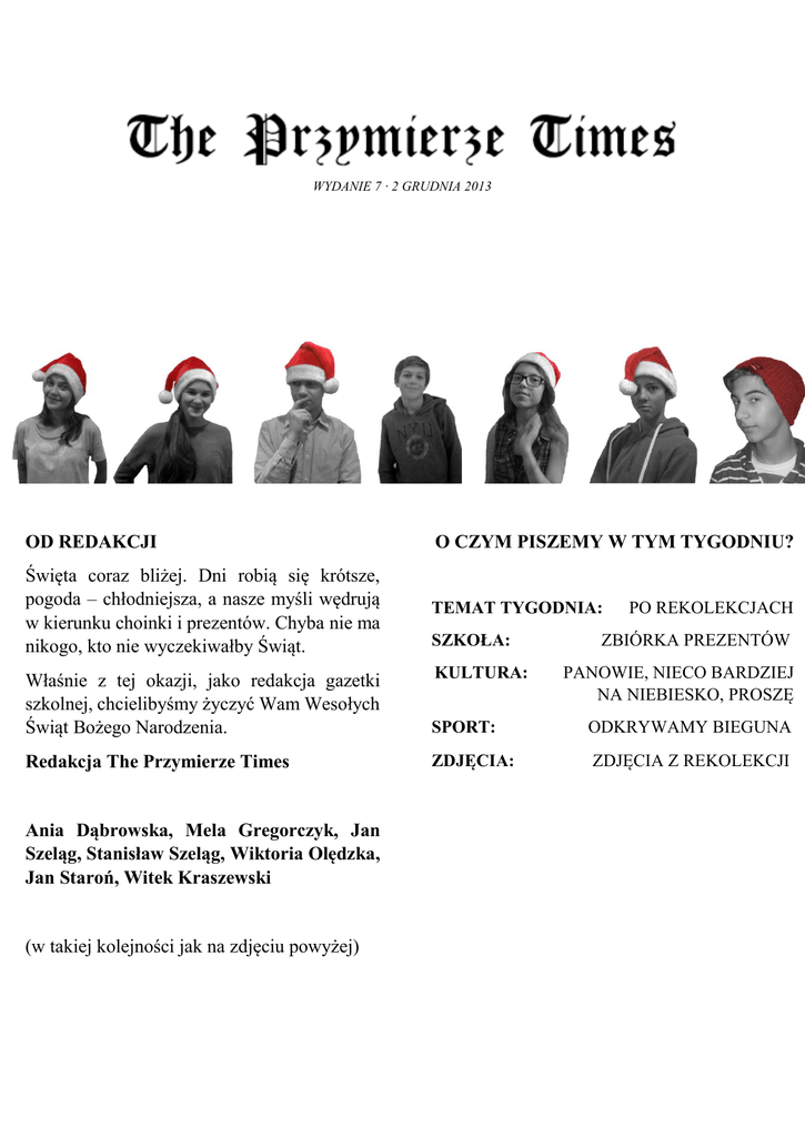 WYDANIE 7 · 2 GRUDNIA 2013 OD REDAKCJI O CZYM PISZEMY W TYM TYGODNIU? Święta coraz bliżej. Dni robią się krótsze, pogoda – chłodniejsza, a nasze myśli wędrują w kierunku choinki i prezentów. Chyba nie ma nikogo, kto nie wyczekiwałby Świąt. TEMAT TYGODNIA: SZKOŁA: KULTURA: PO REKOLEKCJACH ZBIÓRKA PREZENTÓW PANOWIE, NIECO BARDZIEJ NA NIEBIESKO, PROSZĘ Właśnie z tej okazji, jako redakcja gazetki szkolnej, chcielibyśmy życzyć Wam Wesołych Świąt Bożego Narodzenia. SPORT: ODKRYWAMY BIEGUNA Redakcja The Przymierze Times ZDJĘCIA: ZDJĘCIA Z REKOLEKCJI Ania Dąbrowska, Mela Gregorczyk, Jan Szeląg, Stanisław Szeląg, Wiktoria Olędzka, Jan Staroń, Witek Kraszewski (w takiej kolejności jak na zdjęciu powyżej) TEMAT TYGODNIA PO REKOLEKCJACH 25 listopada całym gimnazjum wyruszyliśmy na rekolekcje do Korbielowa. Pierwsze i drugie klasy mieszkały w Klasztorze, a trzecie, podzielone na grupy, mieszkały u rodzin. Każdy poziom zmierzył się z innym tematem: Klasy I – Stworzenie świata prowadzone przez o. Marka Urbanowskiego Klasy II – Tożsamość, kobieta, mężczyzna prowadzone przez o. Tomasza Rojka Klasy III – Cel, droga, po co żyć? prowadzone przez o. Benedykta Malewskiego Co uczniom najbardziej podobało się na rekolekcjach? KLASY I KLASY II Teatr cieni Rozmowy z ojcem Rojkiem Wycieczka w góry Ojciec Rojek Rozmowy z ojcem Spotkanie z wielodzietną rodziną Czas wolny Kręcenie Filmów KLASY III Jedzenie Okolica Rozmowy z Ojcem Pogoda Mam nadzieję, iż większość osób uważa te rekolekcje za udane i wiele się po nich nauczyła. Przypuszczam, że za rok jeszcze chętniej tam wyruszymy. W imieniu gazetki szkolnej – Ania Dąbrowska 2 SZKOŁA ZBIÓRKA PREZENTÓW 6 grudnia mikołajki. Już na dobre zaczną się święta. Pierwsze prezenty, pierwsze kolędy, może nawet (miejmy nadzieję) pierwszy porządny śnieg? Nie dla wszystkich mikołajki wyglądają tak, jak dla nas. Niektórzy nie dostaną prezentów, bo ich na nie stać. Nie usłyszą kolęd, bo nie ma nikogo, kto może im je zaśpiewać. Nie ucieszą się śniegiem, bo dla nich oznacza tylko dwa lub trzy miesiące zimna. Tu nie chodzi o wywołanie poczucia winy. To nie my sprawiliśmy, że są ludzie, którzy mają trudnie życie. Ale to właśnie my możemy coś z tym zrobić. Jak pomóc? Dzisiaj i jutro (poniedziałek, wtorek) w naszej szkole będzie odbywać się zbiórka prezentów dla ubogich dzieci. Muszą one zostać wysłane do 6tego, więc im szybciej zbierzemy wszystko, tym lepiej. Codziennie na długiej przerwie w okolicach jadalni można zapisać się na liście z prezentami. Marzenia tych dzieci to klocki, kredki, lalka, czasem bluza czy buty. Dla nas to mało. Dla nich – najwspanialsze pod słońcem prezenty. W imieniu gazetki szkolnej – Jan Szeląg 3 KULTURA PANOWIE, NIECO BARDZIEJ NA NIEBIESKO, PROSZĘ Synestezja, czyli według Wikipedii - stan lub zdolność, w której doświadczenia jednego zmysłu (np. wzroku) wywołują również doświadczenia charakterystyczne dla innych zmysłów. Wyobraź sobie, że czytając, choćby książkę postrzegasz ją w kolorach. Każda cyfra posiada inny kolor, każda litera inną barwę i odcień. I nagle książka jest tęczowa. I to bez tabletek! Sławnymi synestetami, czyli ludźmi o wyostrzonym problemie synestezji, byli i są Vladimir Nabokov (pisarz), Marilyn Monroe (aktorka, ikona), Stevie Wonder (amerykański wokalista) i Franciszek Liszt (wolnomularz i węgierski kompozytor). Skojarzenia (np.) tonacji z barwami są różne. Jednak według Nikołaja Rimskiego - Korsakowa, wyglądały one tak: C-dur: biały G-dur: brązowozłoty, jasny D-dur: żółty, słoneczny A-dur: jasnoróżowy E-dur: szafirowy, błyszczący H-dur: granatowy, ponury Fis-dur: szarozielony Des-dur: mroczny, gorący As-dur: siwofioletowy Es-dur: mroczny, błękitno-szary Marilyn Monroe kiedy słyszała dźwięki, widziała wibracje, Franciszek List postrzegał tonacje jako bardziej lub mniej niebieskie, Vladimir Nabokov uważał, że R jest jak brudna, pokryta sadzą szmata, a L jak miękki makaron. Większość z nas ma zdolności typowe dla synestytów. Pomyśl – jaki kolor ma litera A, jaki litera B, a jaki C? Według psychologów z Yale University istnieją dwa rodzaje synestetyków – mocnych (takich jak Liszt, Nabokov i Korsakov) lub normalnych (takich, jak my wszyscy). Wracając do zadania – jeśli wybrałeś kolor czerwony dla A, niebieski dla B i żółty dla C, to znaczy, że należysz do większości. Synestetycy są też bardziej romantyczni, jeśli ty określiłbyś A jako czerwone, synestyk pewnie powiedziałby, że ta litera przypomina mu dojrzałe truskawki, zbierane na plantacjach. Wychodzi na to, że choćbyśmy nie posmakowali zielonych kwadratów, to i tak zawsze pozostają nam czerwone A. W imieniu gazetki szkolnej – Wiktoria Olędzka 4 SPORT ODKRYWAMY BIEGUNA Czy to cudowne dziecko Małysza? Nie, to Krzysztof Biegun, który niewiarygodnie zwyciężając Puchar Świata w Klinghental staje się liderem w skokach narciarskich! 19-latek pokazał na co go stać, wygrywając pierwszą serię i zarazem zwyciężając cały konkurs, ponieważ z powodu złych warunków atmosferycznych druga runda została odwołana. Zwycięstwo Bieguna to z pewnością historyczny dzień dla Polskich skoków narciarskich. Natomiast nie startowali dwaj główni faworyci, mianowicie Anders Bardal i Gregor Schlierenzauer, którzy w ubiegłym sezonie w kwalifikacji ogólnej stanęli na podium. Wycofali się z konkursu w proteście przeciwko decyzji sędziów o rozegraniu zawodów mimo niesprzyjających warunków atmosferycznych. Brak dwóch najlepszych zdecydowanie pomógł Biegunowi w zwycięstwie. Krzysztof Biegun urodził się w 1994 roku w Gilowicach w Małopolsce. Jego pierwszym trenerem był Bronisław Porębski, który kierował klubem ŁKS Sokół Szczyrk, gdzie również trenował w młodości Stefan Hula, także reprezentant Polski od 2003 roku.
