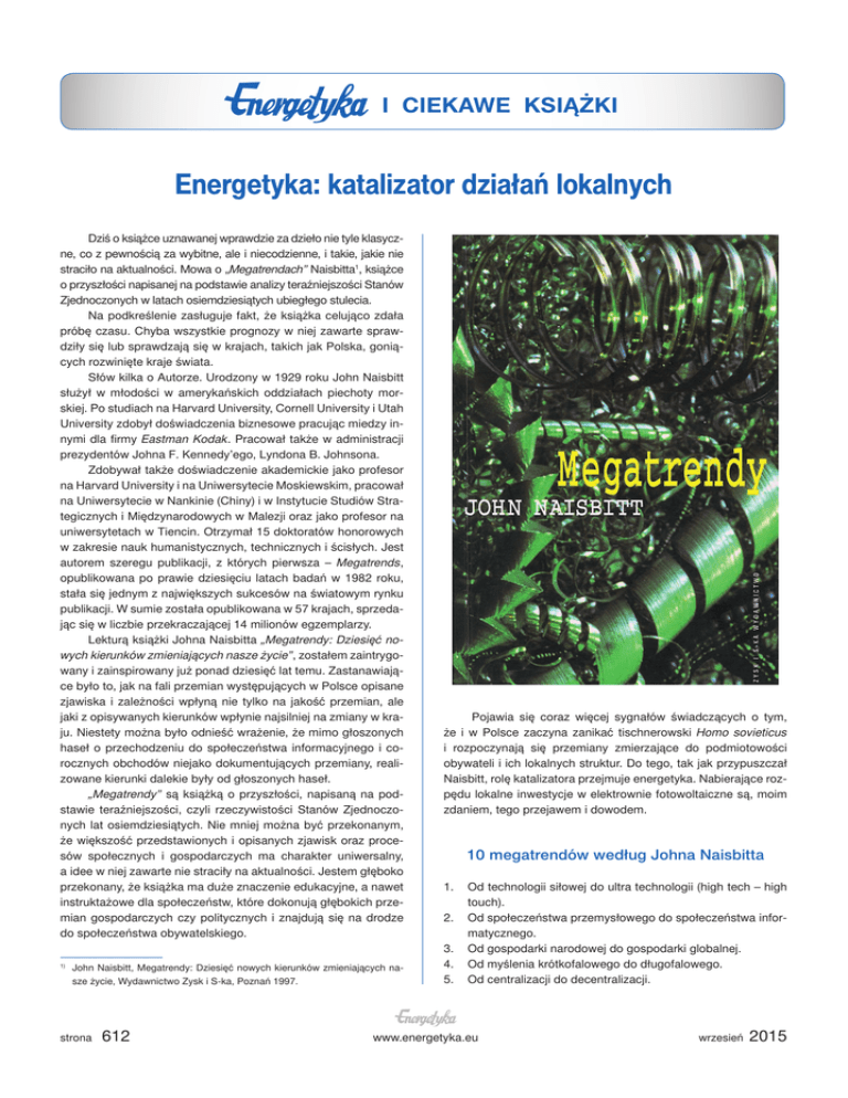 I CIEKAWE KSIĄŻKI Energetyka: katalizator działań lokalnych Dziś o książce uznawanej wprawdzie za dzieło nie tyle klasyczne, co z pewnością za wybitne, ale i niecodzienne, i takie, jakie nie straciło na aktualności. Mowa o „Megatrendach” Naisbitta1, książce o przyszłości napisanej na podstawie analizy teraźniejszości Stanów Zjednoczonych w latach osiemdziesiątych ubiegłego stulecia. Na podkreślenie zasługuje fakt, że książka celująco zdała próbę czasu. Chyba wszystkie prognozy w niej zawarte sprawdziły się lub sprawdzają się w krajach, takich jak Polska, goniących rozwinięte kraje świata. Słów kilka o Autorze. Urodzony w 1929 roku John Naisbitt służył w młodości w amerykańskich oddziałach piechoty morskiej. Po studiach na Harvard University, Cornell University i Utah University zdobył doświadczenia biznesowe pracując miedzy innymi dla firmy Eastman Kodak. Pracował także w administracji prezydentów Johna F. Kennedy’ego, Lyndona B. Johnsona. Zdobywał także doświadczenie akademickie jako profesor na Harvard University i na Uniwersytecie Moskiewskim, pracował na Uniwersytecie w Nankinie (Chiny) i w Instytucie Studiów Strategicznych i Międzynarodowych w Malezji oraz jako profesor na uniwersytetach w Tiencin. Otrzymał 15 doktoratów honorowych w zakresie nauk humanistycznych, technicznych i ścisłych. Jest autorem szeregu publikacji, z których pierwsza – Megatrends, opublikowana po prawie dziesięciu latach badań w 1982 roku, stała się jednym z największych sukcesów na światowym rynku publikacji. W sumie została opublikowana w 57 krajach, sprzedając się w liczbie przekraczającej 14 milionów egzemplarzy. Lekturą książki Johna Naisbitta „Megatrendy: Dziesięć nowych kierunków zmieniających nasze życie”, zostałem zaintrygowany i zainspirowany już ponad dziesięć lat temu. Zastanawiające było to, jak na fali przemian występujących w Polsce opisane zjawiska i zależności wpłyną nie tylko na jakość przemian, ale jaki z opisywanych kierunków wpłynie najsilniej na zmiany w kraju. Niestety można było odnieść wrażenie, że mimo głoszonych haseł o przechodzeniu do społeczeństwa informacyjnego i corocznych obchodów niejako dokumentujących przemiany, realizowane kierunki dalekie były od głoszonych haseł. „Megatrendy” są książką o przyszłości, napisaną na podstawie teraźniejszości, czyli rzeczywistości Stanów Zjednoczonych lat osiemdziesiątych. Nie mniej można być przekonanym, że większość przedstawionych i opisanych zjawisk oraz procesów społecznych i gospodarczych ma charakter uniwersalny, a idee w niej zawarte nie straciły na aktualności. Jestem głęboko przekonany, że książka ma duże znaczenie edukacyjne, a nawet instruktażowe dla społeczeństw, które dokonują głębokich przemian gospodarczych czy politycznych i znajdują się na drodze do społeczeństwa obywatelskiego. John Naisbitt, Megatrendy: Dziesięć nowych kierunków zmieniających nasze życie, Wydawnictwo Zysk i S-ka, Poznań 1997. 1) strona 612 Pojawia się coraz więcej sygnałów świadczących o tym, że i w Polsce zaczyna zanikać tischnerowski Homo sovieticus i rozpoczynają się przemiany zmierzające do podmiotowości obywateli i ich lokalnych struktur. Do tego, tak jak przypuszczał Naisbitt, rolę katalizatora przejmuje energetyka. Nabierające rozpędu lokalne inwestycje w elektrownie fotowoltaiczne są, moim zdaniem, tego przejawem i dowodem. 10 megatrendów według Johna Naisbitta 1. Od technologii siłowej do ultra technologii (high tech – high touch). 2. Od społeczeństwa przemysłowego do społeczeństwa informatycznego. 3. Od gospodarki narodowej do gospodarki globalnej. 4. Od myślenia krótkofalowego do długofalowego. 5. Od centralizacji do decentralizacji. www.energetyka.eu wrzesień 2015 6. Od pomocy zinstytucjonalizowanej do samopomocy. 7. Od demokracji przedstawicielskiej do demokracji uczestniczącej. 8. Od hierarchii do sieci. 9. Z Północy na Południe. 10. Od schematu albo-albo do wielokrotnego wyboru. Decydując się na zamieszczenie większego cytatu z omawianej książki pozwalam sobie zadedykować go tym wszystkim działaczom lokalnym czy gminnym, którzy nie podjęli wygodnego hasła, że nic nie można zrobić bo „sorry, taki mamy klimat”, a uwierzyli, że volo is esse possit, czyli chcieć to móc. „W latach sześćdziesiątych i siedemdziesiątych waszyngtońskie podejście polegające na odgórnym wprowadzaniu superplanów w dziedzinie spraw socjalnych pociągnęło za sobą katastrofalne skutki. Tymczasem nowe rozwiązania, szczególnie w zakresie energetyki, rozkwitały bliżej domu. Podczas gdy mniejszościowe grupy interesów, działacze partyjni i regionalne koalicje okrawały chybiony plan energetyczny administracji Cartera, stany i miasta spokojnie zabrały się do analizowania miejscowych potrzeb i sformułowały własną, lokalną politykę energetyczną, a nawet zapewniły dostawy energii. Ponieważ sprawa energetyki pojawiła się w momencie, kiedy proces decentralizacji był już zaawansowany, naturalną koleją rzeczy było zajęcie się rozwiązywaniem zagadnień energetycznych na poziomie lokalnym. Energetyka stała się katalizatorem inicjatywy lokalnej być może dlatego, że obchodzi nas bardziej niż jakakolwiek inna sprawa. Z tego czy z innego powodu wielu z nas nie styka się z problematyką mieszkalnictwa, edukacji czy transportu; również wielu z nas nie interesuje się tematyką ekologiczną. Wszyscy jednak zużywamy energię. Nawet jeśli nie martwi nas cena oleju grzewczego, to na pewno zastanawiamy się nad cenami benzyny. Jeśli ani cena oleju, ani benzyny nie robi na nas wrażenia, pozostaje prąd elektryczny. Bez względu na to, w jakim mieszkamy stanie, wszyscy korzystamy z elektryczności i telefonów. Ten prosty fakt wyjaśnia, dlaczego większość nowych problemów konsumenckich pojawia się w branżach użyt
