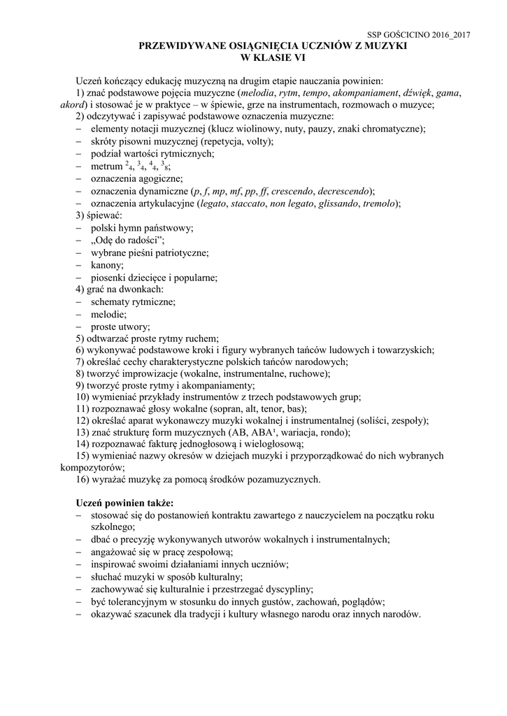 SSP GOŚCICINO 2016_2017 PRZEWIDYWANE OSIĄGNIĘCIA UCZNIÓW Z MUZYKI W KLASIE VI Uczeń kończący edukację muzyczną na drugim etapie nauczania powinien: 1) znać podstawowe pojęcia muzyczne (melodia, rytm, tempo, akompaniament, dźwięk, gama, akord) i stosować je w praktyce – w śpiewie, grze na instrumentach, rozmowach o muzyce; 2) odczytywać i zapisywać podstawowe oznaczenia muzyczne: elementy notacji muzycznej (klucz wiolinowy, nuty, pauzy, znaki chromatyczne); skróty pisowni muzycznej (repetycja, volty); podział wartości rytmicznych; metrum 24, 34, 44, 38; oznaczenia agogiczne; oznaczenia dynamiczne (p, f, mp, mf, pp, ff, crescendo, decrescendo); oznaczenia artykulacyjne (legato, staccato, non legato, glissando, tremolo); 3) śpiewać: polski hymn państwowy; „Odę do radości”; wybrane pieśni patriotyczne; kanony; piosenki dziecięce i popularne; 4) grać na dwonkach: schematy rytmiczne; melodie; proste utwory; 5) odtwarzać proste rytmy ruchem; 6) wykonywać podstawowe kroki i figury wybranych tańców ludowych i towarzyskich; 7) określać cechy charakterystyczne polskich tańców narodowych; 8) tworzyć improwizacje (wokalne, instrumentalne, ruchowe); 9) tworzyć proste rytmy i akompaniamenty; 10) wymieniać przykłady instrumentów z trzech podstawowych grup; 11) rozpoznawać głosy wokalne (sopran, alt, tenor, bas); 12) określać aparat wykonawczy muzyki wokalnej i instrumentalnej (soliści, zespoły); 13) znać strukturę form muzycznych (AB, ABA¹, wariacja, rondo); 14) rozpoznawać fakturę jednogłosową i wielogłosową; 15) wymieniać nazwy okresów w dziejach muzyki i przyporządkować do nich wybranych kompozytorów; 16) wyrażać muzykę za pomocą środków pozamuzycznych. Uczeń powinien także: stosować się do postanowień kontraktu zawartego z nauczycielem na początku roku szkolnego; dbać o precyzję wykonywanych utworów wokalnych i instrumentalnych; angażować się w pracę zespołową; inspirować swoimi działaniami innych uczniów; słuchać muzyki w sposób kulturalny; zachowywać się kulturalnie i przestrzegać dyscypliny; być tolerancyjnym w stosunku do innych gustów, zachowań, poglądów; okazywać szacunek dla tradycji i kultury własnego narodu oraz innych narodów. SSP GOŚCICINO 2016_2017 METODY KONTROLI: odpowiedź ustna; kartkówka sprawdzająca wiadomości teoretyczne; bieżąca obserwacja pracy; ocena końcowego rezultatu pracy ucznia. ZASADY OCENIANIA Z MUZYKI Ocenie podlegać będą: 1) umiejętności w zakresie: śpiewania; grania na dzwonkach; tworzenia muzyki; ruchu przy muzyce; tworzenia wypowiedzi o muzyce, np. na temat wysłuchanych utworów; 2) wiedza o muzyce: zagadnienia teoretyczne – znajomość podstawowych pojęć muzycznych i umiejętność ich stosowania w wypowiedziach o muzyce; wiadomości o kompozytorach; znajomość aparatu wykonawczego muzyki wokalnej i instrumentalnej (soliści, zespoły, chóry, orkiestry); opanowanie zagadnień z zakresu szeroko pojętej kultury muzycznej; 3) postępy, zaangażowanie, wkład pracy w działania muzyczne: aktywność na lekcjach wynikająca z zainteresowania przedmiotem; umiejętność pracy w grupie – współpraca i wzajemna pomoc; prezentacja dokonań; kreatywność. Ustalenia dodatkowe: uczeń może zgłosić dwa razy w semestrze nie przygotowanie do lekcji; uczeń może poprawić ocenę na kolejnej lekcji lub w terminie ustalonym przez nauczyciela; ocena końcowa jest ustalana przez nauczyciela w oparciu o oceny cząstkowe. Ocenę celującą (6) otrzymuje uczeń, który: opanował pełny zakres wiadomości i umiejętności przewidzianych w realizowanym programie nauczania; zdobywa dodatkową wiedzę, korzystając z różnych źródeł informacji; na lekcjach jest bardzo aktywny i zdyscyplinowany, inicjuje różnorodne zadania, projekty; potrafi zagrać melodie przewidziane w podręczniku oraz inne proste melodie na flecie, dzwonkach, keyboardzie; umie zaśpiewać a capella i z akompaniamentem piosenki z podręcznika oraz spoza niego; opanował umiejętność łączenia wiedzy z zakresu muzyki z wiadomościami z innych przedmiotów; potrafi samodzielnie formułować pytania i rozwiązywać problemy muzyczne; zawsze jest przygotowany do lekcji, odrabia zadane prace domowe; jest wzorowym słuchaczem koncertów muzycznych. Ocenę bardzo dobrą (5) otrzymuje uczeń, który: opanował pełny zakres wiadomości i umiejętności przewidzianych w realizowanym programie nauczania; korzysta z różnych źródeł informacji; na lekcjach jest bardzo aktywny i zdyscyplinowany; potrafi zagrać większość melodii przewidzianych w programie nauczania na flecie i dzwonkach; - SSP GOŚCICINO 2016_2017 umie zaśpiewać z akompaniamentem większość piosenek przewidzianych w programie nauczania; odrabia prace domowe; jest uważnym słuchaczem koncertów muzycznych. Ocenę dobrą (4) otrzymuje uczeń, który: opanował większość wiadomości i umiejętności przewidzianych w realizowanym programie nauczania; korzysta z różnych źródeł informacji; potrafi zagrać kilka melodii oraz akompaniamentów do piosenek na dzwonkach; umie zaśpiewać z akompaniamentem pieśni jednogłosowe poprawnie pod względem muzycznym; na lekcjach jest aktywny i zdyscyplinowany; odrabia prace domowe; jest uważnym słuchaczem koncertów muzycznych. Ocenę dostateczną (3) otrzymuje uczeń, który: opanował w podstawowym zakresie wiadomości i umiejętności przewidziane w realizowanym programie nauczania; jest w stanie zrozumieć najważniejsze zagadnienia przy pomocy nauczyciela; potrafi zagrać niektóre melodie przewidziane w programie nauczania na dzwonkach; umie zaśpiewać z akompaniamentem niektóre piosenki przewidziane w programie nauczania; odrabia prace domowe; potrafi się skupić podczas słuchania koncertów muzycznych. Ocenę dopuszczającą (2) otrzymuje uczeń, który: w niewielkim stopniu opanował wiadomości i umiejętności przewidziane w realizowanym programie nauczania