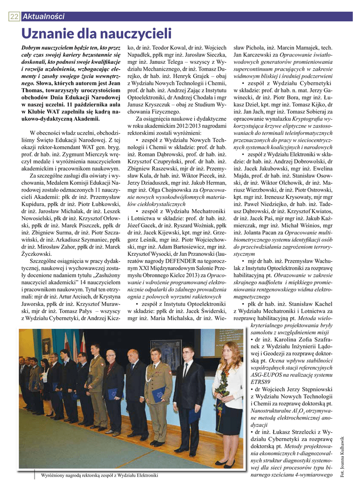 22 Aktualności Dobrym nauczycielem będzie ten, kto przez cały czas swojej kariery bezustannie się doskonali, kto podnosi swoje kwaliikacje i rozwija uzdolnienia, wzbogacając elementy i zasoby swojego życia wewnętrznego. Słowa, których autorem jest Jean Thomas, towarzyszyły uroczystościom obchodów Dnia Edukacji Narodowej w naszej uczelni. 11 października aula w Klubie WAT zapełniła się kadrą naukowo-dydaktyczną Akademii. W obecności władz uczelni, obchodziliśmy Święto Edukacji Narodowej. Z tej okazji rektor-komendant WAT gen. bryg. prof. dr hab. inż. Zygmunt Mierczyk wręczył medale i wyróżnienia nauczycielom akademickim i pracownikom naukowym. Za szczególne zasługi dla oświaty i wychowania, Medalem Komisji Edukacji Narodowej zostało odznaczonych 11 nauczycieli Akademii: płk dr inż. Przemysław Kupidura, ppłk dr inż. Piotr Łubkowski, dr inż. Jarosław Michalak, dr inż. Leszek Nowosielski, płk dr inż. Krzysztof Orłowski, ppłk dr inż. Marek Piszczek, ppłk dr inż. Zbigniew Surma, dr inż. Piotr Szczawiński, dr inż. Arkadiusz Szymaniec, ppłk dr inż. Mirosław Zahor, ppłk dr inż. Marek Życzkowski. Szczególne osiągnięcia w pracy dydaktycznej, naukowej i wychowawczej zostały docenione nadaniem tytułu „Zasłużony nauczyciel akademicki” 14 nauczycielom i pracownikom naukowym. Tytuł ten otrzymali: mjr dr inż. Artur Arciuch, dr Krystyna Jaworska, ppłk dr inż. Krzysztof Murawski, mjr dr inż. Tomasz Pałys – wszyscy z Wydziału Cybernetyki, dr Andrzej Kicz- ko, dr inż. Teodor Kowal, dr inż. Wojciech Napadłek, ppłk mgr inż. Jarosław Sieczka, mgr inż. Janusz Telega – wszyscy z Wydziału Mechanicznego, dr inż. Tomasz Durejko, dr hab. inż. Henryk Grajek – obaj z Wydziału Nowych Technologii i Chemii, prof. dr hab. inż. Andrzej Zając z Instytutu Optoelektroniki, dr Andrzej Chodała i mgr Janusz Kryszczuk – obaj ze Studium Wychowania Fizycznego. Za osiągnięcia naukowe i dydaktyczne w roku akademickim 2012/2013 nagrodami rektorskimi zostali wyróżnieni: • zespół z Wydziału Nowych Technologii i Chemii w składzie: prof. dr hab. inż. Roman Dąbrowski, prof. dr hab. inż. Krzysztof Czupryński, prof. dr hab. inż. Zbigniew Raszewski, mjr dr inż. Przemysław Kula, dr hab. inż. Wiktor Piecek, inż. Jerzy Dziaduszek, mgr inż. Jakub Herman, mgr inż. Olga Chojnowska za Opracowanie nowych wysokodwójłomnych materiałów ciekłokrystalicznych • zespół z Wydziału Mechatroniki i Lotnictwa w składzie: prof. dr hab. inż. Józef Gacek, dr inż. Ryszard Woźniak, ppłk dr inż. Jacek Kijewski, kpt. mgr inż. Grzegorz Leśnik, mgr inż. Piotr Wojciechowski, mgr inż. Adam Bartosiewicz, mgr inż. Krzysztof Wysocki, dr Jan Przanowski (laureatów nagrody DEFENDER na tegorocznym XXI Międzynarodowym Salonie Przemysłu Obronnego Kielce 2013) za Opracowanie i wdrożenie programowanej elektronicznie odpalarki do zdalnego prowadzenia ognia z polowych wyrzutni rakietowych • zespół z Instytutu Optoelektroniki w składzie: ppłk dr inż. Jacek Świderski, mgr inż. Maria Michalska, dr inż. Wie- Wyróżniony nagrodą rektorską zespół z Wydziału Elektroniki sław Pichola, inż. Marcin Mamajek, tech. Jan Karczewski za Opracowanie światłowodowych generatorów promieniowania supercontinuum pracujących w zakresie widmowym bliskiej i średniej podczerwieni • zespół z Wydziału Cybernetyki w składzie: prof. dr hab. n. mat. Jerzy Gawinecki, dr inż. Piotr Bora, mgr inż. Łukasz Dzieł, kpt. mgr inż. Tomasz Kijko, dr inż. Jan Jach, mgr inż. Tomasz Sobieraj za opracowanie wynalazku Kryptograia wykorzystująca krzywe eliptyczne w zastosowaniach do terminali teleinformatycznych przeznaczonych do pracy w sieciocentrycznych systemach koalicyjnych i narodowych • zespół z Wydziału Elektroniki w składzie: dr hab. inż. Andrzej Dobrowolski, dr inż. Jacek Jakubowski, mgr inż. Ewelina Majda, prof. dr hab. inż. Stanisław Osowski, dr inż. Wiktor Olchowik, dr inż. Mariusz Wierzbowski, dr inż. Piotr Ostrowski, kpt. mgr inż. Ireneusz Krysowaty, mjr mgr inż. Paweł Niedziejko, dr hab. inż. Tadeusz Dąbrowski, dr inż. Krzysztof Kwiatos, dr inż. Jacek Paś, mjr mgr inż. Jakub Kaźmierczak, mgr inż. Michał Wiśnios, mgr inż. Jolanta Pacan za Opracowanie multibiometrycznego systemu identyikacji osób do przeciwdziałania zagrożeniom terrorystycznym • mjr dr hab. inż. Przemysław Wachulak z Instytutu Optoelektroniki za rozprawę habilitacyjną pt. Obrazowanie w zakresie skrajnego nadioletu i miękkiego promieniowania rentgenowskiego widma elektromagnetycznego • płk dr hab. inż. Stanisław Kachel z Wydziału Mechatroniki i Lotnictwa za rozprawę habilitacyjną pt. Metoda wielokryterialnego projektowania bryły samolotu z uwzględnieniem misji • dr inż. Karolina Zoia Szafranek z Wydziału Inżynierii Lądowej i Geodezji za rozprawę doktorską pt. Ocena wpływu stabilności współrzędnych stacji referencyjnych ASG-EUPOS na realizację systemu ETRS89 • dr Wojciech Jerzy Stępniowski z Wydziału Nowych Technologii i Chemii za rozprawę doktorską pt. Nanostrukturalne Al2O3 otrzymywane metodą elektrochemicznej anodyzacji • dr inż. Łukasz Strzelecki z Wydziału Cybernetyki za rozprawę doktorską pt. Metody projektowania ekonomicznych t-diagnozowalnych struktur diagnostyki systemowej dla sieci procesorów typu binarnego sześcianu 4-wymiarowego Fot. Joanna Kulhawik Uznanie dla nauczycieli Aktualności 23 • dr inż. Tomasz Jan Kałdoński z Wydziału Mechanicznego za rozprawę doktorską pt. Badania i ocena alkoksymetyloimidazolowych cieczy jonowych jako nowych smarów dla stalowych węzłów tribologicznych • dr inż. Grzegorz Bieszczad z Instytutu Optoelektroniki za rozprawę doktorską pt. Metoda korekcji wpływu temperatury na jakość zobrazowania obserwacyjnych kamer termowizyjnych • zespół z Wydziału Mechatroniki i Lotnictwa w składzie: prof. dr hab. inż. Stefan Szczeciński, dr inż. Wło