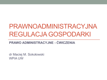 PRAWNOADMINISTRACYJNA REGULACJA GOSPODARKI PRAWO ADMINISTRACYJNE - ĆWICZENIA dr Maciej M. Sokołowski WPiA UW Regulacja Sensu largo: oddziaływanie na gospodarkę, tworzenie warunków do prowadzenia działalności gospodarczej. Sensu stricto: (regulatorów). działalność organów regulacyjnych Podejście wąskie Organy • Nadzór • Nadzór • Kontrola • Kontrola • Regulacja • Regulacja • Koordynacja • Kierownictwo • Koordynacja • Kierownictwo regulacyjne (regulatorzy) Organy regulacyjne (regulatorzy) Organy regulacyjne, agencje wykonawcze (ang. regulatory agencies, executive agencies) W Stanach Zjednoczonych, quasi-orzecznicza rządowa komisja ustanowiona w celu nadzorowania (ang. supervise) określonej dziedziny gospodarki, posiadająca prawo do wydawania własnych aktów prawnych, egzekwowania ich i decydowania w sprawach domniemanych naruszeń tych przepisów (the Oxford Companion to Law). Pierwsza Interstate Commerce Commission (1887 r.) powołana w celu regulacji kolei, przeciwdziałania nieuczciwym praktykom, ustalenia zasad bezpieczeństwa, eksperckiego wsparcia Kongresu w tematyce kolei. Podejście szerokie przed 1989 r. Oddziaływanie państwa na gospodarkę Przed 1989 r.: gospodarka nakazowo-rozdzielcza centralne planowanie dominacja państwowej własności czynników produkcji , monopole państwowe nierynkowa alokacja zasobów, gospodarka niedoborów Zmiana podejścia po 1989 r. wraz ze zmianą systemu politycznego Podejście szerokie po 1989 r. Oddziaływanie państwa na gospodarkę Zmiana zakresu, zasięgu i metody regulacji Określanie warunków prowadzenia działalności gospodarczej Oddziaływanie pośrednie na gospodarkę Regulowanie gospodarki poprzez wyspecjalizowane podmioty Decentralizacja zarządzania Prywatyzacja i komercjaliacja Prawo działalności gospodarczej Ustawa z dnia 23 grudnia 1988 r. o działalności gospodarczej Ustawa z dnia 19 listopada 1999 r. Prawo działalności gospodarczej Ustawa z dnia 2 lipca 2004 r. o swobodzie działalności gospodarczej Prawo działalności gospodarczej Chodziło o to, by wyrwać decyzje z rąk urzędników, którzy z wielu powodów czasem ukatrupiali rozpoczęcie działalności. Na podstawie tej ustawy w pierwszym roku – 1989 – powstało 3,5 mln przedsiębiorstw, a w następnym kolejny milion. To było coś nieprawdopodobnego. Nawet ja byłem zaskoczony. Mieczysław Wilczek (1932- ) minister przemysłu PRL 1988-89 Ustawa o działalności gospodarczej Ustawa o działalności gospodarczej Definicja działalności gospodarczej Definicja podmiotu gospodarczego Wolność gospodarcza Art. 4. Podmioty gospodarcze mogą w ramach prowadzonej działalności gospodarczej dokonywać czynności oraz działań, które nie są przez prawo zabronione. Art. 5. Podmiot gospodarczy może zatrudniać pracowników w nieograniczonej liczbie i bez pośrednictwa organów zatrudnienia. Ustawa o działalności gospodarczej Prowadzenie działalności gospodarczej przez osoby fizyczne i jednostki organizacyjne nieposiadające osobowości prawnej wymagało wpisu do ewidencji działalności gospodarczej. Dodatkowe źródła dochodu (uboczne zajęcia zarobkowe) zwolnienie z wpisu jeżeli dotyczyły domowego i m.in. wytwarzania gospodarczego nieprzetworzonych produktów oraz przedmiotów rękodzieła rolnych, użytku ludowego, ogrodniczych, osobistego, sprzedaży sadowniczych, hodowlanych). Zgłoszeniu do ewidencji nie podlegało m.in. podjęcie działalności wytwórczej w rolnictwie w zakresie produkcji roślinnej i zwierzęcej, podjęcie działalności gospodarczej przez osoby prawne, podjęcie działalności gospodarczej, która w myśl ustawy wymagała uzyskania koncesji, Ustawa o działalności gospodarczej Uzyskania koncesji wymagało m.in podjęcie działalności gospodarczej w zakresie: wydobywanie kopalin podlegających prawu górniczemu oraz poszukiwanie złóż tych kopalin; przetwórstwa i obrotu metalami szlachetnymi i kamieniami szlachetnymi; wytwarzania i obrotu materiałami wybuchowymi, bronią i amunicją; wyrobu, oczyszczania i odwadniania spirytusu, a także wyrobu wódek; wytwarzania wyrobów tytoniowych; transportu morskiego, lotniczego; prowadzenia aptek; obrotu dobrami kultury powstałymi przed dniem 9 maja 1945 r. Ustawa o swobodzie działalności gospodarczej Ustawa z dnia 2 lipca 2004 r. o swobodzie działalności gospodarczej (usdg) Art. 1. Ustawa reguluje podejmowanie, wykonywanie i zakończenie działalności gospodarczej na terytorium Rzeczypospolitej Polskiej oraz zadania organów w tym zakresie. Art. 6. ust. 1. Podejmowanie, wykonywanie i zakończenie działalności gospodarczej jest wolne dla każdego na równych prawach, z zachowaniem warunków określonych przepisami prawa. Definicja działalności gospodarczej (art. 2): zarobkowa działalność wytwórcza, budowlana, handlowa, usługowa oraz poszukiwanie, rozpoznawanie i wydobywanie kopalin ze złóż, a także działalność zawodowa, wykonywana w sposób zorganizowany i ciągły. USDG wyłączenia Przepisów ustawy nie stosuje się do: działalności wytwórczej w rolnictwie w zakresie upraw rolnych oraz chowu i hodowli zwierząt, ogrodnictwa, warzywnictwa, leśnictwa i rybactwa śródlądowego; wynajmowania przez rolników pokoi, sprzedaży posiłków domowych i świadczenia w gospodarstwach rolnych innych usług związanych z pobytem turystów; wyrobu wina przez producentów będących rolnikami wyrabiającymi mniej niż 100 hektolitrów wina w ciągu roku gospodarczego. USDG definicje Art. 4 (definicja przedsiębiorcy) i art. 5. organ koncesyjny – organ administracji publicznej upoważniony na podstawie ustawy do udzielania, odmowy udzielania, zmiany i cofania koncesji; działalność regulowana – działalność gospodarczą, której wykonywanie wymaga spełnienia szczególnych warunków, określonych przepisami prawa; właściwy organ – właściwy w sprawach podejmowania, wykonywania lub zakończenia działalności gospodarczej org
