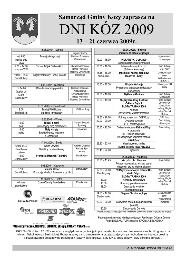 Samorząd Gminy Kozy zaprasza na DNI KÓZ 2009 13 – 21 czerwca 2009r. 13.06.2009r. - Sobota 20.06.2009r. - Sobota imprezy na placu targowym organizatorzy od 9.00 boisko przy CSW 9.00 – 14.00 Hala w CSW 10.00 – 17.00 Dom Kultury od 14.00 (zapisy od 13.00) Basen CSW 9.00 Stadion LKS 10.00 park 18.00 pałac 12.00-16.00 Świetlica w pałacu 16.00 Dom Kultury 17.00 Dom Kultury od rana przedszkole Centrum SportowoWidowiskowe Turniej piłki ręcznej Turniej Trójek Siatkarskich Międzynarodowy Turniej Taroka 14.06.2009r. - Niedziela Otwarte zawody pływackie Stowarzyszenie na Rzecz Promocji i Rozwoju Gminy Kozy taroczkarze organizatorzy 12.00 – 15.00 15.00 – 16.30 15.15 – 16.30 boisko LKS 16.30 – 17.30 Centrum SportowoWidowiskowe, Stowarzyszenie na Rzecz Promocji i Rozwoju Gminy Kozy 15.06.2009r. - Poniedziałek Turniej Piłki Nożnej dla dzieci i młodzieży 16.06.2009r. - Wtorek Biegaj z nami (rekreacyjny bieg przełajowy) Mały Książę Spektakl grupy teatralnej z Gimnazjum 17.06.2009r. - Środa Dzień Otwarty Świetlicy Środowiskowej Promocja Młodych Talentów 17.30 – 18.00 Gminny Ośrodek Pomocy Społecznej Międzynarodowy Festiwal Orkiestr Dętych ZŁOTA TRĄBKA 2009 Konkurs Artystycznej Musztry Paradnej 19.30 – 20.00 20.00 – 20.30 Pokazy sprawności OSP Kozy Dyktando Gminne Cz. II - rozstrzygnięcie Gwiazda wieczoru Kabaret Długi w programie pt: „7 mitów głównych” ze specjalnym udziałem zespołu Nikiel Band Muzyka, rytm, taniec Występ zespołu NEW ANGELS Fajerwerki 20.30 – 22.30 22.30 – 23.45 23.45 – 24.00 Dom Kultury 10.00 – 11.45 18.06.2009r. - Czwartek Semper Melior (Promocja Młodych Talentów – cz. II) 19.06.2009r. - Piątek Dzień Otwarty Przedszkola Dom Kultury Przedszkole Witajcie Wakacje Prezentacja artystyczna młodzieży koziańskiej Dyktando Gminne 18.00 – 19.30 LKS Orzeł Kozy Szkolny Związek Sportowy Gimnazjum PIŁKARZYKI CUP 2009 Turniej absolwentów gimnazjum Zabawy dla najmłodszych (Zabawy, konkursy) Mecz piłki nożnej oldbojów Mosovce - Kozy 12.00 – 20.00 Plac targowy 13.00 16.30 18.00 14.00 – 17.00 Start w parku 20.00 – 20.30 20.30 21.06.2009r. - Niedziela Nie tylko dla chłopców Pokazy modelarskie, wyścigi samochodowe, gry na wielkim ekranie VI Międzynarodowy Festiwal Orkiestr Dętych ZŁOTA TRĄBKA 2009 Koncerty konkursowe Koncerty pozakonkursowe Ogłoszenie wyników i koncert laureata Bieg na Chrobaczą Łąkę Losowanie nagród dla publiczności (loteria) Zakończenie Dni Kóz Gimnzazjum Dom Kultury, OSP Kozy Centrum SportowoWidowiskowe, LKS Orzeł Gimnazjum, LO Kozy Dom Kultury, Gimnazjum Polski Związek Chórów i Orkiestr, Dom Kultury, Regionalny Ośrodek Kultury OSP Kozy Dom Kultury, Gimnazjum Dom Kultury Dom Kultury Polski Związek Chórów i Orkiestr, Dom Kultury, Regionalny Ośrodek Kultury Centrum SportowoWidowiskowe Harcerze Organizatorzy zastrzegają sobie możliwość dokonania zmian w programie imprez. Patronat medialny nad Międzynarodowym Festiwalem Orkiestr Dętych: Radio BIELSKO, TVP Katowice, KRONIKA BESKIDZKA Walenty Frączek, BIURPOL, LITGRAF, sklepy: EWANT, AVANS i inni UWAGA: W dniach 20 i 21 czerwca ze względu na organizację imprez wystąpią czasowe utrudnienia w ruchu drogowym na ulicach Szkolnej oraz Beskidzkiej. Przepraszamy za to utrudnienie, a przyjeżdżających samochodami na imprezy prosimy o pozostawianie pojazdów na parkingach (dawny plac targowy, przy SP 2, obok poczty i przy ośrodku zdrowia). KOZIAŃSKIE WIADOMOŚCI 15 DNI KÓZ – regulaminy, opisy imprez… TURNIEJ TRÓJEK SIATKARSKICH MIESZANYCH (DNI KÓZ sobota 13.06.2009r.) CEL IMPREZY: Popularyzacja rekreacyjnej piłki siatkowej. TERMIN I MIEJSCE: 13 czerwca 2009, Hala Sportowa CSW w Kozach, godz. 9.00 (zapisy od godz. 8.30). ORGANIZATOR: Stowarzyszenie Na Rzecz Promocji i Rozwoju Gminy Kozy i Centrum Sportowo-Widowiskowe w Kozach REGULAMIN: 1. W zawodach biorą udział 3 osobowe zespoły mieszane ( kobiety i mężczyźni). 2. Wpisowe w kwocie 2 zł od zawodnika. 3. Zawodnicy poniżej 18 roku życia muszą przedstawić zgodę rodziców na udział w zawodach. 4. Organizator nie ubezpiecza zawodników (ewentualne ubezpieczenia - we własnym zakresie). 5. Turniej zostanie rozegrany w dwóch kategoriach wiekowych: do lat 16 i powyżej lat 16. 6. System rozgrywek – losowanie grup i ilość setów w meczu oraz punktów w setach podobnie jak i system rozegrania finałów zostaną ustalone w dniu zawodów i są uzależnione od ilości zgłoszonych drużyn. 7. Każda z drużyn otrzyma pamiątkowy dyplom, a trzy pierwsze drużyny dodatkowo nagrody rzeczowe. ORGANIZATOR nie ubezpiecza uczestników i nie ponosi odpowiedzialności za ewentualne urazy poniesione podczas turnieju przez zawodników. Organizatorzy: Piotr Kubiczek, Adam Wybituła, Krzysztof Mleczko. nad 1 liną, pod drugą liną, nad trzecią liną itd. konkurencję kończymy wyjściem na brzeg po drugiej stronie basenu. Ostatni zawodnik odpada z walki, pozostali startują aż do wyłonienia zwycięzcy. W zależności od ilości zgłoszeń – start wspólny lub podział na grupy. NAGRODY: Każdy z uczestników otrzyma koszulkę, dyplom i coś słodkiego. Za zajęcie miejsca od 1 do 3 nagrody rzeczowe. BIEG REKREACYJNY (DNI KÓZ wtorek, 16.06.2009r.) Organizator : Zarząd Gminny SZS w Kozach Cel: Popularyzacja biegania wśród przedszkolaków, dzieci i młodzieży szkolnej – promocja zdrowego stylu życia. Termin : 16 czerwca 2009 roku Miejsce : Park przed pałacem Godzina startu: 10.00 (zakończenie ok. godz. 12.30) Program biegów : Nr Godzina Płeć Kategoria Rocznik Dystans /m I 10.00 K/M Przedszkole 2004/05 100m II 10.15 K/M Przedszkole 2002/03 200m II 10.30 K/M Szkoły podstawowe 00/01 Kl. I - II 300 IV 10.45 K/M Szkoły podstawowe 98/99 Kl. III –IV 400 V 11.00 K Szkoły podstawowe 96/97 Kl. V –VI 600 VI 11.15 M Szkoły podstawowe 96/97 kl. V -VI 800 VI 11.30 K Gimnazjum 93/95 1000 VII 11.45 M Gimnazjum 93/95 1500 VIII 12.00 K Szkoła Średnia 92 i st
