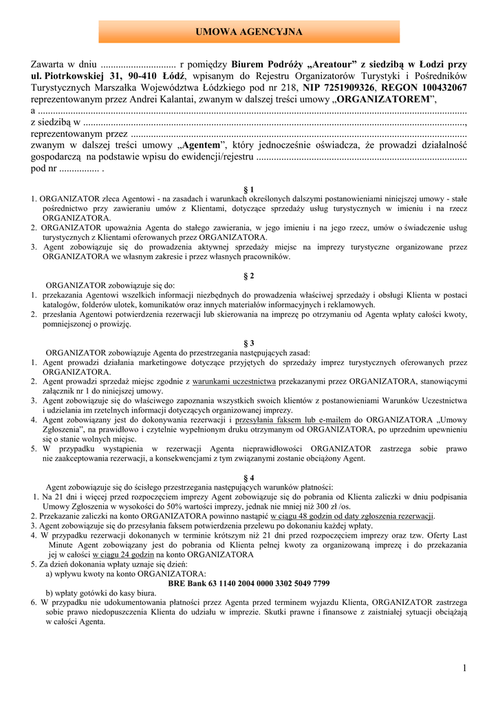 UMOWA AGENCYJNA Zawarta w dniu .............................. r pomiędzy Biurem PodróŜy „Areatour” z siedzibą w Łodzi przy ul. Piotrkowskiej 31, 90-410 Łódź, wpisanym do Rejestru Organizatorów Turystyki i Pośredników Turystycznych Marszałka Województwa Łódzkiego pod nr 218, NIP 7251909326, REGON 100432067 reprezentowanym przez Andrei Kalantai, zwanym w dalszej treści umowy „ORGANIZATOREM”, a ........................................................................................................................................................................... z siedzibą w ........................................................................................................................................................, reprezentowanym przez ...................................................................................................................................... zwanym w dalszej treści umowy „Agentem”, który jednocześnie oświadcza, Ŝe prowadzi działalność gospodarczą na podstawie wpisu do ewidencji/rejestru .................................................................................... pod nr ................ . §1 1. ORGANIZATOR zleca Agentowi - na zasadach i warunkach określonych dalszymi postanowieniami niniejszej umowy - stałe pośrednictwo przy zawieraniu umów z Klientami, dotyczące sprzedaŜy usług turystycznych w imieniu i na rzecz ORGANIZATORA. 2. ORGANIZATOR upowaŜnia Agenta do stałego zawierania, w jego imieniu i na jego rzecz, umów o świadczenie usług turystycznych z Klientami oferowanych przez ORGANIZATORA. 3. Agent zobowiązuje się do prowadzenia aktywnej sprzedaŜy miejsc na imprezy turystyczne organizowane przez ORGANIZATORA we własnym zakresie i przez własnych pracowników. §2 ORGANIZATOR zobowiązuje się do: 1. przekazania Agentowi wszelkich informacji niezbędnych do prowadzenia właściwej sprzedaŜy i obsługi Klienta w postaci katalogów, folderów ulotek, komunikatów oraz innych materiałów informacyjnych i reklamowych. 2. przesłania Agentowi potwierdzenia rezerwacji lub skierowania na imprezę po otrzymaniu od Agenta wpłaty całości kwoty, pomniejszonej o prowizję. 1. 2. 3. 4. 5. §3 ORGANIZATOR zobowiązuje Agenta do przestrzegania następujących zasad: Agent prowadzi działania marketingowe dotyczące przyjętych do sprzedaŜy imprez turystycznych oferowanych przez ORGANIZATORA. Agent prowadzi sprzedaŜ miejsc zgodnie z warunkami uczestnictwa przekazanymi przez ORGANIZATORA, stanowiącymi załącznik nr 1 do niniejszej umowy. Agent zobowiązuje się do właściwego zapoznania wszystkich swoich klientów z postanowieniami Warunków Uczestnictwa i udzielania im rzetelnych informacji dotyczących organizowanej imprezy. Agent zobowiązany jest do dokonywania rezerwacji i przesyłania faksem lub e-mailem do ORGANIZATORA „Umowy Zgłoszenia”, na prawidłowo i czytelnie wypełnionym druku otrzymanym od ORGANIZATORA, po uprzednim upewnieniu się o stanie wolnych miejsc. W przypadku wystąpienia w rezerwacji Agenta nieprawidłowości ORGANIZATOR zastrzega sobie prawo nie zaakceptowania rezerwacji, a konsekwencjami z tym związanymi zostanie obciąŜony Agent. §4 Agent zobowiązuje się do ścisłego przestrzegania następujących warunków płatności: 1. Na 21 dni i więcej przed rozpoczęciem imprezy Agent zobowiązuje się do pobrania od Klienta zaliczki w dniu podpisania Umowy Zgłoszenia w wysokości do 50% wartości imprezy, jednak nie mniej niŜ 300 zł /os. 2. Przekazanie zaliczki na konto ORGANIZATORA powinno nastąpić w ciągu 48 godzin od daty zgłoszenia rezerwacji. 3. Agent zobowiązuje się do przesyłania faksem potwierdzenia przelewu po dokonaniu kaŜdej wpłaty. 4. W przypadku rezerwacji dokonanych w terminie krótszym niŜ 21 dni przed rozpoczęciem imprezy oraz tzw. Oferty Last Minute Agent zobowiązany jest do pobrania od Klienta pełnej kwoty za organizowaną imprezę i do przekazania jej w całości w ciągu 24 godzin na konto ORGANIZATORA 5. Za dzień dokonania wpłaty uznaje się dzień: a) wpływu kwoty na konto ORGANIZATORA: BRE Bank 63 1140 2004 0000 3302 5049 7799 b) wpłaty gotówki do kasy biura. 6. W przypadku nie udokumentowania płatności przez Agenta przed terminem wyjazdu Klienta, ORGANIZATOR zastrzega sobie prawo niedopuszczenia Klienta do udziału w imprezie. Skutki prawne i finansowe z zaistniałej sytuacji obciąŜają w całości Agenta. 1 §5 1. Agent otrzymuje za zrealizowane usługi prowizję, której wysokość określona jest w Tabeli Stawek Prowizyjnych - załączniku nr 2 niniejszej umowy - chyba, Ŝe osobny komunikat do danej imprezy stanowi inaczej. 2. W dniu dokonania przez Klienta całkowitej wpłaty – Agent przekazuje wpłatę pomniejszoną o prowizje na konto ORGANIZATORA i równocześnie wystawia fakturę VAT na kwotę brutto przysługującej prowizji. Faktura na prowizję zostanie przekazana do ORGANIZATORA w terminie do 14 dni. 3. Nie dostarczenie faktury prowizyjnej powoduje utratę prawa do prowizji i zobowiązuje Agenta do przekazania ORGANIZATOROWI potrąconej prowizji. §6 1. Agent zobowiązany jest w powiadomić (telefon, fax, e-mail) ORGANIZATORA, w trybie natychmiastowym, o wpłynięciu rezygnacji Uczestnika, zgodnie z Warunkami Uczestnictwa wg zał. Nr 1 do niniejszej umowy. 2. Rezygnacja z imprezy następuje w momencie złoŜenia przez Uczestnika, a następnie przez Agenta pisemnego oświadczenia o rezygnacji z udziału w imprezie turystycznej §7 W przypadku anulowania imprezy ORGANIZATOR powiadamia o tym fakcie Agenta, który zawiadamia Uczestników. Następnie ORGANIZATOR w ciągu 14 dni dokonuje zwrotu przekazanej przez Agenta wpłaty, a ten przekazuje ją niezwłocznie Klientowi. §8 W przypadkach: rezygnacji Uczestnika z udziału w imprezie lub anulowania imprezy przez ORGANIZATORA, prowizja Agentowi nie przysługuje. §9 1. Agent nie jest upowaŜniony do zlecania sprzedaŜy imprez ORGANIZATORA innym stronom. 2. A