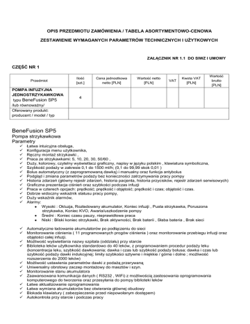 OPIS PRZEDMIOTU ZAMÓWIENIA / TABELA ASORTYMENTOWO-CENOWA ZESTAWIENIE WYMAGANYCH PARAMETRÓW TECHNICZNYCH I UŻYTKOWYCH ZAŁĄCZNIK NR 1.1 DO SIWZ I UMOWY CZĘŚĆ NR 1 Przedmiot POMPA INFUZYJNA JEDNOSTRZYKAWKOWA typu BeneFusion SP5 /lub równoważny/ Oferowany produkt: producent / model / typ Ilość [szt.] Cena jednostkowa netto [PLN] Wartość netto [PLN] VAT Kwota VAT [PLN] Wartość brutto [PLN] 4 BeneFusion SP5 Pompa strzykawkowa Parametry Łatwa intuicyjna obsługa, Konfiguracja menu użytkownika, Ręczny montaż strzykawki , Praca ze strzykawkami: 5, 10, 20, 30, 50/60 , Duży, kolorowy, czytelny wyświetlacz graficzny, napisy w języku polskim , klawiatura symboliczna, Szybkość podaży w zakresie 0,1 do 1500 ml/h; (0,1 do 99,99 skok 0,01 ) Bolus automatyczny (z zaprogramowaną dawką) i manualny oraz funkcja antybolus Podgląd i zmiana parametrów podaży bez konieczności zatrzymywania pracy pompy Historia zdarzeń (główny rejestr zdarzeń, historia pacjenta, historia przycisków, rejestr zdarzeń serwisowych) Graficzna prezentacja ciśnień oraz szybkości podczas infuzji Praca w czterech opcjach: prędkość; prędkość i objętość; prędkość i czas; objętość i czas. Dobrze widoczny wskaźnik statusu pracy pompy, Duży wskaźnik alarmów, Alarmy: Wysoki : Okluzja, Rozładowany akumulator, Koniec infuzji , Pusta strzykawka, Poruszona strzykawka, Koniec KVO, Awaria/uszkodzenie pompy Średni : Koniec czasu pauzy, nieprawidłowa praca Niski : Bliski koniec strzykawki, Brak aktywności, Brak baterii , Słaba bateria , Brak sieci Automatyczne ładowanie akumulatorów po podłączeniu do sieci Monitorowanie ciśnienia ( 11 programowanych progów ciśnienia ) oraz monitorowanie przebiegu infuzji oraz objętości całej infuzji. Możliwość wyświetlania nazwy szpitala (oddziału) przy starcie Biblioteka leków użytkownika standardowo do 40 leków, z programowaniem procedur podaży leku (koncentracja leku, szybkość dawkowania; dawka i czas lub szybkość podaży bolusa; dawka i czas lub szybkość podaży dawki indukcyjnej; limity szybkości sztywne i miękkie / górne i dolne ; możliwość rozszerzenia do 2000 leków) Możliwość ustawienia parametrów dawki z podażą przerywaną Uniwersalny obrotowy zaczep montażowy do masztów i szyn. Monitorowanie stanu akumulatora Zaawansowana komunikacja danych ( RS232 , WiFi) z możliwością zastosowania oprogramowania komputerowego do tworzenia oraz przesyłania do pompy biblioteki leków Łatwe aktualizowanie oprogramowania Łatwa wymiana akumulatorów bez otwierania głównej obudowy Blokada klawiatury ( zabezpieczenie przed niepowołanym dostępem) Autokontrola przy starcie i podczas pracy Dane techniczne Zakres szybkości infuzji : 0,1 – 1500 ml/h Strzykawka 5 ml : 0,1-100 ml/h; 10 m l : 0,1-200 ml/h; 20 ml : 0,1 – 400 ml/h; 30 ml : 0,1 – 600 ml/h; 50/60 ml : 0,1 – 1500 ml/h; Jednostki dawki : ml, g, mg, mcg, ng, IU / min lub h Objętość do podania (VTBI) : 0,1 -9999,99 ml Skok 0,01 ml Komunikacja : RS232, WiFi Zakres szybkości bolusa: 0,1 – 1500 ml/h zależnie od zastosowanej strzykawki ; dla 50 ml domyślna 800 ml/h Objętość bolusa: 0,1 – 9999,99 ml Zakres szybkości wypełnienia : lub akumulator litowo-jonowy 7,4 VDC /4800mAh 0,1 do 1500 ml/h Dokładność : Dla przepływu ≥1ml/h ≤± 2% Dla przepływu <1 ml/h ≤± 5% Poziomy ciśnienia okluzji : 11 poziomów w zakresie 150 mmHg do 975 mmHg Wartość domyślna 450 mmHg Zmiana progu ciśnienia okluzji bez przerywania infuzji Ładowanie baterii: 6 h do 100 % Ochrona : IP23 Bezpieczeństwo elektryczne : klasa I, CF Odporna na defibrylację Programowany czas : 1 s- 99:59:59 (h:m:s) Tryby podstawowe: Tryb Wlew; Tryb Czas; Tryb Wagi Pacjenta. Tryby zaawansowane (opcjonalne) : Tryb Indukcji; Tryb Sekwencyjny ; Tryb TIVA Tryb Ramp Up/Down (TPN) ; Tryb Mikroinfuzji; KVO (funkcja drożności naczyń) 0,1 – 5 ml/h Krok 0,1 ml/h ; domyślna 1 ml/h Rejestr zdarzeń : 2000 Serwis log: historia błędów Wyświetlacz: kolorowy, graficzny LCD 3,5”; format 16:9 Przywołanie pielęgniarki Zasilanie: wbudowany zasilacz 100-240 VAC , 50/60 Hz , 0,53-0,28A (lub opcja) 10-16 VDC / 2,25 do 1,5 A Bateria: 10 h@5 ml/h ( w 20 st C ) Wskaźnik stanu naładowania Wymiary (WxHxD): 295 x 87 x 174 mm Waga z akumulatorem : <2,5 kg Możliwości instalacji : Stawiana na blacie Stacja dokująca Mocowana do stacji dokującej jedną ręką, bez konieczności użycia narzędzi Dołączany uchwyt do przenoszenia Obrotowy uchwyt montażowy Szyna Draegera CE znak – zgodnie z dyrektywą 93/42/EEC IEC 60601-(1,1-1,1-2,1-4,1-8,2-24) Warunki pracy : - Temperatura : 5 do 40 st C - Wilgotność :15 do 95% bez kondensacji pary wodnej - ciśnienie atm. 57kPa – 106 kPa Temperatura przechowywania: – 20 do 60 st C Urządzenie urządzenie fabrycznie nowe, nie powystawowe, nie prototypowe Rok produkcji 2016 Okres gwarancji minimum 24 miesiące od daty podpisania protokołu odbioru. Oferowane urządzenie musi spełniać wszystkie powyższe parametry. Nie spełnienie choćby jednego z nich spowoduje odrzucenie oferty. Dokumenty : Certyfikat CE wystawiony przez niezależną jednostkę notyfikującą lub Deklaracja zgodności z CE wystawiona przez producenta urządzeń, a w przypadku wyrobów medycznych dokumenty potwierdzające dopuszczenie urządzenia do obrotu na terytorium Rzeczpospolitej Polskiej, zgodnie z wymogami ustawy z dnia 20 maja 2010 r. o wyrobach medycznych (Dz. U. z 2010 nr 107 poz. 679 ze zm.) Warunki gwarancji zgodne z SIWZ umową oraz ofertą. Wszelkie okresowe przeglądy urządzeń w okresie gwarancji na koszt Wykonawcy. Urządzenie podlega okresowym przeglądom zgodnie z ustawą z dnia 20 maja 2010 r. o wyrobach medycznych (Dz. U. z 2010 nr 107 poz. 679 ze zm.): TAK / NIE (niepotrzebne skreślić) Liczba okresowych przeglądów technicznych w ciągu roku: ……….(wpisać liczbę). Użycie w opisie przedmiotu zamówienia/tabeli asortymentowo cenowej nazw handlowych każ