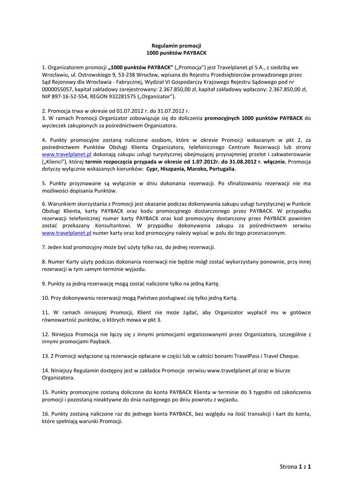 Regulamin promocji 1000 punktów PAYBACK 1. Organizatorem promocji „1000 punktów PAYBACK” („Promocja”) jest Travelplanet.pl S.A., z siedzibą we Wrocławiu, ul. Ostrowskiego 9, 53-238 Wrocław, wpisana do Rejestru Przedsiębiorców prowadzonego przez Sąd Rejonowy dla Wrocławia - Fabrycznej, Wydział VI Gospodarczy Krajowego Rejestru Sądowego pod nr 0000055057, kapitał zakładowy zarejestrowany: 2.367.850,00 zł, kapitał zakładowy wpłacony: 2.367.850,00 zł, NIP 897-16-52-554, REGON 932281575 („Organizator”). 2. Promocja trwa w okresie od 01.07.2012 r. do 31.07.2012 r. 3. W ramach Promocji Organizator zobowiązuje się do doliczenia promocyjnych 1000 punktów PAYBACK do wycieczek zakupionych za pośrednictwem Organizatora. 4. Punkty promocyjne zostaną naliczone osobom, które w okresie Promocji wskazanym w pkt 2, za pośrednictwem Punktów Obsługi Klienta Organizatora, telefonicznego Centrum Rezerwacji lub strony www.travelplanet.pl dokonają zakupu usługi turystycznej obejmującej przynajmniej przelot i zakwaterowanie („Klienci”), której termin rozpoczęcia przypada w okresie od 1.07.2012r. do 31.08.2012 r. włącznie. Promocja dotyczy wyłącznie wskazanych kierunków: Cypr, Hiszpania, Maroko, Portugalia. 5. Punkty przyznawane są wyłącznie w dniu dokonania rezerwacji. Po sfinalizowaniu rezerwacji nie ma możliwości dopisania Punktów. 6. Warunkiem skorzystania z Promocji jest okazanie podczas dokonywania zakupu usługi turystycznej w Punkcie Obsługi Klienta, karty PAYBACK oraz kodu promocyjnego dostarczonego przez PAYBACK. W przypadku rezerwacji telefonicznej numer karty PAYBACK oraz kod promocyjny dostarczony przez PAYBACK powinien zostać przekazany Konsultantowi. W przypadku dokonywania zakupu za pośrednictwem serwisu www.travelplanet.pl numer karty oraz kod promocyjny należy wpisać w polu do tego przeznaczonym. 7. Jeden kod promocyjny może być użyty tylko raz, do jednej rezerwacji. 8. Numer Karty użyty podczas dokonania rezerwacji nie będzie mógł zostać wykorzystany ponownie, przy innej rezerwacji w tym samym terminie wyjazdu. 9. Punkty za jedną rezerwację mogą zostać naliczone tylko na jedną Kartę. 10. Przy dokonywaniu rezerwacji mogą Państwo posługiwać się tylko jedną Kartą. 11. W ramach niniejszej Promocji, Klient nie może żądać, aby Organizator wypłacił mu w gotówce równowartość punktów, o których mowa w pkt 3. 12. Niniejsza Promocja nie łączy się z innymi promocjami organizowanymi przez Organizatora, szczególnie z innymi promocjami Payback. 13. Z Promocji wyłączone są rezerwacje opłacane w części lub w całości bonami TravelPass i Travel Cheque. 14. Niniejszy Regulamin dostępny jest w zakładce Promocje serwisu www.travelplanet.pl oraz w biurze Organizatora. 15. Punkty promocyjne zostaną doliczone do konta PAYBACK Klienta w terminie do 3 tygodni od zakończenia promocji i pozostaną nieaktywne do dnia następnego po dniu powrotu z wyjazdu. 16. Punkty zostaną naliczone raz do jednego konta PAYBACK, bez względu na ilość transakcji i kart do konta, które spełniają warunki Promocji. Strona 1 z 1