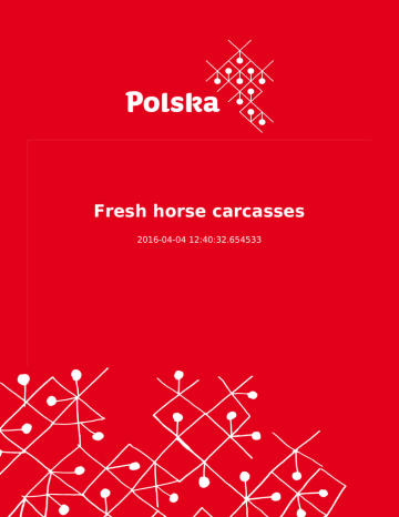 Fresh horse carcasses 2016-04-04 12:40:32.654533 2 Esta oferta no constituye información comercial Adres instytucji/firmy ogłaszającej ofertę OPI SPÓŁKA Z OGRANICZONĄ ODPOWIEDZIALNOŚCIĄ 00-382 WARSZAWA . SOLEC 81B A-51 . Poland Persona de contacto Marcin Urbański [email protected] Tel: 0048 539441133 www.opi-poland.pl Descripción de la orden We could supply the fresh horse half-carcasses in the following weights and prices: 100-160kg -> 1,87 EUR/kg 160-200kg -> 2,15 EUR/kg 200+ and more kg -> 2,24 EUR/kg The prices include the transport costs to the place in the European Union indicated by the client. All carcasses have oval stamp with permission on the EU market. Full documentation including animal passports and microchips. Nabywcy z zagranicy ● ● ● ● ● ● ● Austria Belgia Dania Finlandia Francja Hiszpania Hongkong 3 ● ● ● ● ● ● ● ● ● Królestwo Niderlandów Luksemburg Niemcy Norwegia Portugalia Szwajcaria Szwecja Turcja Włochy CPV ● ● ● ● ● ● Productos de origen animal, carne y productos cárnicos Carne Carne de caballo, asno, mulo o burdégano Carne de caballo Productos cárnicos Carne para embutidos Adjuntos 8.jpg Tipo de oferta venta Fecha límite para la recepción de las ofertas 01.10.2016 4 Válida desde 04.04.2016 Ramas Rolnictwo i leśnictwo Mięso Przetwórstwo spożywcze Wyroby z mięsa i ryb El comprador extranjero SÍ 5