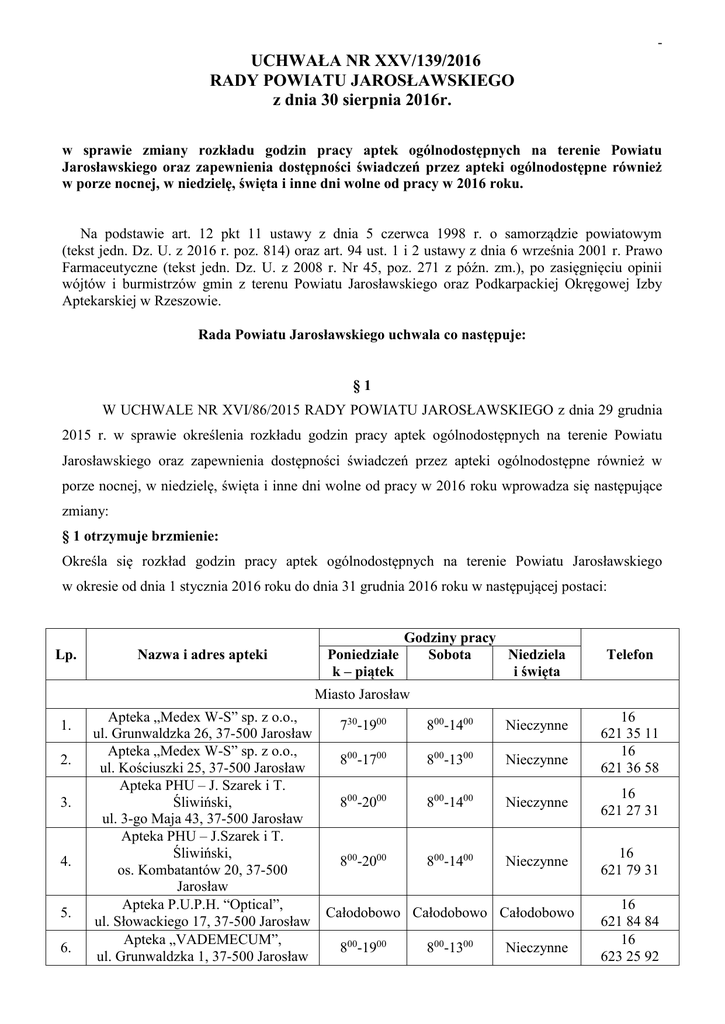 - UCHWAŁA NR XXV/139/2016 RADY POWIATU JAROSŁAWSKIEGO z dnia 30 sierpnia 2016r. w sprawie zmiany rozkładu godzin pracy aptek ogólnodostępnych na terenie Powiatu Jarosławskiego oraz zapewnienia dostępności świadczeń przez apteki ogólnodostępne również w porze nocnej, w niedzielę, święta i inne dni wolne od pracy w 2016 roku. Na podstawie art. 12 pkt 11 ustawy z dnia 5 czerwca 1998 r. o samorządzie powiatowym (tekst jedn. Dz. U. z 2016 r. poz. 814) oraz art. 94 ust. 1 i 2 ustawy z dnia 6 września 2001 r. Prawo Farmaceutyczne (tekst jedn. Dz. U. z 2008 r. Nr 45, poz. 271 z późn. zm.), po zasięgnięciu opinii wójtów i burmistrzów gmin z terenu Powiatu Jarosławskiego oraz Podkarpackiej Okręgowej Izby Aptekarskiej w Rzeszowie. Rada Powiatu Jarosławskiego uchwala co następuje: §1 W UCHWALE NR XVI/86/2015 RADY POWIATU JAROSŁAWSKIEGO z dnia 29 grudnia 2015 r. w sprawie określenia rozkładu godzin pracy aptek ogólnodostępnych na terenie Powiatu Jarosławskiego oraz zapewnienia dostępności świadczeń przez apteki ogólnodostępne również w porze nocnej, w niedzielę, święta i inne dni wolne od pracy w 2016 roku wprowadza się następujące zmiany: § 1 otrzymuje brzmienie: Określa się rozkład godzin pracy aptek ogólnodostępnych na terenie Powiatu Jarosławskiego w okresie od dnia 1 stycznia 2016 roku do dnia 31 grudnia 2016 roku w następującej postaci: Lp. Nazwa i adres apteki Poniedziałe k – piątek Godziny pracy Sobota Niedziela i święta Telefon Miasto Jarosław 1. 2. 3. 4. 5. 6. Apteka „Medex W-S” sp. z o.o., 730-1900 800-1400 Nieczynne ul. Grunwaldzka 26, 37-500 Jarosław Apteka „Medex W-S” sp. z o.o., 800-1700 800-1300 Nieczynne ul. Kościuszki 25, 37-500 Jarosław Apteka PHU – J. Szarek i T. Śliwiński, 800-2000 800-1400 Nieczynne ul. 3-go Maja 43, 37-500 Jarosław Apteka PHU – J.Szarek i T. Śliwiński, 800-2000 800-1400 Nieczynne os. Kombatantów 20, 37-500 Jarosław Apteka P.U.P.H. “Optical”, Całodobowo Całodobowo Całodobowo ul. Słowackiego 17, 37-500 Jarosław Apteka „VADEMECUM”, 800-1900 800-1300 Nieczynne ul. Grunwaldzka 1, 37-500 Jarosław 16 621 35 11 16 621 36 58 16 621 27 31 16 621 79 31 16 621 84 84 16 623 25 92 7. 8. 9. 10. 11. 12. 13. 14. 15. 16. 17. 18. 19. 20. 21. 22. 23. 24. 25. 26. 27. 28. Apteka “Remedium” sp. j., 800-2000 800-1800 Nieczynne ul. Kraszewskiego 9, 37-500 Jarosław Apteka „ADAFARM” sp. z o.o., 800-2000 800-1400 Nieczynne ul. Lisińskiego 10, 37-500 Jarosław Apteka „Dr Max”, 800-1900 800-1400 Nieczynne ul. Rynek 11, 37-500 Jarosław Apteka „Dr Max”, 800-2100 800-1400 Nieczynne ul. Kraszewskiego 5, 37-500 Jarosław Apteka „Dr Max”, Całodobowo Całodobowo Całodobowo os. Tysiąclecia 12, 37-500 Jarosław Apteka „Dr Max”, 800-1900 800-1400 Nieczynne ul. Witosa 2, 37-500 Jarosław Apteka „ALONA” s. c., 800-1800 800-1400 Nieczynne ul. Sikorskiego 2 a, 37-500 Jarosław Apteka „Medex” sp. z o.o., 800-2000 800-1800 Nieczynne ul. Kościuszki 29 a, 37-500 Jarosław Apteka „Medex” sp. z o.o., ul. Kraszewskiego 24 a, 37-500 730-2000 800-1500 Nieczynne Jarosław Apteka “Medex” sp. j., ul. Kraszewskiego 11, 37-500 800-1900 800-1500 Nieczynne Jarosław Apteka „Medex” sp. j., 730-1900 730-1400 Nieczynne ul. Grodzka 3, 37-500 Jarosław Apteka „Medex” sp. j., 800-2100 800-2000 1000-1800 ul. Traugutta 13, 37-500 Jarosław Apteka “NOVA” sp. j., 730-2000 800-1600 Nieczynne ul. 3-go Maja 65, 37-500 Jarosław Apteka „SKAW-MAR”, 730-1800 800-1400 Nieczynne ul. Słowackiego 38, 37-500 Jarosław Apteka ”Medex” sp. j., 700-2100 700-2000 900-1800 ul. Pruchnicka 6 a, 37-500 Jarosław Apteka “Aspirynka” sp. j., 800-2000 800-2000 Nieczynne ul. Jana Pawła II 21, 37-500 Jarosław Apteka „SKAW-MAR”, 730-1500 Nieczynne Nieczynne ul. Kościuszki 18, 37-500 Jarosław Apteka „ALEXMED” ul. L. Siemieńskiego 7, 37-500 800-1900 Nieczynne Nieczynne Jarosław Apteka „Słoneczna” 700-2100 800-1500 Nieczynne ul. Grunwaldzka 11, 37-500 Jarosław Apteka Rodzinna ul. Poniatowskiego 53, 37-500 730-1900 800-1400 Nieczynne Jarosław Apteka Galicja 730-2000 800-1500 Nieczynne ul. Kalinki 2, 37-500 Jarosław Apteka „SKAW-MAR” 730-1700 Nieczynne Nieczynne ul. Słowackiego 29, 37-500 Jarosław 16 623 07 11 16 624 28 60 16 624 24 00 16 624 24 10 16 624 24 20 16 627 30 70 16 621 59 19 16 621 15 06 16 621 06 06 16 621 62 75 16 621 77 88 16 623 00 58 16 621 14 08 16 732 37 03 16 623 10 05 16 621 14 45 16 621 05 28 16 621 73 25 16 621 71 11 16 621 08 88 16 621 74 92 16 621 37 37 Miasto Pruchnik 1. „Apteka prywatna” T. Reizer, ul. Jana Pawła II 3, 37-560 Pruchnik Pn., Śr. 800-1600 Wt., Cz. , Pt. 800-1800 800-1400 Nieczynne 16 628 98 60 2. Apteka „Eliksir” Centrum Tanich Leków, 800-1900 900-1300 Nieczynne 16 628 81 75 3. ul. B. Markiewicza 11a, 37-560 Pruchnik Apteka „Medex” ul. Słoneczna 2, 37-560 Pruchnik 800-1300 Nieczynne 16 621 82 64 730-2000 730-1500 800-1400 16 624 11 66 800-1800 800-1300 Nieczynne 16 628 13 75 700-2000 800-1300 Nieczynne 700-2100 700-1600 Nieczynne Nieczynne Nieczynne 607 440 705 Nieczynne Nieczynne 16 628 03 65 Nieczynne Nieczynne 16 621 86 93 Nieczynne Nieczynne 16 621 90 61 Nieczynne Nieczynne 16 623 40 92 Nieczynne Nieczynne 16 622 13 81 800-1800 Nieczynne Nieczynne 1000-1400 Nieczynne Nieczynne 800-1800 Miasto Radymno 1. 2. 3. 4. Apteka Rodzinna ul. Rynek 23, 37-550 Radymno Apteka Leków Gotowych Beata Franus, ul. Legionów 4 a, 37-550 Radymno Apteka „Medika”, ul. Legionów 1, 37-550 Radymno Apteka „Różana” ul. Rynek 11, 37-550 Radymno 16 623 40 92 16 307 32 75 Gmina Chłopice 1. Pn., Wt., Śr. 800-1630 Cz., Pt. 800-1500 Apteka mgr farm. Zofia Gaweł, Chłopice 235, 37-561 Chłopice Gmina Jarosław 1. Punkt Apteczny Medex, Wólka Pełkińska 282, 37-511 Wólka Pełkińska 930 - 1800 Gmina Laszki 1. Apteka „Melisa” Laszki 35 A, 37-543 Laszki 830-1730 Gmina Pawłosiów 1. Pn. 800-1800 Wt. 800-1500 Śr. 800-1