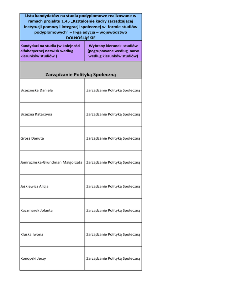 Lista kandydatów na studia podyplomowe realizowane w ramach projektu 1.45 „Kształcenie kadry zarządzającej instytucji pomocy i integracji społecznej w formie studiów podyplomowych” – II-ga edycja – województwo DOLNOŚLĄSKIE Kandydaci na studia (w kolejności alfabetycznej nazwisk według kierunków studiów ) Wybrany kierunek studiów (pogrupowane według nazw według kierunków studiów) Zarządzanie Polityką Społeczną Brzezioska Daniela Zarządzanie Polityką Społeczną Brzeźna Katarzyna Zarządzanie Polityką Społeczną Gross Danuta Zarządzanie Polityką Społeczną Jamrozioska-Grundman Małgorzata Zarządzanie Polityką Społeczną Jaśkiewicz Alicja Zarządzanie Polityką Społeczną Kaczmarek Jolanta Zarządzanie Polityką Społeczną Kluska Iwona Zarządzanie Polityką Społeczną Konopski Jerzy Zarządzanie Polityką Społeczną Kręzel Jadwiga Zarządzanie Polityką Społeczną Lorenc Zyta Zarządzanie Polityką Społeczną Macioszek Magdalena zarządzanie polityką społeczną, Matthaus Małgorzata Zarządzanie Polityką Społeczną Matysiak-Dawidowska Sylwia Zarządzanie Polityką Społeczną Nowak Lucyna Zarządzanie Polityką Społeczną Ryż Eliza Zarządzanie Polityką Społeczną Sikora Agnieszka Zarządzanie Polityką Społeczną Starzyk Lidia Anna Zarządzanie Polityką Społeczną Szawan-Sikorska Marta Zarządzanie Polityką Społeczną Szymków Wioletta Zarządzanie Polityką Społeczną Warchol Iwona Zarządzanie Polityką Społeczną Watral Piotr Zarządzanie Polityką Społeczną Grędzioska Jolanta Zarządzanie Polityką Społeczną Nowak Danuta Zarządzanie Polityką Społeczną Zarządzanie instytucjami pomocy społecznej Bąk Robert Zarządzanie instytucjami pomocy społecznej Bobowska Izabela Zarządzanie instytucjami pomocy społecznej Debera Urszula Zarządzanie instytucjami pomocy społecznej Dudzic Agata Zarządzanie instytucjami pomocy społecznej Fiutowska Małgorzata Zarządzanie instytucjami pomocy społecznej Gajewicz Małgorzata Zarządzanie instytucjami pomocy społecznej Gielniak-Sobczak Magdalena Zarządzanie instytucjami pomocy społecznej Grubizna-Szpila Katarzyna Zarządzanie instytucjami pomocy społecznej Horowska Wiesława Zarządzanie instytucjami pomocy społecznej Juszczyk Barbara Zarządzanie instytucjami pomocy społecznej Mirek Beata Zarządzanie instytucjami pomocy społecznej Mujoch Krystyna Zarządzanie instytucjami pomocy społecznej Radecka Małgorzata Zarządzanie instytucjami pomocy społecznej Kasprzak Lucyna Zarządzanie instytucjami pomocy społecznej Wróblewska Agnieszka Zarządzanie instytucjami pomocy społecznej Rychlik Dorota Zarządzanie instytucjami pomocy społecznej Słota Michał Zarządzanie instytucjami pomocy społecznej Sornat Zofia Zarządzanie instytucjami pomocy społecznej Stec Magdalena Zarządzanie instytucjami pomocy społecznej Stempak Alina Zarządzanie instytucjami pomocy społecznej Świątek Ewelina Zarządzanie instytucjami pomocy społecznej Warmus Monika Zarządzanie instytucjami pomocy społecznej Witkowska Stanisława Zarządzanie instytucjami pomocy społecznej Zarządzanie i marketing Bąblioska Ewa Zarządzanie i marketing Pinczyk Renata Zarządzanie i marketing Burysz Anna Zarządzanie i marketing Dłużyk Małgorzata Zarządzanie i marketing Dudek Lidia Zarządzanie i marketing Frankowska Monika Zarządzanie i marketing Hordyoska Maja Zarządzanie i marketing Jankowska Małgorzata Zarządzanie i marketing Jurak Beata Zarządzanie i marketing Kaszowska Magdala Zarządzanie i marketing Kawałek Irena Zarządzanie i marketing Kicuła Monika Zarządzanie i marketing Lewczuk Marta Zarządzanie i marketing Łuków Izabela Zarządzanie i marketing Malig-Kikut Monika Zarządzanie i marketing Mróz Marta Zarządzanie i marketing Oleniacz Mariusz Zarządzanie i marketing Przygrodzka-Wnuczyoska Joanna Zarządzanie i marketing Roźniakowska Barbara Zarządzanie i marketing Skibioska Halina Zarządzanie i marketing Skrzypiec Alicja Zarządzanie i marketing Sokolska Beata Zarządzanie i marketing Wojtan Urszula Zarządzanie i marketing Zarządzanie funduszami europejskimi Anczakowska-Stachurska Edyta Zarządzanie funduszami europejskimi Bałdys Monika Zarządzanie funduszami unijnymi Brzegowska Ewa zarzadzanie funduszami europejskimi Giża Renata Zarządzanie funduszami europejskimi Grochowiak Piotr Zarządzanie funduszami europejskimi Jakubczyk Justyna Zarządzanie funduszami europejskimi Jess - Procajło Beata Zarządzanie funduszami europejskimi Kaczor Katarzyna Zarządzanie funduszami europejskimi Krupa Anna Zarządzanie funduszami europejskimi Krzykwa Elżbieta Zarządzanie funduszami europejskimi Łazarczyk Małgorzata Zarządzanie funduszami europejskimi Maciejczak Armanda Zarządzanie funduszami europejskimi Maciejewska Arleta Zarządzanie funduszami europejskimi Maluchnik Halina Zarządzanie funduszami europejskimi Myślicka Aleksandra Zarządzanie funduszami europejskimi Pełka Jacek Zarządzanie funduszami europejskimi Piasecka-Matecka Krystyna zarzadzanie funduszami europejskimi Płazioska Jolanta Zarządzanie funduszami europejskimi Poniewozik Hanna Zarządzanie funduszami europejskimi Puławska Beata Zarządzanie funduszami europejskimi Radecka Weronika Zarządzanie funduszami europejskimi Rogala Anna zarządzanie funduszami europejskimi Sieledczyk Sabina Zarządzanie funduszami europejskimi Skrobisz Mariusz zarządzanie funduszami europejskimi Włoch Inez Zarządzanie funduszami europejskimi Zienkiewicz Iwona Zarządzanie funduszami europejskimi Gizler Damian Zarządzanie funduszami europejskimi Marcinów Jadwiga Zarządzanie funduszami europejskimi Rysiewicz-Gil Anna Zarządzanie funduszami europejskimi Kaczmarek Elżbieta Zarządzanie funduszami europejskimi Organizacja pomocy społecznej Babina Anna Organizacja pomocy społecznej Bodanko Barbara organizacja pomocy społecznej Borowski Grzegorz Organizacja pomocy społecznej Chwaleba Ewelina Organizacja pomocy spo