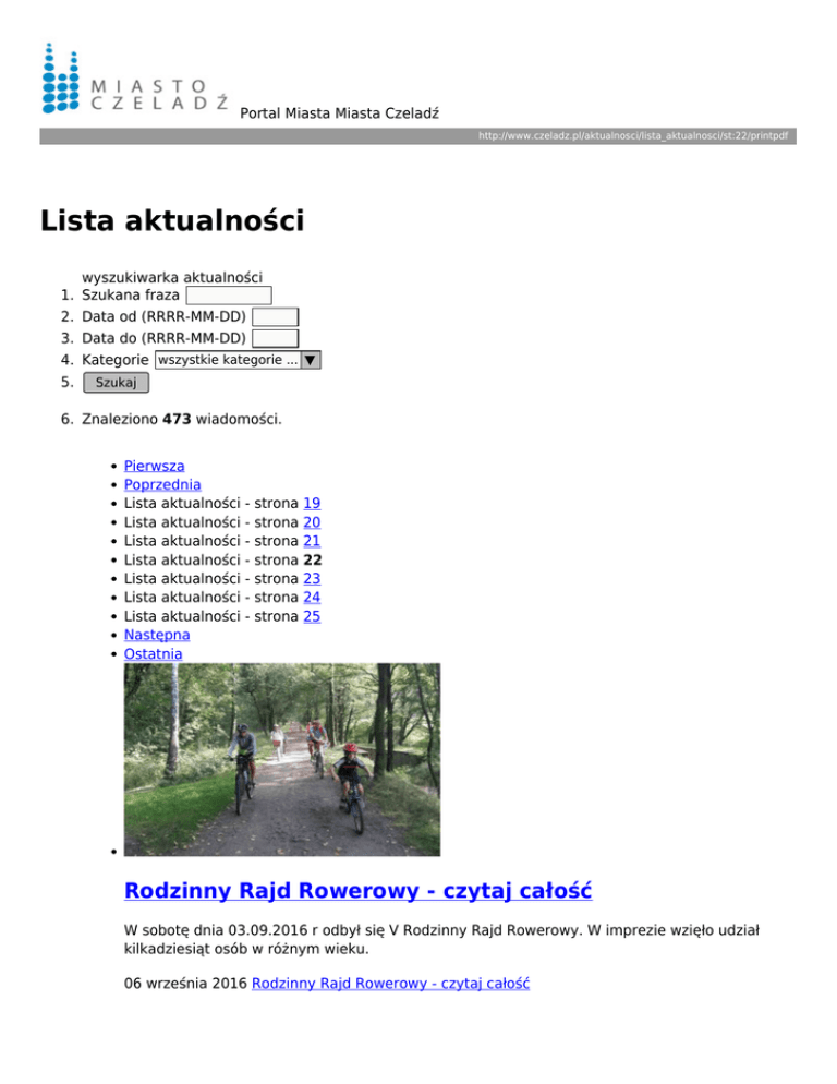Portal Miasta Miasta Czeladź http://www.czeladz.pl/aktualnosci/lista_aktualnosci/st:22/printpdf Lista aktualności wyszukiwarka aktualności 1. Szukana fraza 2. Data od (RRRR-MM-DD) 3. Data do (RRRR-MM-DD) 4. Kategorie wszystkie kategorie ... ▼ 5. Szukaj 6. Znaleziono 473 wiadomości. Pierwsza Poprzednia Lista aktualności - strona 19 Lista aktualności - strona 20 Lista aktualności - strona 21 Lista aktualności - strona 22 Lista aktualności - strona 23 Lista aktualności - strona 24 Lista aktualności - strona 25 Następna Ostatnia Rodzinny Rajd Rowerowy - czytaj całość W sobotę dnia 03.09.2016 r odbył się V Rodzinny Rajd Rowerowy. W imprezie wzięło udział kilkadziesiąt osób w różnym wieku. 06 września 2016 Rodzinny Rajd Rowerowy - czytaj całość Festyn rodzinny w Parku Jordan - czytaj całość 4 września na placu zabaw w Parku Jordan odbył się festyn z okazji otwarcia nowej strefy aktywności rodzinnej. 05 września 2016 Festyn rodzinny w Parku Jordan - czytaj całość Festyn Zdrowia - czytaj całość Burmistrz Miasta Zbigniew Szaleniec zaprasza na Rynek 7 września w godzinach od 9.30 do 14.00. 05 września 2016 Festyn Zdrowia - czytaj całość Osłonięcie rzeźby "Czeladzkiej Czarownicy" - czytaj całość W sobotę, 3 września odsłonięto rzeźbę Katarzyny Włodyczkowej "Czeladzkiej Czarownicy". 05 września 2016 Osłonięcie rzeźby "Czeladzkiej Czarownicy" - czytaj całość Nowy Rok Szkolny 2016/2017 uroczyście rozpoczęty! czytaj całość Uroczysta inauguracja Nowego Roku Szkolnego w naszym mieście odbyła się w tym roku w Szkole Podstawowej Nr 3 im. Janusza Korczaka. 02 września 2016 Nowy Rok Szkolny 2016/2017 uroczyście rozpoczęty! - czytaj całość Festyn Rodzinny w Parku Jordan - czytaj całość W niedzielę, 4 września na placu zabaw w Parku Jordan odbędzie się Festyn Rodzinny. 02 września 2016 Festyn Rodzinny w Parku Jordan - czytaj całość Rocznica wybuchu II Wojny Światowej - czytaj całość W czwartek, 1 września o godz. 13.00 pod pomnikiem Pamięci Czeladzian – Ofiar Wojny i Poległych w Obozach Koncentracyjnych przy ul. Katowickiej, odbyły się uroczystości z okazji rocznicy wybuchu II Wojny Światowej. 02 września 2016 Rocznica wybuchu II Wojny Światowej - czytaj całość „Podaj dalej... drugie życie odpadów” - czytaj całość Pod takim hasłem rusza tegoroczna akcja „Sprzątanie Świata 2016 – Polska”. 02 września 2016 „Podaj dalej... drugie życie odpadów” - czytaj całość ERASMUS PLUS W MIEJSKIM ZESPOLE SZKÓŁ - czytaj całość Już od 1 września szkoła będzie realizować dwuletni projekt pt. "We are our future! How to equip our students for adulthood and citizenship - a comparative study of autonomy, curricula and communication." 31 sierpnia 2016 ERASMUS PLUS W MIEJSKIM ZESPOLE SZKÓŁ - czytaj całość Pożegnanie wakacji - czytaj całość 27 sierpnia na czeladzkim rynku odbyła się impreza z okazji zakończenia wakacji. Nie zabrakło bitwy na balony wodne, seansu "Kina Letniego", a także innych atrakcji. 29 sierpnia 2016 Pożegnanie wakacji - czytaj całość Pierwsza Poprzednia Lista aktualności - strona 19 Lista aktualności - strona 20 Lista aktualności - strona 21 Lista aktualności - strona 22 Lista aktualności - strona 23 Lista aktualności - strona 24 Lista aktualności - strona 25 Następna Ostatnia