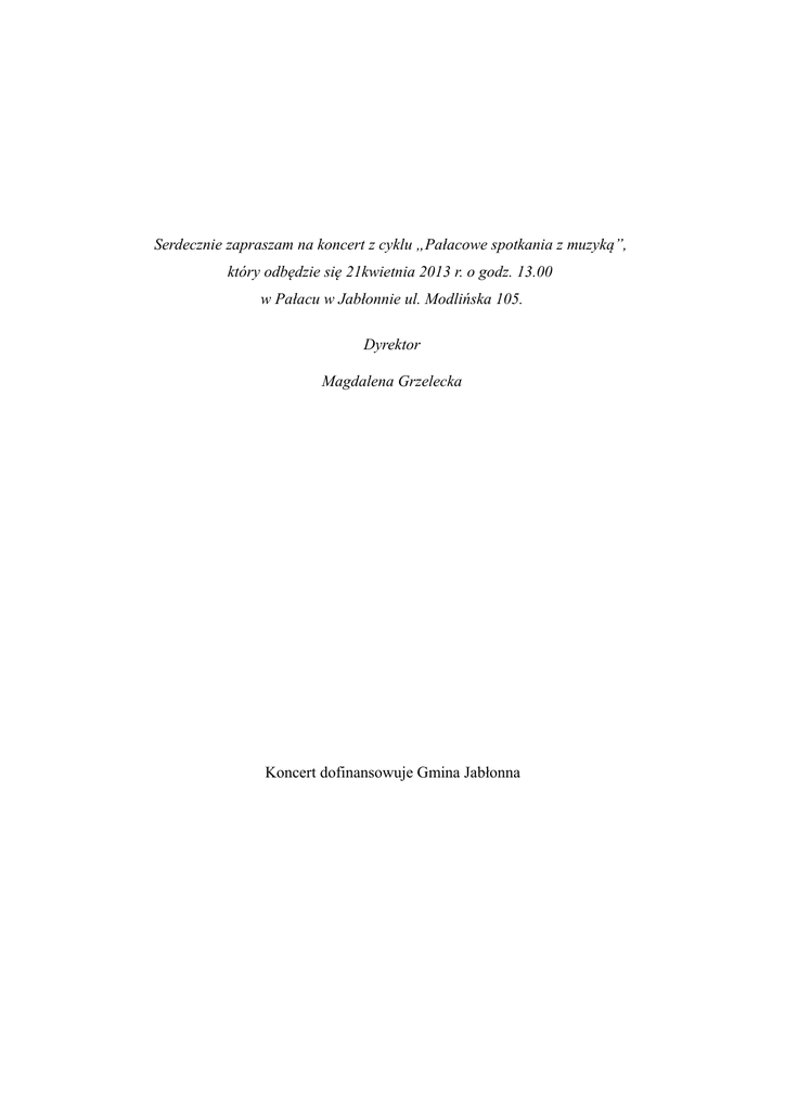 Serdecznie zapraszam na koncert z cyklu „Pałacowe spotkania z muzyką”, który odbędzie się 21kwietnia 2013 r. o godz. 13.00 w Pałacu w Jabłonnie ul. Modlińska 105. Dyrektor Magdalena Grzelecka Koncert dofinansowuje Gmina Jabłonna Gitara i obój – dwa instrumenty, zdawałoby się krańcowo różne a jednocześnie przepięknie się uzupełniające, zabiorą nas w niezwykłą podróż przez wieki i kraje. Zaczniemy ją w renesansowej Anglii, słuchając pieśni w oryginale napisanych na głos z towarzyszeniem lutni. Tworzyli je żyjący równolegle na przełomie XVI i XVII wieku Francis Pilklington, Philip Rosseter i John Dowland, słusznie uznany za największego barda epoki elżbietańskiej. Do epoki baroku powiodą nas Giuseppe Antonio Brescianello – włoski kompozytor i skrzypek, który większość życia spędził w Niemczech i jeden z największych niemieckich kompozytorów tej epoki – Georg Philipp Telemann. Słuchając sonaty Wolfganga Amadeusza Mozarta przeniesiemy się do Austrii epoki klasycyzmu. Hiszpania końca XIX i początku XX wieku to twórczość Enrique Granadosa, współtwórcy narodowego stylu w muzyce hiszpańskiej, natomiast najwybitniejszym brazylijskim kompozytorem XX wieku jest niewątpliwie Heitor Villa Lobos, którego twórczość łączy w sobie wpływy folkloru brazylijskiego z elementami stylistyki muzyki europejskiej. Do Francji XX wieku zaproszą nas Jacques Ibert oraz żyjący współcześnie znakomity gitarzysta Francis Kleynjans. Magdalena Rostworowska PROGRAM Louis de Moy John Dowland John Dowland Francis Pilkington Philip Rosseter Ballet If My Compaints Fine Knacks for Ladies Rest Sweet Nimphs When Laura Smiles Giuseppe Antonio Brescianello Partita e-moll Entree, Menuett, Siciliana, Gigue Georg Philipp Telemann Sonata a-moll Siciliana, Spirituoso, Andante, Allegro vivace *** przerwa *** Wolfgang Amadeus Mozart Sonata C-dur Allegro, Andante, Rondo Hektor Villa Lobos Enrique Granados Francis Kleynjans Jacques Ibert Preludium IV i V Andaluza Aria nr 1 a-moll Entr`acte Wykonawcy: Tytus Wojnowicz – obój Ryszard Bałauszko – gitara Kierownictwo artystyczne cyklu – prof. Andrzej Zieliński Tytus Wojnowicz ur. w 1965r. we Wrocławiu. Oboista od 15. roku życia. Sztukę gry na tym instrumencie zgłębiał pod kierunkiem prof. Stanisława Malikowskiego. Ukończył Akademię Muzyczną im. Fryderyka Chopina w Warszawie oraz Hochschule fur Musik we Freiburgu w klasie prof. Heinza Holligera. Jest laureatem konkursów w kraju i zagranicą m. in. w Pradze na Międzynarodowym Konkursie Młodych Muzyków – wyróżnienie, we Włoszakowicach na Ogólnopolskim Konkursie Oboistów 1990 – 1 nagroda, Isle of Wight Oboe Competition (Wielka Brytania) 1993 – 3 nagroda. W latach 1996 i 97 był wybierany Instrumentalistą Roku w plebiscycie polskich rozgłośni radiowych. Występuje jako solista i kameralista oraz pracuje jako adiunkt na Uniwersytecie Muzycznym w Warszawie. Od roku 1989 jest członkiem Warszawskiego Kwintetu Dętego „Da Camera”. Występował z nim w wielu krajach europejskich, wielokrotnie w USA, także na Tajwanie. Nagrał kilka płyt z muzyką kameralną. Jest założycielem i kierownikiem artystycznym zespołu „Ensemble de Narol” – obecnie „Essentia Musica” który wydał w 2005 roku płytę i występował na wielu festiwalach w Polsce. W roli solisty współpracował z większością polskich zespołów filharmonicznych i kameralnych. W latach 2005 i 2006 wspólnie z Nigelem Kennedym i Polską Orkiestrą Kameralną zagrał kilkadziesiąt koncertów w najważniejszych salach europejskich. Nagrał wiele płyt solowych z muzyką popularną i klasyczną dla Sony Music. Ryszard Bałauszko – solista, kameralista, pedagog. Ukończył Akademię Muzyczną im. Fryderyka Chopina w Warszawie w klasie M. Zalewskiego. Następnie studiował w Hiszpanii w Conservatorio Superior w Alicante w klasie J. Thomasa, oraz uczestniczył w wielu kursach mistrzowskich. Prowadzi klasę gitary na Uniwersytecie Muzycznym Fryderyka Chopina w Warszawie i filii w Białymstoku. Uczy również w ZPSM II st. w Warszawie. Jest zapraszany do prowadzenia wielu kursów mistrzowskich w Polsce, na Słowacji, Niemczech i w Hiszpanii. Koncertuje i nagrywa solo i ze znanymi muzykami oraz zespołami. Jest jurorem i przewodniczącym jury konkursów krajowych i międzynarodowych. Wykształcił wielu cenionych gitarzystów i pedagogów.
