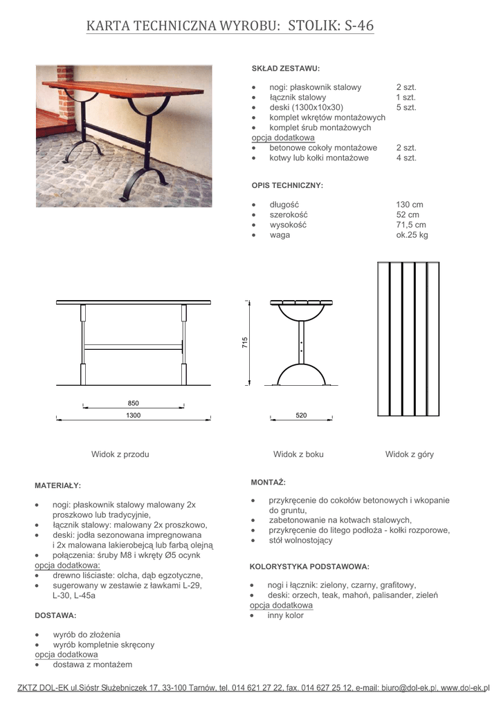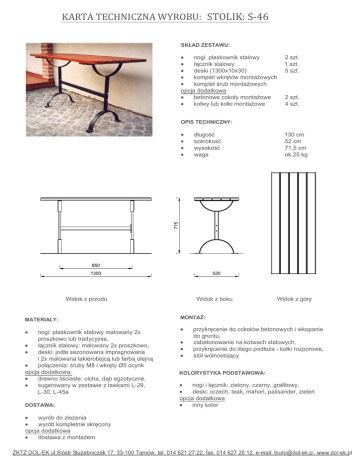 KARTA TECHNICZNA WYROBU: STOLIK: S-46 deski (1300x10x30) 2 szt. 1 szt. 5 szt. opcja dodatkowa 2 szt. 4 szt. OPIS TECHNICZNY: 130 cm 52 cm 71,5 cm ok.25 kg 715 waga 850 1300 Widok z przodu 520 Widok z boku MATERIA proszkowo lub tradycyjnie, opcja dodatkowa: do gruntu, zabetonowanie na kotwach stalowych, KOLORYSTYKA PODSTAWOWA: L-30, L-45a DOSTAWA: opcja dodatkowa opcja dodatkowa inny kolor