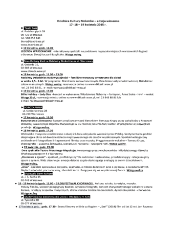 Dzielnica Kultury Mokotów – edycja wiosenna 17- 18 – 19 kwietnia 2015 r. ► Teatr Baza ul. Podchorążych 39 00-722 Warszawa tel. 510 053 140 [email protected] www.teatrbaza.pl ● 19 kwietnia, godz. 12.00 LEGENDY WARSZAWSKIE -interaktywny spektakl na podstawie najpopularniejszych warszawskich legend: o Syrence, Złotej Kaczce i Bazyliszku. Wstęp wolny. ►Dom Kultury Kadr w Dzielnicy Mokotów m.st. Warszawy ul. Gotarda 16, 02-683 Warszawa www.dkkadr.waw.pl ● 18 kwietnia, godz. 11.00 – 13.00 Rodzinny Dziedziniec Nadzwyczajności – familijne warsztaty artystyczne dla dzieci w wieku 2,5 - 6 lat. W programie: Dziedziniec zabaw tanecznych, Dziedziniec aktywności twórczej, Dziedziniec zabaw manualnych. Wstęp wolny, rezerwacja online na www.dkkadr.waw.pl tel. 22 843 88 81, e- mail:[email protected] ● 19 kwietnia, godz. 17.00 Billie Holiday – Lady Day -koncert w wykonaniu: Włodzimierz Nahorny – fortepian, Anna Sroka - Hryń – wokal. Wstęp 20 zł, rezerwacja miejsc online na www.dkkadr.waw.pl, tel. 22 843 88 81 lub e-mail: [email protected] ►DOROŻKARNIA Uul. Siekierkowska 28 00-709 Warszawa ● 17 kwietnia, godz. 19.00 Bursztynowa Dziewczyna -koncert zrealizowany pod kierunkiem Tomasza Krupy przez wokalistów z Pracowni Wokalnej i Dziecięcego Odjazdu Muzycznego w 35 rocznicę śmierci Anny Jantar. W programie Jej największe przeboje. Wstęp wolny. ● 18 kwietnia, godz. 17.30 Widowisko muzyczne zrealizowane z okazji 25-lecia odzyskania wolności przez Polskę. Sentymentalna podróż obejmująca okres od dwudziestolecia międzywojennego do czasów współczesnych. Spektakl wzbogacony archiwalnymi fotografiami i fragmentami filmów oraz muzyką. Przygotowanie wokalne – Tomasz Krupa, choreografia – Zuzanna Żółtowska, scenariusz i reżyseria – Grzegorz Pohl. Wstęp wolny. ● 19 kwietnia, godz. 19.00 Dwa spektakle Teatru Moralnego Niepokoju, tworzonego przez wychowanków Młodzieżowego Ośrodka Wychowawczego nr 4 z Warszawy; „Rozmowa z ojcem” - spektakl „profilaktyczny”dla rodziców i nastolatków, przedstawiający relacje między ojcem a synem. Widz obserwuje emocje dziecka często dostrzegając analogię ze swym dzieciństwem. Wstęp wolny. „Ania” - spektakl opowiada o przyjaźni, lojalności, o miłości do bliskich oraz o jej braku, o nieodwracalnych błędach młodości, poczuciu winy, zbrodni i karze. Rozgrywa się we współczesnej Polsce. Wstęp wolny. ► Służewski Dom Kultury ul. J. S. Bacha 15 02-743 Warszawa ● 18 - 19 kwietnia (godz. 11.00 – 19.00) FESTIWAL CHORWACKI. Kultura, sztuka, turystyka, muzyka. Pokazy filmów, wieczór poezji grupy Bastien, wystawa fotografii, koncert charyzmatycznego wokalisty Gorana Karana, występy zespołów muzycznych, strefa smaków śródziemnomorskich, dyskoteka polsko - chorwacka. Wstęp wolny. ► Multimedialna Biblioteka dla Dzieci i Młodzieży nr XXXI ul. Tyniecka 40 05-077 Warszawa ● 17 kwietnia godz. godz. 17.30 - Seans filmowy w Kinie za Rogiem – „Szef” (2014) film od lat 12 reż. Jon Favreau Wstęp 5 zł (rezerwacja miejsc). ● 18 kwietnia, godz. 10.00 ALE KSIĄŻKA - animacje literackie dla dzieci w wieku 5-7 lat. Spotkania z fascynującą literaturą. Warsztaty z wykorzystaniem technik arteterapeutycznych (m. in. biblioterapii). Wstęp wolny. Zapisy: tel. 22-646-4649. ● 18 kwietnia, godz. 12.00 – Multimedialne zabawy ze sztuką. Zajęcia edukacyjne odkrywające tajniki historii sztuki, przy zastosowaniu programów Adobe Photoshop CS^, skierowane do dzieci od 12 roku życia. Wstęp wolny. ►Młodzieżowy Dom Kultury MOKOTÓW ul. Puławska 97 02-595 Warszawa Wystawa fotografii -MOKOTOWSKIM OKIEM LEONARDA pamięci artysty fotografika, pedagoga Leonarda Karpiłowskiego - wiceprzewodniczącego Komitetu Historii Fotografii, członka-założyciela Fotoklubu Rzeczpospolitej Polskiej - Stowarzyszenie Twórców. Ekspozycja prac ze zbiorów Tygodnika „POŁUDNIE”, obejmująca lata 2004- 2014, dokumentująca m. in. Dzielnicę Mokotów. ● 17 kwietnia, godz. 17. 00 - wernisaż wystawy. Ekspozycja czynna w dni powszednie od 20 do 30 kwietnia 2015 r. w godz. 11.00 – 18.00. Partnerem wystawy jest Tygodnik POŁUDNIE. Wstęp wolny. ► Centrum ŁOWICKA ul. Łowicka 21 02-502 Warszawa ● 17 kwietnia, godz. 19. 00 - wernisaż wystawy Łukasz Ługowski – Rysunki. Wystawa czynna do 24 maja 2015 r. Wstęp wolny. ► Teatr Druga Strefa ul. Magazynowa 14A 02-652 Warszawa ● 17 i 18 kwietnia, godz. 19. 00 - Burleskowe Święto Wiosny - spektakl dla dorosłych. Wstęp 50 zł rezerwacje: tel. 690 886 943 ►Warszawskie Towarzystwo Muzyczne 02-511 Warszawa, ul. Morskie Oko 2 tel. 22 849 56 51, 509 019 934 ● 19 kwietnia, godz. 12.00 – koncert muzyki klasycznej Trio Lwowskie: Wiktoria Tytarenko (skrzypce) Olga Szutko (wiolonczela) Natalia Rewakowicz (fortepian) W programie: Beethoven, Schumann, Barwiński. Bilety w cenie: normalny: 10 zł, ulgowy: 5zł