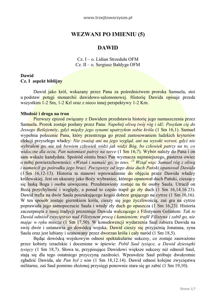 www.trzejtowarzysze.pl WEZWANI PO IMIENIU (5) DAWID Cz. I – o. Lidian Strzeduła OFM Cz. II – o. Sergiusz Bałdyga OFM Dawid Cz. I aspekt biblijny Dawid jako król, wskazany przez Pana za pośrednictwem proroka Samuela, stoi u podstaw potęgi monarchii dawidowo-salomonowej. Historię Dawida opisuje przede wszystkim 1-2 Sm, 1-2 Krl oraz z nieco innej perspektywy 1-2 Krn. Młodość i droga na tron Pierwszy epizod związany z Dawidem przedstawia historię jego namaszczenia przez Samuela. Prorok zostaje posłany przez Pana: Napełnij oliwą twój róg i idź: Posyłam cię do Jessego Betlejemity, gdyż między jego synami upatrzyłem sobie króla (1 Sm 16,1). Samuel wypełnia polecenie Pana, który przestrzega go przed zastosowaniem ludzkich kryteriów elekcji przyszłego władcy: Nie zważaj ani na jego wygląd, ani na wysoki wzrost, gdyż nie wybrałem go, nie tak bowiem człowiek widzi jak widzi Bóg, bo człowiek patrzy na to, co widoczne dla oczu, Pan natomiast patrzy na serce (1 Sm 16,7). Wybór należy do Pana i on sam wskaże kandydata. Spośród ośmiu braci Pan wyznacza najmniejszego, pasterza owiec o miłej powierzchowności: «Wstań i namaść go, to ten». 13 Wziął więc Samuel róg z oliwą i namaścił go pośrodku jego braci. Począwszy od tego dnia duch Pański opanował Dawida (1 Sm 16,12-13). Historia ta stanowi wprowadzenie do objęcia przez Dawida władzy królewskiej. Jest on ukazany jako Boży wybraniec, którego opanował duch Pański, cieszący się łaską Boga i osoba uświęcona. Przedstawiony zostaje na tle osoby Saula. Utracił on Bożą przychylność i względy, a ponad to często trapił go zły duch (1 Sm 16,14.16.23). Dawid trafia na dwór Saula poszukującego kogoś dobrze grającego na cytrze (1 Sm 16,16). W ten sposób zostaje giermkiem króla, cieszy się jego życzliwością, zaś gra na cytrze poprawiała jego samopoczucie Saula i wtedy zły duch go opuszcza (1 Sm 16,23). Historia zaczerpnięta z innej tradycji prezentuje Dawida walczącego z Filistynem Goliatem: Tak to Dawid odniósł zwycięstwo nad Filistynem procą i kamieniem; trafił Filistyna i zabił go, nie mając w ręku miecza (1 Sm 17,50). W konsekwencji wydarzenia Saul zabiera Dawida na swój dwór i ustanawia go dowódcą wojska. Dawid cieszy się przyjaźnią Jonatana, syna Saula oraz jest lubiany i szanowany przez dworzan króla i cały naród (1 Sm 18,5). Będąc dowódcą wojskowym odnosi spektakularne sukcesy, co zostaje zauważone przez kobiety izraelskie i docenione w śpiewie: Pobił Saul tysiące, a Dawid dziesiątki tysięcy (1 Sm 18,7). Słowa te, przypisujące Dawidowi większe sukcesy niż odnosił Saul, stają się dla tego ostatniego przyczyną zazdrości. Wprawdzie Saul próbuje dwukrotnie zgładzić Dawida, ale Pan był z nim (1 Sm 18,12.14). Dawid odnosi kolejne zwycięstwa militarne, zaś Saul pomimo złożonej przysięgi ponownie stara się go zabić (1 Sm 19,10). Strona 1/7 www.trzejtowarzysze.pl Eskalacja napięcia pomiędzy Saulem a Dawidem, zmusza go do ucieczki. Dawid przebywa u Filistynów, w jaskini Adullam, w Moabie, na pustyni Engaddi wiodąc żywot tułacza. Zrządzeniem losu Saul wchodzi do jaskini, w której przebywa Dawid ze swymi ludźmi (1 Sm 24,4n). Dawid odcina po kryjomu połę płaszcza Saula, lecz doznaje wyrzutów sumienia, ubranie bowiem zastępuje osobę, która je nosi. Dla niego Saul jest panem i pomazańcem Pańskim, dlatego postanawia do oszczędzić. Również inna opowieść ukazuje szacunek Dawida wobec króla (1 Sm 26,1-25). Dawid z Abiszajem zakradłszy się w nocy do obozu Saula ma okazję uśmiercić go dzidą wbitą w ziemię obok głowy. Szacunek wobec króla, skłania go do zaniechania zbrodni: Niech mię Pan broni przed podniesieniem ręki na pomazańca Pańskiego! Saul w duchu wdzięczności obiecuje Dawidowi, że nigdy nie zrobi mu krzywdy oraz go błogosławi. Historia wyprawy przeciwko Amalekitom przedstawia Dawida płaczącego w obliczu zdobycia i zniszczenia przez nich miasta Siklag (1 Sm 30,1n). Dawid doświadcza wielkiego strapienia, a lud zamierza go nawet ukamienować. Wtedy doznał umocnienia od Pana, Boga swego. Zasięga rady Pana, który poleca mu ścigać wroga i odebrać mu łup. Epizodem kończącym ten etap życia Dawida jest przybycie młodego Amalekity wraz z insygniami władzy, oświadczającego, że zabił Saula (2 Sm 1,1n). Dawid rozdziera szaty na wieść o śmierci króla i swego przyjaciela Jonatana, zaś młodzieńca każe stracić, gdyż podniósł rękę, by zabić pomazańca Pańskiego. Opowieść wieńczy pieśń żałobna zaśpiewana przez Dawida ku czci Saula i jego syna Jonatana. Dawid jako król Po śmierci Saula Pan nakazuje Dawidowi udać się do Hebronu. Tam zostaje namaszczony na króla: Przybyli ludzie z Judy i namaścili Dawida na króla nad domem Judy (2 Sm 2,4). Dawid jest więc jedynie królem Judy. Dopiero śmierć Abnera i Iszbaala torują mu drogę na tron Izraela, gdy wszystkie pokolenia izraelskie schodzą się w Hebronie i oświadczają: Oto myśmy kości twoje i ciało. 2 Już dawno, gdy Saul był królem nad nami, tyś odbywał wyprawy na czele Izraela. I Pan rzekł do ciebie: "Ty będziesz pasł mój lud Izraela, i ty będziesz wodzem nad Izraelem" (2 Sm 5,1-2), a następnie dokonują namaszczenia (2 Sm 5,3). W ten sposób Dawid jako monarcha jednoczy dwie grupy etniczne zachowujące poczucie odrębności, Judę i Izraela. Zdobycie Jerozolimy zamieszkiwanej przez Jebusytów staje się dowodem potęgi Dawida rosnącej za sprawą samego Boga: Dawid stawał się coraz potężniejszy, bo Pan, Bóg Zastępów, był z nim (2 Sm 5,10). W obliczu konfrontacji z Filistynami, Dawid zasięga rady u Pana: «Czy mam pójść na Filistynów i czy oddasz ich w moje ręce?» A Pan odrzekł Dawidowi: «Idź! Z pewnością oddam Filistynów w twoje ręce» (2 Sm 5,19). Postępując za radą Pana, atakuje Filistynów od tyłu odnosząc zwycięstwo. Dawid podejmuje decyzję o sprowadzeniu Ar