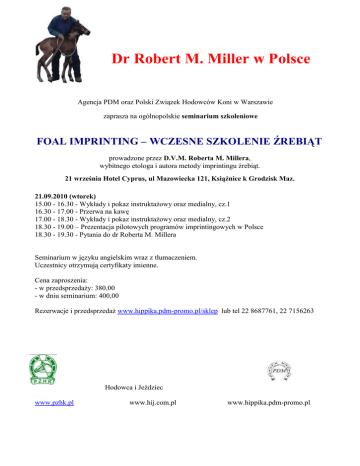 Dr Robert M. Miller w Polsce Agencja PDM oraz Polski Związek Hodowców Koni w Warszawie zaprasza na ogólnopolskie seminarium szkoleniowe FOAL IMPRINTING – WCZESNE SZKOLENIE ŹREBIĄT prowadzone przez D.V.M. Roberta M. Millera, wybitnego etologa i autora metody imprintingu źrebiąt. 21 września Hotel Cyprus, ul Mazowiecka 121, Książnice k Grodzisk Maz. 21.09.2010 (wtorek) 15.00 - 16.30 - Wykłady i pokaz instruktażowy oraz medialny, cz.1 16.30 - 17.00 - Przerwa na kawę 17.00 - 18.30 - Wykłady i pokaz instruktażowy oraz medialny, cz.2 18.30 - 19.00 – Prezentacja pilotowych programów imprintingowych w Polsce 18.30 - 19.30 - Pytania do dr Roberta M. Millera Seminarium w języku angielskim wraz z tłumaczeniem. Uczestnicy otrzymują certyfikaty imienne. Cena zaproszenia: - w przedsprzedaży: 380,00 - w dniu seminarium: 400,00 Rezerwacje i przedsprzedaż www.hippika.pdm-promo.pl/sklep lub tel 22 8687761, 22 7156263 Hodowca i Jeździec www.pzhk.pl www.hij.com.pl www.hippika.pdm-promo.pl
