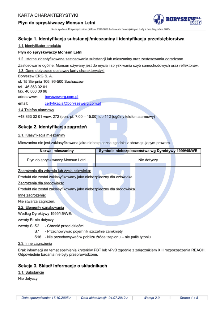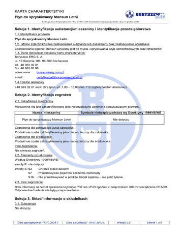 KARTA CHARAKTERYSTYKI Płyn do spryskiwaczy Monsun Letni Karta zgodna z Rozporządzeniem (WE) nr 1907/2006 Parlamentu Europejskiego i Rady z dnia 16 grudnia 2006r. Sekcja 1. Identyfikacja substancji/mieszaniny i identyfikacja przedsiębiorstwa 1.1. Identyfikator produktu Płyn do spryskiwaczy Monsun Letni 1.2. Istotne zidentyfikowane zastosowania substancji lub mieszaniny oraz zastosowania odradzane Zastosowanie ogólne: Monsun używany jest do mycia i spryskiwania szyb samochodowych oraz reflektorów. 1.3. Dane dotyczące dostawcy karty charakterystyki Boryszew ERG S. A. ul. 15 Sierpnia 106; 96-500 Sochaczew tel. 46 863 02 01 fax. 46 863 00 96 adres www: boryszewerg.com.pl email: [email protected] 1.4.Telefon alarmowy +48 863 02 01 wew. 272 (pon.-pt. 7.00 – 15.00) lub 112 (ogólny telefon alarmowy) Sekcja 2. Identyfikacja zagrożeń 2.1. Klasyfikacja mieszaniny Mieszanina nie jest zaklasyfikowana jako niebezpieczna zgodnie z obowiązującym prawem. Nazwa mieszaniny Symbole niebezpieczeństwa wg Dyrektywy 1999/45/WE Płyn do spryskiwaczy Monsun Letni Nie dotyczy Zagrożenia dla zdrowia lub życia człowieka: Produkt nie został zaklasyfikowany jako niebezpieczny dla człowieka. Zagrożenia dla środowiska: Produkt nie został zaklasyfikowany jako niebezpieczny dla środowiska. Inne zagrożenia: Nie stwarza zagrożeń. 2.2. Elementy oznakowania Według Dyrektywy 1999/45/WE: zwroty R: nie dotyczy zwroty S: S2 - Chronić przed dziećmi S7 - Przechowywać pojemnik szczelnie zamknięty S16 - Nie przechowywać w pobliżu źródeł zapłonu – nie palić tytoniu 2.3. Inne zagrożenia Brak informacji na temat spełnienia kryteriów PBT lub vPvB zgodnie z załącznikiem XIII rozporządzenia REACH. Odpowiednie badania nie były przeprowadzone. Sekcja 3. Skład/ Informacje o składnikach 3.1. Substancje Nie dotyczy Data sporządzenia: 17.10.2005 r. Data aktualizacji: 04.07.2012 r. Wersja 2.0 Strona 1 z 8 KARTA CHARAKTERYSTYKI Płyn do spryskiwaczy Monsun Letni Karta zgodna z Rozporządzeniem (WE) nr 1907/2006 Parlamentu Europejskiego i Rady z dnia 16 grudnia 2006r. 3.2. Mieszanina Symbole niebezpieczeństwa** Nazwa substancji Zakres stężeń [%] Numer CAS Numer WE Dyrektywa 67/548/EWG Rozporządzenie (WE) 1272/2008 Etanol; Alkohol etylowy* <1 64-17-5 200-578-6 F; R11 Flam Liq. 2; H225 * Numer rejestracji dla Etanolu: 01-2119457610-043-XXXX ** Patrz sekcja 16 Sekcja 4. Środki pierwszej pomocy 4.1. Opis środków pierwszej pomocy Wdychanie: nie stwarza zagrożeń. Skóra: przemyć wodą z mydłem. Oczy: natychmiast przemyć oczy dużą ilością bieżącej wody przy szeroko otwartych powiekach przez co najmniej 15 minut. Usunąć szkła kontaktowe. Unikać silnego strumienia – ryzyko uszkodzenia rogówki. Połknięcie: nie stwarza zagrożeń. 4.2. Najważniejsze ostre i opóźnione objawy oraz skutki narażenia Brak doniesień o niepożądanych skutkach lub krytycznych zagrożeniach. 4.3. Wskazania dotyczące wszelkiej natychmiastowej pomocy lekarskiej i szczególnego postępowania z poszkodowanym. Personelowi medycznemu udzielającemu pomocy pokazać kartę charakterystyki, etykietę lub opakowanie. Sekcja 5. Postępowanie w przypadku pożaru Ciecz niepalna. 5.1. Środki gaśnicze Nie dotyczy. 5.2. Szczególne zagrożenia związane z produktem Nie dotyczy. 5.3. Informacje dla straży pożarnej Brak specjalnych wymagań. Sekcja 6. Postępowanie w przypadku niezamierzonego uwolnienia do środowiska 6.1. Indywidualne środki ostrożności, wyposażenie ochronne i procedury w sytuacjach awaryjnych Nosić odpowiednią odzież ochronną. Zapewnić skuteczną wentylację. 6.2.Środki ostrożności w zakresie ochrony środowiska Nie stanowi zagrożenia dla środowiska. 6.3. Metody i materiały zapobiegające rozprzestrzenianiu się skażenia i służące do usuwania skażenia Powstrzymać wyciek i odizolować skażony teren. Zasypać materiałem pochłaniającym ciecze, np. piaskiem, ziemią, wermikulitem, ziemią okrzemkową, trocinami. Zebrać mechanicznie do właściwie oznakowanego, szczelnego pojemnika i skierować do utylizacji. Pozostałości zmyć dużą ilością wody. 6.4. Odniesienie do innych sekcji Indywidualne środki ochrony - patrz sekcja 8, niewłaściwe środki gaśnicze - patrz sekcja 5. Postępowanie z odpadami - patrz sekcja 13. Data sporządzenia: 17.10.2005 r. Data aktualizacji: 04.07.2012 r. Wersja 2.0 Strona 2 z 8 KARTA CHARAKTERYSTYKI Płyn do spryskiwaczy Monsun Letni Karta zgodna z Rozporządzeniem (WE) nr 1907/2006 Parlamentu Europejskiego i Rady z dnia 16 grudnia 2006r. Sekcja 7. Postępowanie z substancjami i mieszaninami oraz ich magazynowanie 7.1. Środki ostrożności dotyczące bezpiecznego postępowania Postępować zgodnie z ogólnymi zasadami bezpieczeństwa i higieny pracy z substancjami chemicznymi oraz dobrej praktyki produkcyjnej; ściśle przestrzegać opracowanych procedur postępowania oraz wszelkich zaleceń producenta. Stosować w odpowiednio wentylowanym miejscu. Podczas stosowania nie jeść, nie pić i nie palić tytoniu. Unikać kontaktu z ogniem i źródłami zapłonu. 7.2. Warunki bezpiecznego magazynowania, łącznie z informacjami dotyczącymi wszelkich wzajemnych niezgodności Magazynować wyłącznie w szczelnie zamkniętych, właściwie oznakowanych opakowaniach, w chłodnym, wentylowanym pomieszczeniu. Zabezpieczyć produkt przed wpływem wilgoci z powietrza i działaniem światła słonecznego. Przechowywać w temperaturze nie niższej niż 0°C i nie wyższej niż +30°C. Dopuszczalny okres magazynowania: do 36 miesięcy. W miejscu magazynowania produktu wprowadzić zakaz palenia tytoniu, używania otwartego ognia i spożywania posiłków. 7.3. Szczególne zastosowanie końcowe Brak danych dotyczących szczególnych zastosowań. Sekcja 8. Kontrola narażenia/środki ochrony indywidualnej 8.1. Parametry dotyczące kontroli 3 Obowiązujące w Polsce najwyższe dopuszczalne stężenie (mg/m ) w środowisku pracy: Specyfikacja NDS Etanol; Alkoh