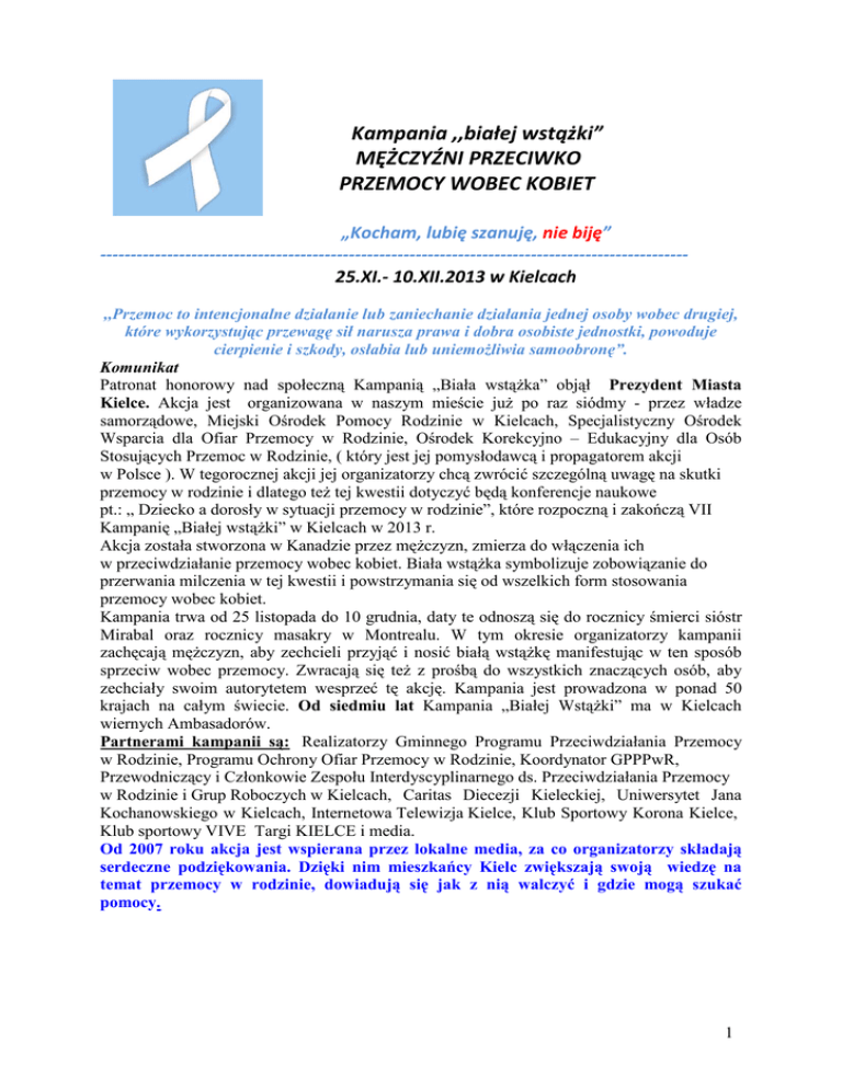 Kampania ,,białej wstążki” MĘŻCZYŹNI PRZECIWKO PRZEMOCY WOBEC KOBIET „Kocham, lubię szanuję, nie biję” ------------------------------------------------------------------------------------------------25.XI.- 10.XII.2013 w Kielcach ,,Przemoc to intencjonalne działanie lub zaniechanie działania jednej osoby wobec drugiej, które wykorzystując przewagę sił narusza prawa i dobra osobiste jednostki, powoduje cierpienie i szkody, osłabia lub uniemożliwia samoobronę”. Komunikat Patronat honorowy nad społeczną Kampanią „Biała wstążka” objął Prezydent Miasta Kielce. Akcja jest organizowana w naszym mieście już po raz siódmy - przez władze samorządowe, Miejski Ośrodek Pomocy Rodzinie w Kielcach, Specjalistyczny Ośrodek Wsparcia dla Ofiar Przemocy w Rodzinie, Ośrodek Korekcyjno – Edukacyjny dla Osób Stosujących Przemoc w Rodzinie, ( który jest jej pomysłodawcą i propagatorem akcji w Polsce ). W tegorocznej akcji jej organizatorzy chcą zwrócić szczególną uwagę na skutki przemocy w rodzinie i dlatego też tej kwestii dotyczyć będą konferencje naukowe pt.: „ Dziecko a dorosły w sytuacji przemocy w rodzinie”, które rozpoczną i zakończą VII Kampanię „Białej wstążki” w Kielcach w 2013 r. Akcja została stworzona w Kanadzie przez mężczyzn, zmierza do włączenia ich w przeciwdziałanie przemocy wobec kobiet. Biała wstążka symbolizuje zobowiązanie do przerwania milczenia w tej kwestii i powstrzymania się od wszelkich form stosowania przemocy wobec kobiet. Kampania trwa od 25 listopada do 10 grudnia, daty te odnoszą się do rocznicy śmierci sióstr Mirabal oraz rocznicy masakry w Montrealu. W tym okresie organizatorzy kampanii zachęcają mężczyzn, aby zechcieli przyjąć i nosić białą wstążkę manifestując w ten sposób sprzeciw wobec przemocy. Zwracają się też z prośbą do wszystkich znaczących osób, aby zechciały swoim autorytetem wesprzeć tę akcję. Kampania jest prowadzona w ponad 50 krajach na całym świecie. Od siedmiu lat Kampania „Białej Wstążki” ma w Kielcach wiernych Ambasadorów. Partnerami kampanii są: Realizatorzy Gminnego Programu Przeciwdziałania Przemocy w Rodzinie, Programu Ochrony Ofiar Przemocy w Rodzinie, Koordynator GPPPwR, Przewodniczący i Członkowie Zespołu Interdyscyplinarnego ds. Przeciwdziałania Przemocy w Rodzinie i Grup Roboczych w Kielcach, Caritas Diecezji Kieleckiej, Uniwersytet Jana Kochanowskiego w Kielcach, Internetowa Telewizja Kielce, Klub Sportowy Korona Kielce, Klub sportowy VIVE Targi KIELCE i media. Od 2007 roku akcja jest wspierana przez lokalne media, za co organizatorzy składają serdeczne podziękowania. Dzięki nim mieszkańcy Kielc zwiększają swoją wiedzę na temat przemocy w rodzinie, dowiadują się jak z nią walczyć i gdzie mogą szukać pomocy. 1 Z kart historii... Patria, Minerva i Maria Teresa Mirabal były aktywistkami politycznymi i symbolem oporu Dominikany przeciwko dyktaturze Trujillo. Były często aresztowane za swą działalność w obronie demokracji i praworządności. 25 listopada 1960 roku siostry Mirabal zostały zamordowane przez tajną policję w pobliżu Rufino de la Cruz, dokąd przyjechały by odwiedzić swych aresztowanych mężów. Zbrodnia ta poruszyła cały naród i przyśpieszyła upadek dyktatury Trujillo. Dzień 25 listopada, upamiętniający życie i śmierć sióstr Mirabal został uznany przez ONZ w roku 1999 za Międzynarodowy Dzień Walki z Przemocą Wobec Kobiet i 16 Dni Przeciwko Przemocy wobec Kobiet, 6 grudnia 1989 roku 25 – letni mężczyzna Marc Lepine wszedł do budynku Politechniki Uniwersytetu w Montrealu niosąc automat kaliber 223. Strzelając zabił 14 kobiet i ranił 13 innych osób: 9 kobiet i 4 mężczyzn. Oświadczył, iż uczynił to, ponieważ uznał za niewłaściwe, by kobiety kończyły studia techniczne. Zanim popełnił samobójstwo zostawił list w którym zamieścił listę 19 najbardziej znienawidzonych przez niego kobiet. W roku 1991 Rząd Kanady ogłosił 6 grudnia Narodowym Dniem Pamięci i Działania w obliczu Przemocy Wobec Kobiet. Odtąd co roku mężczyźni i chłopcy są zachęcani do noszenia białej wstążki pomiędzy 25 listopada a 6 grudnia. Akcja ta obecnie prowadzana jest w ponad 50 krajach. Warto wiedzieć, że po pomoc można zgłosić się w każdym momencie życia i może to zrobić zarówno „ofiara” przemocy, „sprawca” przemocy, jak i świadek przemocy w rodzinie. 2 Program Kampanii Społecznej ,, BIAŁA WSTĄŻKA” w Kielcach 25 listopada – 10 grudnia 2013 1. Tydzień Edukacji Prawnej 25 – 29 listopada 2013 r., bezpłatne porady prawne dla mieszkańców Kielc. 2. Konferencje naukowe i szkoleniowe pt.: ,,Dziecko a dorosły w sytuacji przemocy w rodzinie ” Miejsce: Sala konferencyjna Rady Miasta Kielce, Rynek 1. Termin: 25 listopada 2013, w godz. 10.00 – 13.00; Miejsce: Sala konferencyjna UJK , Kielce ul. Krakowska 11 Termin: 10 grudnia 2013 r. 3. Zawodnicy klubu ekstraklasy piłki nożnej Korona Kielce oraz zawodnicy Klubu VIVE TARGI KIELCE. Mecze: 30.11.2013 KORONA KIELCE vs WIDZEW ŁÓDŹ 03.12.2013 KORONA KIELCE vs LECH POZNAŃ 14.12.2013 VIVE TARGI KIELCE vs.MKS PIOTRKOWIANIN PIOTRKÓW TRYBUNALSKI ( wszyscy zawodnicy wystąpią w koszulkach kampanii, Akcja będzie promowana wśród kibiców, którzy otrzymają tradycyjnie białe wstążki ). 4. ,,Super rodzic. Super dziecko” Zajęcia edukacyjne z dziećmi w wieku przedszkolnym poświęcone będą budowaniu wizji mądrego rodzica. Miejsce zajęć: przedszkola samorządowe: Kielce, ul. Sowia , ul. Górnicza, i ul. Piekoszowska . Zajęcia dla ponad 200 dzieci poprowadzą pracownicy SOW/ Ośrodka Korekcyjno – Edukacyjnego. Jak co roku zorganizowane zostaną również warsztaty plastyczne dla dzieci w wieku przedszkolnym. . 5. Czynny będzie Miejski Telefon Zaufania - ,,Przemoc w rodzinie – zareaguj!” – o numerze 1 95 13 - całodobowy bezpłatny, dla osób dzwoniących z telefonu s