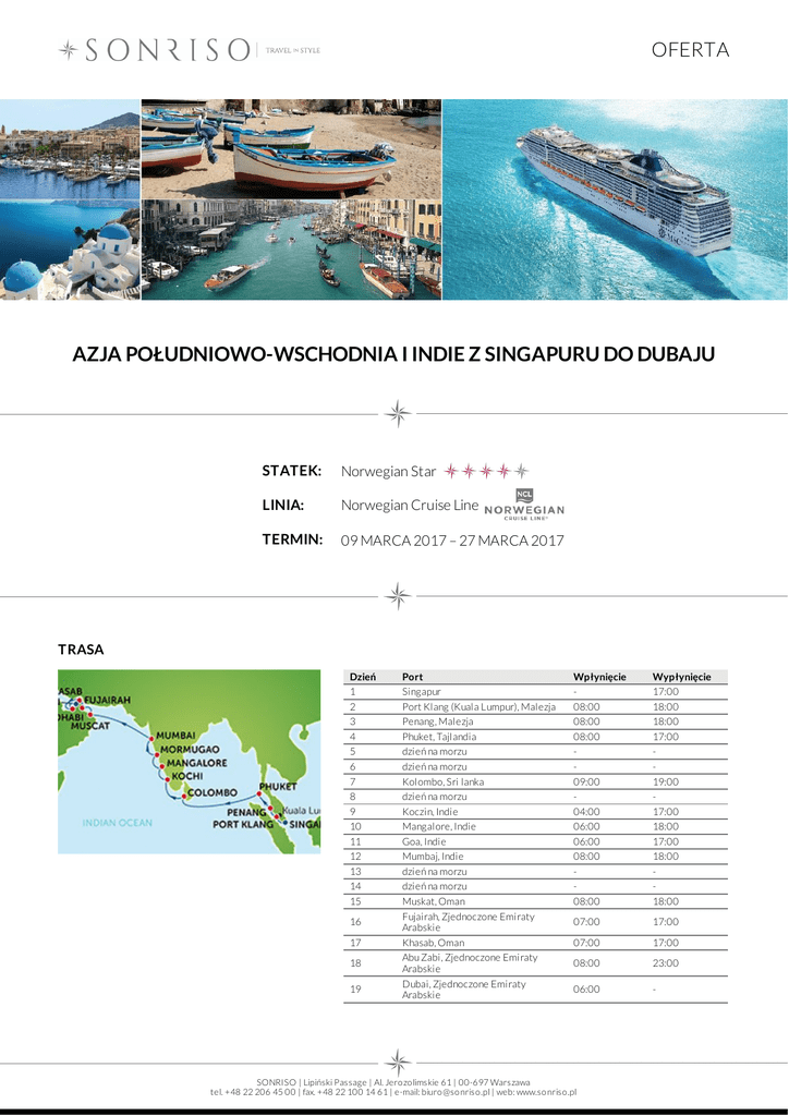 OFERTA AZJA POŁUDNIOWO-WSCHODNIA I INDIE Z SINGAPURU DO DUBAJU STATEK: Norwegian Star LINIA: Norwegian Cruise Line TERMIN: 09 MARCA 2017 – 27 MARCA 2017 TRASA Dzień 1 2 3 4 5 6 7 8 9 10 11 12 13 14 15 16 17 18 19 Port Singapur Port Klang (Kuala Lumpur), Malezja Penang, Malezja Phuket, Tajlandia dzień na morzu dzień na morzu Kolombo, Sri lanka dzień na morzu Koczin, Indie Mangalore, Indie Goa, Indie Mumbaj, Indie dzień na morzu dzień na morzu Muskat, Oman Fujairah, Zjednoczone Emiraty Arabskie Khasab, Oman Abu Zabi, Zjednoczone Emiraty Arabskie Dubai, Zjednoczone Emiraty Arabskie Wpłynięcie 08:00 08:00 08:00 09:00 04:00 06:00 06:00 08:00 08:00 Wypłynięcie 17:00 18:00 18:00 17:00 19:00 17:00 18:00 17:00 18:00 18:00 07:00 17:00 07:00 17:00 08:00 23:00 06:00 - SONRISO | Lipiński Passage | Al. Jero zo limskie 61 | 00-697 Warszawa tel. +48 22 206 45 00 | fax. +48 22 100 14 61 | e-mail: biuro @so nriso .pl | web: www.so nriso .pl OFERTA CENA Typ kabiny Cena z osobę Kabina wewnętrzna od 2 199 EUR Kabina z oknem od 2 349 EUR Kabina z balkonem od 2 949 EUR CENA ZAWIERA DOTATKOWE OPŁATY zakwaterowanie w 2 - os. kabinie wybranej kategorii pełne wyżywienie: 3 posiłki, przekąski między posiłakmi, bufet o północy napoje do posiłków: woda stołowa, kawa, herbata oraz sok do śniadania serwis bagażowy podczas wejścia i zejścia ze statku 24 godzinny serwis kabinowy korzystanie z urządzeń sportowo - rekreacyjnych dostępnych na pokładzie (baseny, jacuzzi, boiska sportowe, kluby dla dzieci i młodzieży itp.) udział we wszystkich imprezach organizowanych na pokładzie (przedstawienia, pokazy, aukcje, animacje i inne) obowiązkowe opłaty portowe dojazd/przelot do portu rozpoczęcia i zakończenia rejsu transfery (lotnisko - port - lotnisko) ewentualne noclegi przed lub po rejsie wycieczki fakultatywne napoje: bezalkoholowe, alkoholowe, woda mineralna dostępne w restauracjach i barach (istnieje możliwość wykupienia pakietów napojów, o szczegóły zapytaj w biurze) korzystanie z mini baru w kabinie korzystanie z usług typu: SPA, salon piękności, pralnia itp. wydatki osobiste tj. zakupy w butikach, internet, kasyno itp. obowiązkowa opłata serwisowa (napiwki dla obsługi statku ok. 12 USD/os. dorosła/dzień, dzieci poniżej 3 lat nie płacą) obowiązkowe ubezpieczenie turystyczne koszt wymaganych wiz ewentualna opłata paliwowa (linia w momencie wzrotu cen ropy zastrzega sobie prawo do dodania oplaty paliwowej do każdej rezerwacji) Na życzenie świadczymy dodatkowo usługi: rezerwacje hotelowe na całym świecie rezerwacje biletów lotniczych, trasferów oraz parkingu w porcie rezerwacje wycieczek fakultatywnych i innych atrakcji SONRISO | Lipiński Passage | Al. Jero zo limskie 61 | 00-697 Warszawa tel. +48 22 206 45 00 | fax. +48 22 100 14 61 | e-mail: biuro @so nriso .pl | web: www.so nriso .pl