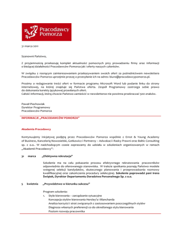 31 marca 2011 Szanowni Państwo, Z przyjemnością przekazuję komplet aktualności pomocnych przy prowadzeniu firmy oraz informacji o bieżącej działalności Pracodawców Pomorza jak i oferty naszych członków. W związku z rosnącym zainteresowaniem przekazywaniem swoich ofert za pośrednictwem newslettera Pracodawców Pomorza uprzejmie proszę o przesyłanie ich na adres: [email protected]. Prosimy o redagowanie treści ofert w formacie programu Microsoft Word lub podanie linku do strony internetowej, na której znajduje się Państwa oferta. Zespół Programowy zastrzega sobie prawo do dokonania korekty językowej przesłanych ofert. Całość informacji, którą chcecie Państwo zamieścić w newsletterze nie powinna przekraczać 500 znaków. Paweł Piechowiak Dyrektor Programowy Pracodawców Pomorza INFORMACJE „PRACODAWCÓW POMORZA” Akademia Pracodawcy Kontynuujemy inicjatywę podjętą przez Pracodawców Pomorza wspólnie z Ernst & Young Academy of Business, Kancelarią Nowosielski, Gotkowicz i Partnerzy – Adwokaci i Radcy Prawni oraz Baltic Consulting sp. z o.o.. W nadchodzącym czasie zapraszamy do udziału w szkoleniach organizowanych w ramach „Akademii Pracodawcy”: 31 marca „Efektywna rekrutacja” Szkolenie ma na celu pokazanie procesu efektywnego rekrutowania pracowników odpowiednio do oferowanego stanowiska. W trakcie spotkania poznają Państwo modele wstępnej selekcji kandydatów, skutecznego planowania i przeprowadzania rozmowy kwalifikacyjnej oraz zakończenia procedury selekcyjnej. Szkolenie poprowadzi pani Irena Świątek, Dyrektor Departamentu Doradztwa Personalnego Sp. z o.o. 5 kwietnia „Przywództwo w kierunku sukcesu” Program szkolenia: 1. Style kierowania – zarządzanie sytuacyjne Koncepcja stylów kierowania Hersley’a i Blancharda Analiza korzyści i strat związanych z zastosowaniem poszczególnych stylów Diagnoza własnych preferencji co do określonego stylu kierowania Poziom rozwoju pracownika 2. Poziom rozwoju pracownika Parametry chęci (motywacji) i kompetencji (umiejętności koniecznych do wykonania zadań na stanowisku) Omówienie matrycy Co można zrobić z kompetentnym i niechętnym? Szkolenie poprowadzi pani Małgorzata Mieckiewicz trener Ernst & Young Academy of Business. Szkolenia są prowadzone przez doświadczonych trenerów i dotyczą istotnych problemów pojawiających się w trakcie prowadzenia działalności gospodarczej. Udział we wszystkich szkoleniach jest całkowicie bezpłatny, jednakże ilość miejsc jest ograniczona. Szkolenia odbywać się będą w Villi Uphagena, przy ulicy J. Uphagena 23, o godzinie 17:00. Prosimy o potwierdzenie rejestracji na adres e-mail: [email protected]. Terminy kolejnych spotkań i ich tematykę znajdziecie Państwo tutaj. Akademia Młodego Pracodawcy – Pierwsze Kroki w Biznesie W najbliższych dniach ruszamy z kolejną inicjatywą "Akademia Młodego Pracodawcy - Pierwsze Kroki w Biznesie". Projekt ten kierujemy do studentów, mających ambicje otwarcia i prowadzenia własnej działalności gospodarczej, jak i do wszystkich osób chcących wkroczyć ze swoimi pomysłami w świat biznesu. Proponujemy udział w następujących szkoleniach: 06.04.2011 13.04.2011 20.04.2011 11.05.2011 18.05.2011 25.05.2011 Prawne aspekty rozpoczęcia i prowadzenia działalności gospodarczej Tworzenie biznesplanu a pozyskiwanie środków unijnych na jego realizację Finansowe aspekty prowadzenia działalności gospodarczej Podatkowe aspekty prowadzenia działalności gospodarczej Pozyskiwanie klientów a działania marketingowe Umowy w obrocie handlowym – podstawowe aspekty Szkolenia w ramach Akademii Młodego Pracodawcy prowadzone będą przez młodych, dynamicznych praktyków, którzy z własnych doświadczeń wiedzą na jakie problemy można się natknąc przy zakładaniu i prowadzeniu działalności. Po zakończeniu cyklu szkoleń uroczyste rozdanie CERTYFIKATÓW w Dworze Artusa. Spotkania odbywac się będą w Villi Uphagena, mieszczącej się przy ulicy Jana Uphagena 23 w Gdańsku, w godzinach od 17.00 do 19.00. Udział w Akademii jest całkowicie bezpłatny, zgłoszenia prosimy kierować na adres e-mail: [email protected] Spotkanie Sekcji Budownictwa i Infrastruktury W imieniu przewodniczącego Sekcji Budownictwa i Infrastruktury „Pracodawców Pomorza” pana Zbigniewa Borkowskiego serdecznie zapraszamy na kolejne spotkanie członków sekcji w dniu 7 kwietnia 2011 roku o godzinie 17.30 do restauracji „OPERA” w Sopocie (przy Operze Leśnej). Tematem spotkania będzie: „Rynek budowlany w 2011 roku”. Uprzejmie prosimy o potwierdzenie udziału w spotkaniu do Biura Pracodawców Pomorza pod numerem tel. 058 345-83-74 lub za pośrednictwem poczty e-mail na adres: [email protected]. Program Ograniczania Barier Administracyjnych Pracodawcy Pomorza rozpoczynają realizację programu zmierzającego do ograniczania barier administracyjnych utrudniających prowadzenie działalności gospodarczej. Program ma na celu określenie obszarów prawa, które zdaniem naszych członków stanowią największe trudności w prowadzeniu działalności. W ramach prowadzonego badania Pracodawcy Pomorza planują ustalić także jak oceniana jest Państwa współpraca z organami administracji publicznej, m.in. z samorządami, organami administracji skarbowej oraz z innymi podmiotami, prowadzącymi działalność kontrolną. Wyniki powyższych analiz mają służyć określeniu, które z zagadnięć wymagają pilnej interwencji legislacyjnej. Więcej informacji jak i ankietę do wypełnienia znajdą Państwo tutaj. Uwaga! W piątek została wysłana ankieta dotycząca współpracy sfery biznesu ze szkolnictwem wyższym. Pragniemy w tym miejscu zaznaczyć, że o wypełnienie ankiety uprzejmie prosimy wyłącznie pracodawców prowadzących działalność szkoleniową. Majówka Pomorskich Przedsiębiorców Serdecznie zapraszamy Państwa na imprezę integracyjną w VIII rocznicę akcesji Polski do UE pn. „ MAJÓWK