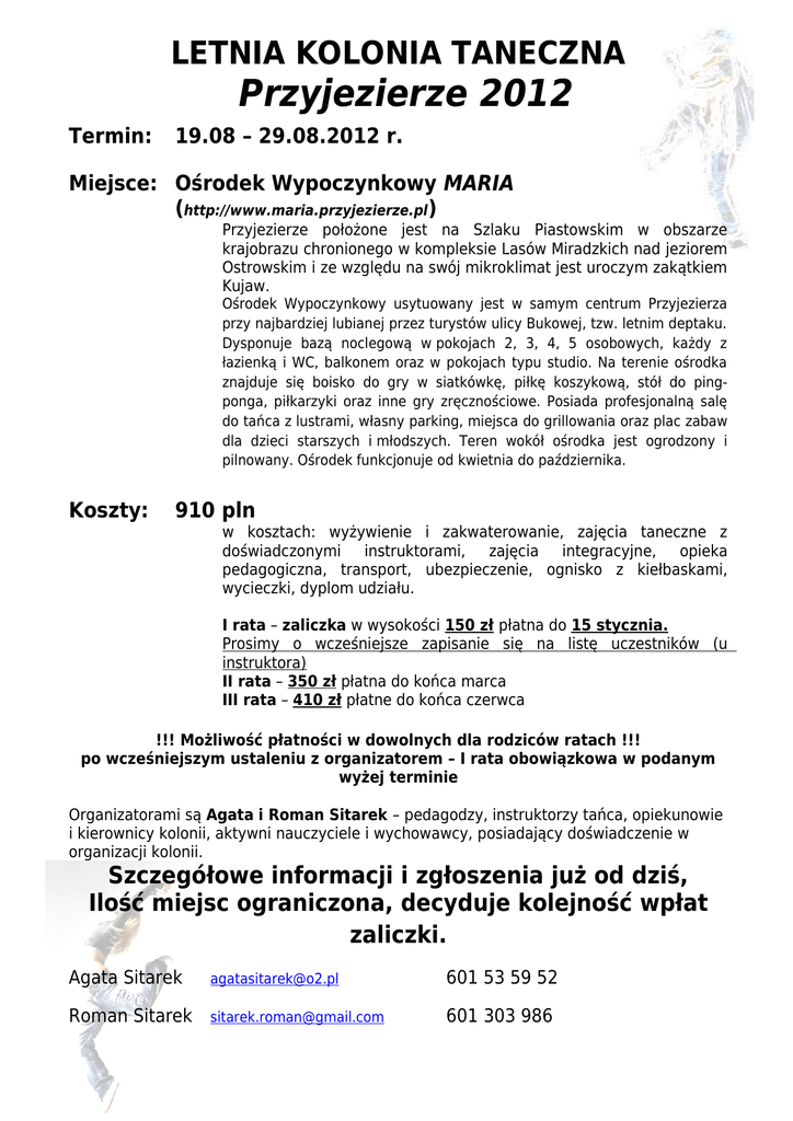 LETNIA KOLONIA TANECZNA Przyjezierze 2012 Termin: 19.08 – 29.08.2012 r. Miejsce: Ośrodek Wypoczynkowy MARIA (http://www.maria.przyjezierze.pl) Przyjezierze położone jest na Szlaku Piastowskim w obszarze krajobrazu chronionego w kompleksie Lasów Miradzkich nad jeziorem Ostrowskim i ze względu na swój mikroklimat jest uroczym zakątkiem Kujaw. Ośrodek Wypoczynkowy usytuowany jest w samym centrum Przyjezierza przy najbardziej lubianej przez turystów ulicy Bukowej, tzw. letnim deptaku. Dysponuje bazą noclegową w pokojach 2, 3, 4, 5 osobowych, każdy z łazienką i WC, balkonem oraz w pokojach typu studio. Na terenie ośrodka znajduje się boisko do gry w siatkówkę, piłkę koszykową, stół do pingponga, piłkarzyki oraz inne gry zręcznościowe. Posiada profesjonalną salę do tańca z lustrami, własny parking, miejsca do grillowania oraz plac zabaw dla dzieci starszych i młodszych. Teren wokół ośrodka jest ogrodzony i pilnowany. Ośrodek funkcjonuje od kwietnia do października. Koszty: 910 pln w kosztach: wyżywienie i zakwaterowanie, zajęcia taneczne z doświadczonymi instruktorami, zajęcia integracyjne, opieka pedagogiczna, transport, ubezpieczenie, ognisko z kiełbaskami, wycieczki, dyplom udziału. I rata – zaliczka w wysokości 150 zł płatna do 15 stycznia. Prosimy o wcześniejsze zapisanie się na listę uczestników (u instruktora) II rata – 350 zł płatna do końca marca III rata – 410 zł płatne do końca czerwca !!! Możliwość płatności w dowolnych dla rodziców ratach !!! po wcześniejszym ustaleniu z organizatorem – I rata obowiązkowa w podanym wyżej terminie Organizatorami są Agata i Roman Sitarek – pedagodzy, instruktorzy tańca, opiekunowie i kierownicy kolonii, aktywni nauczyciele i wychowawcy, posiadający doświadczenie w organizacji kolonii. Szczegółowe informacji i zgłoszenia już od dziś, Ilość miejsc ograniczona, decyduje kolejność wpłat zaliczki. Agata Sitarek [email protected] 601 53 59 52 Roman Sitarek [email protected] 601 303 986