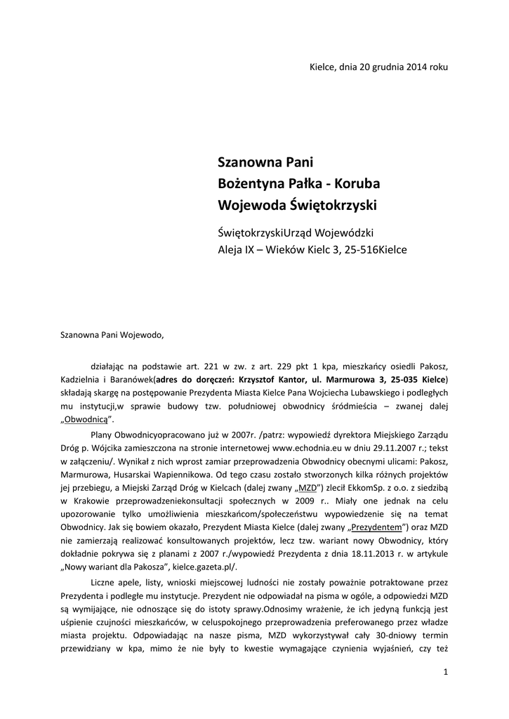 Kielce, dnia 20 grudnia 2014 roku Szanowna Pani Bożentyna Pałka - Koruba Wojewoda Świętokrzyski ŚwiętokrzyskiUrząd Wojewódzki Aleja IX – Wieków Kielc 3, 25-516Kielce Szanowna Pani Wojewodo, działając na podstawie art. 221 w zw. z art. 229 pkt 1 kpa, mieszkaocy osiedli Pakosz, Kadzielnia i Baranówek(adres do doręczeo: Krzysztof Kantor, ul. Marmurowa 3, 25-035 Kielce) składają skargę na postępowanie Prezydenta Miasta Kielce Pana Wojciecha Lubawskiego i podległych mu instytucji,w sprawie budowy tzw. południowej obwodnicy śródmieścia – zwanej dalej „Obwodnicą”. Plany Obwodnicyopracowano już w 2007r. /patrz: wypowiedź dyrektora Miejskiego Zarządu Dróg p. Wójcika zamieszczona na stronie internetowej www.echodnia.eu w dniu 29.11.2007 r.; tekst w załączeniu/. Wynikał z nich wprost zamiar przeprowadzenia Obwodnicy obecnymi ulicami: Pakosz, Marmurowa, Husarskai Wapiennikowa. Od tego czasu zostało stworzonych kilka różnych projektów jej przebiegu, a Miejski Zarząd Dróg w Kielcach (dalej zwany „MZD”) zlecił EkkomSp. z o.o. z siedzibą w Krakowie przeprowadzeniekonsultacji społecznych w 2009 r.. Miały one jednak na celu upozorowanie tylko umożliwienia mieszkaocom/społeczeostwu wypowiedzenie się na temat Obwodnicy. Jak się bowiem okazało, Prezydent Miasta Kielce (dalej zwany „Prezydentem”) oraz MZD nie zamierzają realizowad konsultowanych projektów, lecz tzw. wariant nowy Obwodnicy, który dokładnie pokrywa się z planami z 2007 r./wypowiedź Prezydenta z dnia 18.11.2013 r. w artykule „Nowy wariant dla Pakosza”, kielce.gazeta.pl/. Liczne apele, listy, wnioski miejscowej ludności nie zostały poważnie potraktowane przez Prezydenta i podległe mu instytucje. Prezydent nie odpowiadał na pisma w ogóle, a odpowiedzi MZD są wymijające, nie odnoszące się do istoty sprawy.Odnosimy wrażenie, że ich jedyną funkcją jest uśpienie czujności mieszkaoców, w celuspokojnego przeprowadzenia preferowanego przez władze miasta projektu. Odpowiadając na nasze pisma, MZD wykorzystywał cały 30-dniowy termin przewidziany w kpa, mimo że nie były to kwestie wymagające czynienia wyjaśnieo, czy też 1 szczególnie skomplikowane. Mieszkaocom, którzy zgłaszali się bezpośrednio do MZD nie udzielanoinformacji, twierdząc, że projekt Obwodnicy jest dopiero w fazie koncepcyjnej. Nikt nie próbował nawet zorganizowad konsultacji społecznych dla tzw. projektu nowego Obwodnicy. Próbowano natomiast straszyd mieszkaoców specustawą w kieleckich mediach. Wszystkie tedziałania naruszają obowiązujące przepisy i nie mają nic wspólnego z poważnym traktowaniem obywateli, jako współgospodarzy miasta. Czujemy się traktowani przedmiotowo, tylko i wyłącznie jako płatnicy podatków, a nie jak obywatele, którzy mają coś do powiedzenia w żywotnych dla siebie sprawach. Aby nie byd gołosłownym, chcemy przedstawid tutaj tylko jeden z mechanizmów, potwierdzający stosowanie wobec nas wybiegów. Na początku 2013 r. w związku z informacjami prasowymi zaniepokojeni mieszkaocy Pakosza skierowali list otwarty do Prezydenta Miasta w sprawie tzw. nowego projektu Obwodnicy. Prezydent jak zwykle nie udzielił nam odpowiedzi, natomiast odpowiedział nam MZD, w kilku nic nie znaczących zdaniach powiadamiając nas, że „trwają prace projektowe nad uszczegółowieniem przebiegu obwodnicy śródmieścia” i „rozmowy międzywydziałowe MZD jak i jednostek Urzędu Miasta”. W związku z tym „odpowiedź na zagadnienia zawarte w liście /…/ będzie udzielona niezwłocznie po dokonaniu uzgodnieo” /pełny tekst przedkładamy w załączeniu/. Pismo jest datowane na 28 lutego 2013 r. W październiku 2014 r. przypadkowo zwróciliśmy uwagę na obwieszczenie Prezydentaw sprawie wszczęcia postępowania o wydanie decyzji o środowiskowych uwarunkowaniach dla przedsięwzięcia pn. „Rozbudowa ulicy Wapiennikowej w Kielcach”, które to przedsięwzięcie jest ściśle związane z przebiegiem całej Obwodnicy. Natychmiast złożyliśmy pisma do Prezydenta, Regionalnego Dyrektora Ochrony Środowiska w Kielcach (dalej zwanej „RDOŚ”) oraz MZD o zawieszenie tego postępowania do czasu rozstrzygnięcia sprawy tzw. południowej obwodnicy śródmieścia. Najszybciej odpowiedziała RDOŚ. Ku naszemu ogromnemu zdziwieniuuzyskaliśmy od Niej informację, że MZD jako inwestor skierował do RDOŚ wniosek o wydanie decyzji o środowiskowych uwarunkowaniach dla przedsięwzięcia pn. „Budowa południowej obwodnicy miasta Kielce”. Wkrótce z zapowiadanego w tekście obwieszczenia dowiedzieliśmy się, że wniosek ten MZD złożył już 22 lipca 2014 r., a później kilka razy go uzupełniał. Pytamy: dlaczego MZD, mimo złożonego na piśmie zobowiązania, nie poinformował nas o tym przed 22 lipca 2014 r. ? Gdyby nie przypadek polegający na przeczytaniu obwieszczenia Prezydenta o rozbudowie ul. Wapiennikowej i podjęte w związku z tym nasze działania, mieszkaocy nie dowiedzieliby się o formalnych krokach MZD, tracąc tym samym możliwośd wypowiedzenia się w sprawie całej Obwodnicy. Analiza tych faktów prowadzi do jednoznacznego dla nas wniosku, że brak odpowiedzi był zamierzony i wymierzony w mieszkaoców. Takie działania podważają zaufanie społeczeostwa w stosunku do władz. Ponadto zarzucamy Prezydentowi i podległym mu organom, że celowo, używając określenia „południowa obwodnica śródmieścia”, wprowadzają w błąd mieszkaoców Kielc i w związku z tym projektem, działa On na ich szkodę. W Karcie informacyjnej złożonej do RDOŚ dot. ww. inwestycji MZD przyznaje, że droga ta ma służyd ruchowitranzytowemu.Jest oczywiste, że dotyczy to również ciężkich samochodów – tirów, ponieważ w Karcie informacyjnej nie przewiduje się ograniczenia tonażu; wskazuje na to także szerokośd planowanej Obwodnicy.Droga ta będzie zbierad ruch tranzytowy z kierunku Łodzi, Krakowa i Warszawy,i poprzez węzły Skrzetle, Żelazna 