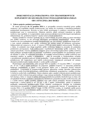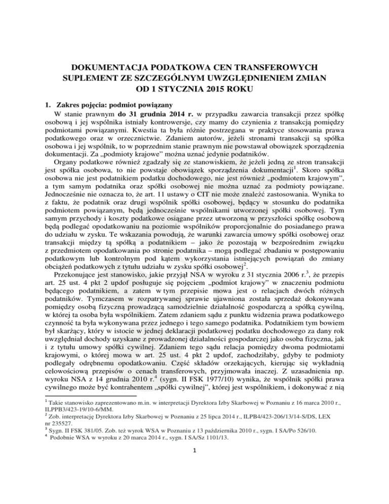 DOKUMENTACJA PODATKOWA CEN TRANSFEROWYCH SUPLEMENT ZE SZCZEGÓLNYM UWZGLĘDNIENIEM ZMIAN OD 1 STYCZNIA 2015 ROKU 1. Zakres pojęcia: podmiot powiązany W stanie prawnym do 31 grudnia 2014 r. w przypadku zawarcia transakcji przez spółkę osobową i jej wspólnika istniały kontrowersje, czy mamy do czynienia z transakcją pomiędzy podmiotami powiązanymi. Kwestia ta była różnie postrzegana w praktyce stosowania prawa podatkowego oraz w orzecznictwie. Zdaniem autorów, jeżeli stronami transakcji są spółka osobowa i jej wspólnik, to w poprzednim stanie prawnym nie powstawał obowiązek sporządzenia dokumentacji. Za „podmioty krajowe” można uznać jedynie podatników. Organy podatkowe również zgadzały się ze stanowiskiem, że jeżeli jedną ze stron transakcji jest spółka osobowa, to nie powstaje obowiązek sporządzenia dokumentacji1. Skoro spółka osobowa nie jest podatnikiem podatku dochodowego, nie jest również „podmiotem krajowym”, a tym samym podatnika oraz spółki osobowej nie można uznać za podmioty powiązane. Jednocześnie nie oznacza to, że art. 11 ustawy o CIT nie może znaleźć zastosowania. Wynika to z faktu, że podatnik oraz drugi wspólnik spółki osobowej, będący w stosunku do podatnika podmiotem powiązanym, będą jednocześnie wspólnikami utworzonej spółki osobowej. Tym samym przychody i koszty podatkowe osiągane przez utworzoną w przyszłości spółkę osobową będą podlegać opodatkowaniu na poziomie wspólników proporcjonalnie do posiadanego prawa do udziału w zysku. Te wskazania powodują, że warunki zawarcia umowy spółki osobowej oraz transakcji między tą spółką a podatnikiem – jako że pozostają w bezpośrednim związku z przedmiotem opodatkowania po stronie podatnika – mogą podlegać zbadaniu w postępowaniu podatkowym lub kontrolnym pod kątem wykorzystania istniejących powiązań do zmiany obciążeń podatkowych z tytułu udziału w zysku spółki osobowej2. Przekonujące jest stanowisko, jakie przyjął NSA w wyroku z 31 stycznia 2006 r.3, że przepis art. 25 ust. 4 pkt 2 updof posługuje się pojęciem „podmiot krajowy” w znaczeniu podmiotu będącego podatnikiem, a zatem w tym przepisie mowa jest o relacjach dwóch różnych podatników. Tymczasem w rozpatrywanej sprawie ujawniona została sprzedaż dokonywana pomiędzy osobą fizyczną prowadzącą samodzielnie działalność gospodarczą a spółką cywilną, w której ta osoba była wspólnikiem. Zatem zdaniem sądu z punktu widzenia prawa podatkowego czynność ta była wykonywana przez jednego i tego samego podatnika. Podatnikiem tym bowiem był skarżący, który w istocie w jednej deklaracji podatkowej podatku dochodowego za dany rok uwzględniał dochody uzyskane z prowadzonej działalności gospodarczej jako osoba fizyczna, jak i z tytułu umowy spółki cywilnej. Zdaniem tego sądu relacja pomiędzy dwoma podmiotami krajowymi, o której mowa w art. 25 ust. 4 pkt 2 updof, zachodziłaby, gdyby te podmioty podlegały odrębnemu opodatkowaniu. Część składów orzekających, kierując się wykładnią celowościową przepisów o cenach transferowych, przyjmowała inaczej. Z uzasadnienia np. wyroku NSA z 14 grudnia 2010 r.4 (sygn. II FSK 1977/10) wynika, że wspólnik spółki prawa cywilnego może być kontrahentem „spółki cywilnej”, której jest wspólnikiem, i dokonywać z nią 1 Takie stanowisko zaprezentowano m.in. w interpretacji Dyrektora Izby Skarbowej w Poznaniu z 16 marca 2010 r., ILPPB3/423-19/10-6/MM. 2 Zob. interpretację Dyrektora Izby Skarbowej w Poznaniu z 25 lipca 2014 r., ILPB4/423-206/13/14-S/DS, LEX nr 235527. 3 Sygn. II FSK 381/05. Zob. też wyrok WSA w Poznaniu z 13 października 2010 r., sygn. I SA/Po 526/10. 4 Podobnie WSA w wyroku z 20 marca 2014 r., sygn. I SA/Sz 1101/13. 1 Marcin Jamroży, Renata Papała transakcji. Ten stan rzeczy ma doniosłe konsekwencje na gruncie podatku dochodowego od osób fizycznych. Może prowadzić do zmniejszenia podstawy opodatkowania poprzez ustanawianie w transakcjach warunków odbiegających od tych, jakich należałoby oczekiwać, gdyby powiązania nie istniały. Celem wprowadzenia regulacji określonej w art. 25 updof było stworzenie mechanizmu decyzyjnego urealniania warunków dla ustalenia rzeczywistych wolnych od manipulacji podstaw opodatkowania i w konsekwencji określania zobowiązań podatkowych we właściwej wysokości. Wprowadzenie w art. 30d ustawy o podatku dochodowego od osób fizycznych sankcyjnej stawki podatkowej ma na celu wyeliminowanie negatywnego zjawiska, jakim jest przerzucanie dochodu. Tego rodzaju zabieg prawodawczy znajduje uzasadnienie legislacyjne w zasadzie powszechności opodatkowania ustanowionej w art. 84 Konstytucji RP. Natomiast wyłączenie spółek cywilnych z kręgu podmiotów mogących być uznanymi za „podmioty krajowe” w rozumieniu art. 25 ust. 4 updof naruszałoby tę zasadę. W konsekwencji uznać należy, zdaniem sądu, że działania organów prowadzących postępowanie polegające na badaniu zdarzeń gospodarczych w relacjach pomiędzy (...) a spółką (...) były w pełni uprawnione. Nie oznacza to jednak, że przepis art. 11 updop nie może znaleźć zastosowania, jeżeli podatnik (wspólnik spólki osobowej) oraz pozostali wspólnicy (podatnicy) są podmiotami powiązanymi. Jeżeli więc warunki transkacji zawieranych przez wspólnika ze spółką osobową (w powiązaniu ze sposobem ustalania praw do udziału w zyskach spółki osobowej) odbiegałyby od warunków, jakie ustaliłyby podmioty niepowiązane i w następstwie tego wspólnik uzyskiwałby dochody niższe od tych, jakich należałoby oczekiwać, gdyby powiązania (z innymi wspólnikami) nie istniały, to w takim przypadku organy podatkowe mogą określić dochód podatnika bez uwzględnienia warunków wynikających z tych powiązań. Taka teza znajduje się w części dotyczącej stanowiska organu podatkowego w nieprawomocnym wyroku WSA z 28 maja 2013 r., jak