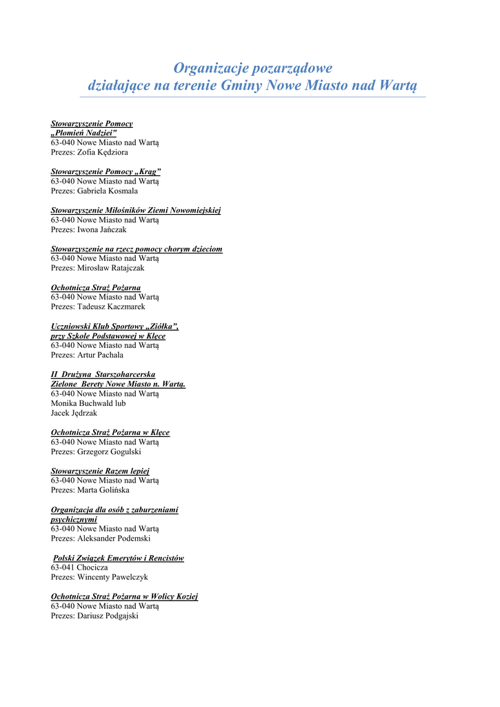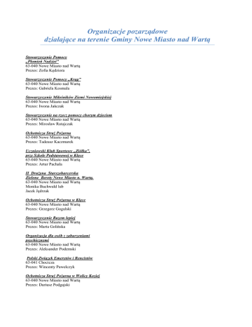 Organizacje pozarządowe działające na terenie Gminy Nowe Miasto nad Wartą Stowarzyszenie Pomocy „Płomień Nadziei” 63-040 Nowe Miasto nad Wartą Prezes: Zofia Kędziora Stowarzyszenie Pomocy „Krąg” 63-040 Nowe Miasto nad Wartą Prezes: Gabriela Kosmala Stowarzyszenie Miłośników Ziemi Nowomiejskiej 63-040 Nowe Miasto nad Wartą Prezes: Iwona Jańczak Stowarzyszenie na rzecz pomocy chorym dzieciom 63-040 Nowe Miasto nad Wartą Prezes: Mirosław Ratajczak Ochotnicza Straż Pożarna 63-040 Nowe Miasto nad Wartą Prezes: Tadeusz Kaczmarek Uczniowski Klub Sportowy „Ziółka”, przy Szkole Podstawowej w Klęce 63-040 Nowe Miasto nad Wartą Prezes: Artur Pachala II Drużyna Starszoharcerska Zielone Berety Nowe Miasto n. Wartą. 63-040 Nowe Miasto nad Wartą Monika Buchwald lub Jacek Jędrzak Ochotnicza Straż Pożarna w Klęce 63-040 Nowe Miasto nad Wartą Prezes: Grzegorz Gogulski Stowarzyszenie Razem lepiej 63-040 Nowe Miasto nad Wartą Prezes: Marta Golińska Organizacja dla osób z zaburzeniami psychicznymi 63-040 Nowe Miasto nad Wartą Prezes: Aleksander Podemski Polski Związek Emerytów i Rencistów 63-041 Chocicza Prezes: Wincenty Pawelczyk Ochotnicza Straż Pożarna w Wolicy Koziej 63-040 Nowe Miasto nad Wartą Prezes: Dariusz Podgajski Gminne Towarzystwo Sportowe PhytoPharm 63-040 Nowe Miasto nad Wartą Komitet założycielski: Piotr Czeszyk Łukasz Zawadzki Jacek Parus Stowarzyszenie „Zielona Linia” Przystań rzeczna „Marina pod Czarnym Bocianem” Prezes: Małgorzata Sudnik- Lisiecka