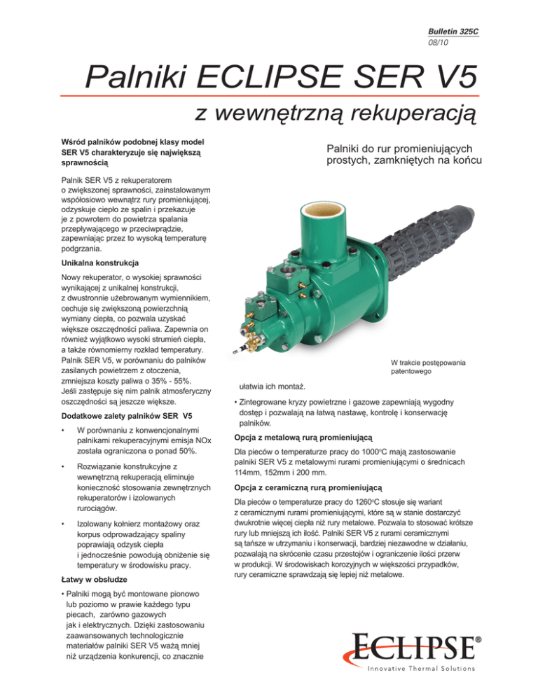 Bulletin 325C 08/10 Palniki ECLIPSE SER V5 z wewnętrzną rekuperacją Wśród palników podobnej klasy model SER V5 charakteryzuje się największą sprawnością Palniki do rur promieniujących prostych, zamkniętych na końcu Palnik SER V5 z rekuperatorem o zwiększonej sprawności, zainstalowanym współosiowo wewnątrz rury promieniującej, odzyskuje ciepło ze spalin i przekazuje je z powrotem do powietrza spalania przepływającego w przeciwprądzie, zapewniając przez to wysoką temperaturę podgrzania. Unikalna konstrukcja Nowy rekuperator, o wysokiej sprawności wynikającej z unikalnej konstrukcji, z dwustronnie użebrowanym wymiennikiem, cechuje się zwiększoną powierzchnią wymiany ciepła, co pozwala uzyskać większe oszczędności paliwa. Zapewnia on również wyjątkowo wysoki strumień ciepła, a także równomierny rozkład temperatury. Palnik SER V5, w porównaniu do palników zasilanych powietrzem z otoczenia, zmniejsza koszty paliwa o 35% - 55%. Jeśli zastępuje się nim palnik atmosferyczny oszczędności są jeszcze większe. Dodatkowe zalety palników SER V5 • • • W porównaniu z konwencjonalnymi palnikami rekuperacyjnymi emisja NOx została ograniczona o ponad 50%. Rozwiązanie konstrukcyjne z wewnętrzną rekuperacją eliminuje konieczność stosowania zewnętrznych rekuperatorów i izolowanych rurociągów. Izolowany kołnierz montażowy oraz korpus odprowadzający spaliny poprawiają odzysk ciepła i jednocześnie powodują obniżenie się temperatury w środowisku pracy. Łatwy w obsłudze • Palniki mogą być montowane pionowo lub poziomo w prawie każdego typu piecach, zarówno gazowych jak i elektrycznych. Dzięki zastosowaniu zaawansowanych technologicznie materiałów palniki SER V5 ważą mniej niż urządzenia konkurencji, co znacznie W trakcie postępowania patentowego ułatwia ich montaż. • Zintegrowane kryzy powietrzne i gazowe zapewniają wygodny dostęp i pozwalają na łatwą nastawę, kontrolę i konserwację palników. Opcja z metalową rurą promieniującą Dla pieców o temperaturze pracy do 1000oC mają zastosowanie palniki SER V5 z metalowymi rurami promieniującymi o średnicach 114mm, 152mm i 200 mm. Opcja z ceramiczną rurą promieniującą Dla pieców o temperaturze pracy do 1260oC stosuje się wariant z ceramicznymi rurami promieniującymi, które są w stanie dostarczyć dwukrotnie więcej ciepła niż rury metalowe. Pozwala to stosować krótsze rury lub mniejszą ich ilość. Palniki SER V5 z rurami ceramicznymi są tańsze w utrzymaniu i konserwacji, bardziej niezawodne w działaniu, pozwalają na skrócenie czasu przestojów i ograniczenie ilości przerw w produkcji. W środowiskach korozyjnych w większości przypadków, rury ceramiczne sprawdzają się lepiej niż metalowe. Palniki SER V5 Do nagrzewania pośredniego, gdzie istotne jest zużycie paliwa, równomierność rozkładu temperatury i niska emisja. Izolowany wylot spalin Wlot powietrza Wlot gazu Dwustronnie użebrowany wymiennik ciepła zapewnia większą sprawność Izolowany korpus zapewnia niższą temperaturę w środowisku pracy Recyrkulacja spalin zwiększa równomierność rozkładu temperatury i obniża emisję Płomień o dużej prędkości Wkłady z węglika krzemu zwiększają żywotność rury promieniującej Doskonałe rozwiązanie przy modernizacjach Palniki SER V5 idealnie nadają się do modernizacji istniejących pieców, która sprowadza się do wymiany palników i usunięcia zewnętrznych rekuperatorów. Palniki SER V5 mogą być montowane w pozycji pionowej i poziomej, nadają się do pieców do pracy ciągłej i okresowej z różnego rodzaju atmosferami. W porównaniu do konkurencyjnych palników model SER V5 charakteryzuje się znacznie niższą emisją. Oprócz tego, że palniki SER V5 pozwalają uzyskać olbrzymie oszczędności paliwa, to dostarczają one więcej ciepła i zapewniają doskonałe wyrównanie temperatury. W rezultacie, użytkownicy mogą uzyskać zarówno poprawę jakości produktu jak i wydajności przy skróconym czasie cyklu pracy. Bulletin 325C 08/10