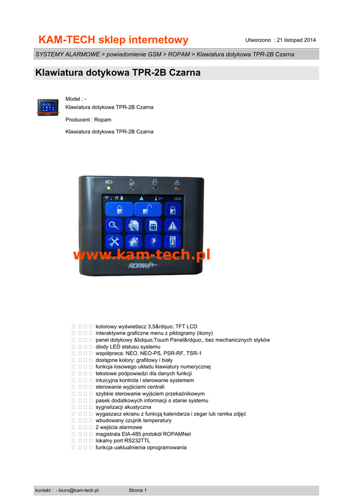 KAM-TECH sklep internetowy Utworzono : 21 listopad 2014 SYSTEMY ALARMOWE > powiadomienie GSM > ROPAM > Klawiatura dotykowa TPR-2B Czarna Klawiatura dotykowa TPR-2B Czarna Model : Klawiatura dotykowa TPR-2B Czarna Producent : Ropam Klawiatura dotykowa TPR-2B Czarna � ��� kolorowy wyświetlacz 3,5” TFT LCD � ��� interaktywne graficzne menu z piktogramy (ikony) � ��� panel dotykowy „Touch Panel”, bez mechanicznych styków � ��� diody LED statusu systemu � ��� współpraca: NEO, NEO-PS, PSR-RF, TSR-1 � ��� dostępne kolory: grafitowy i biały � ��� funkcja losowego układu klawiatury numerycznej � ��� tekstowe podpowiedzi dla danych funkcji � ��� intuicyjna kontrola i sterowanie systemem � ��� sterowanie wyjściami centrali � ��� szybkie sterowanie wyjściem przekaźnikowym � ��� pasek dodatkowych informacji o stanie systemu � ��� sygnalizacji akustyczna � ��� wygaszacz ekranu z funkcją kalendarza i zegar lub ramka zdjęć � ��� wbudowany czujnik temperatury � ��� 2 wejścia alarmowe � ��� magistrala EIA-485 protokół ROPAMNet � ��� lokalny port RS232TTL � ��� funkcja uaktualnienia oprogramowania kontakt : - [email protected] Strona 1 KAM-TECH sklep internetowy Utworzono : 21 listopad 2014 SYSTEMY ALARMOWE > powiadomienie GSM > ROPAM > Klawiatura dotykowa TPR-2B Czarna Klawiatura dotykowa TPR-2B Czarna Panel dotykowy TPR-2 to nowoczesny element sterowania i kontroli systemu alarmowego. TPR-2 zbudowany jest w oparciu o kolorowy wyświetlacz TFT LCD z panelem dotykowym. Obudowę wykonano z ABS-U co tworzy z całości solidny i estetyczny wygląd, pasujący do większości wnętrz i podkreślający funkcje urządzenia. TPR-2 pozwala na intuicyjne sterowanie i kontrolę systemu alarmowego, dzięki interaktywnemu interfejsowi wykorzystującym piktogramy i podpowiedzi tekstowe, nawigowanie i używanie funkcji jest proste i nie wymaga od użytkownika pamiętania kodu funkcji np. czuwanie mocne, blokowanie czujników. Panel posiada 4 diody LED do sygnalizacji statusu oraz pasek piktogramów na którym w sposób ciągły prezentuje wszystkie ważne informacje m.in. stan zasilania, temperaturę. Cena : 453,87 zł Brutto ( 369,00 zł Netto) Dostępność: Produkt dostępny w naszym sklepie od 24 wrzesień 2013 kontakt : - [email protected] Strona 2
