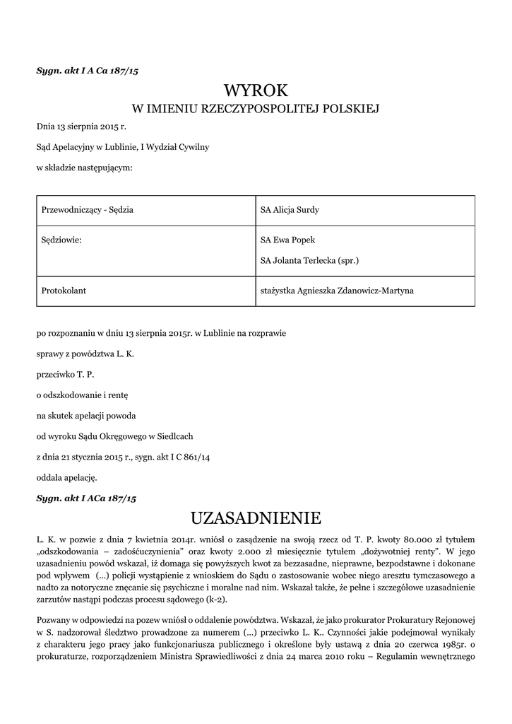 Sygn. akt I A Ca 187/15 WYROK W IMIENIU RZECZYPOSPOLITEJ POLSKIEJ Dnia 13 sierpnia 2015 r. Sąd Apelacyjny w Lublinie, I Wydział Cywilny w składzie następującym: Przewodniczący - Sędzia SA Alicja Surdy Sędziowie: SA Ewa Popek SA Jolanta Terlecka (spr.) Protokolant stażystka Agnieszka Zdanowicz-Martyna po rozpoznaniu w dniu 13 sierpnia 2015r. w Lublinie na rozprawie sprawy z powództwa L. K. przeciwko T. P. o odszkodowanie i rentę na skutek apelacji powoda od wyroku Sądu Okręgowego w Siedlcach z dnia 21 stycznia 2015 r., sygn. akt I C 861/14 oddala apelację. Sygn. akt I ACa 187/15 UZASADNIENIE L. K. w pozwie z dnia 7 kwietnia 2014r. wniósł o zasądzenie na swoją rzecz od T. P. kwoty 80.000 zł tytułem „odszkodowania – zadośćuczynienia” oraz kwoty 2.000 zł miesięcznie tytułem „dożywotniej renty”. W jego uzasadnieniu powód wskazał, iż domaga się powyższych kwot za bezzasadne, nieprawne, bezpodstawne i dokonane pod wpływem (...) policji wystąpienie z wnioskiem do Sądu o zastosowanie wobec niego aresztu tymczasowego a nadto za notoryczne znęcanie się psychiczne i moralne nad nim. Wskazał także, że pełne i szczegółowe uzasadnienie zarzutów nastąpi podczas procesu sądowego (k-2). Pozwany w odpowiedzi na pozew wniósł o oddalenie powództwa. Wskazał, że jako prokurator Prokuratury Rejonowej w S. nadzorował śledztwo prowadzone za numerem (...) przeciwko L. K.. Czynności jakie podejmował wynikały z charakteru jego pracy jako funkcjonariusza publicznego i określone były ustawą z dnia 20 czerwca 1985r. o prokuraturze, rozporządzeniem Ministra Sprawiedliwości z dnia 24 marca 2010 roku – Regulamin wewnętrznego urzędowania powszechnych jednostek organizacyjnych prokuratury, przepisami kodeksu postępowania karnego jak również zarządzeniem Prokuratora Rejonowego w S., które określa podział czynności prokuratorów. Wskazał, że prokurator realizuje uprawnienia w interesie państwa, gdyż zadaniem prokuratury jest strzeżenie praworządności oraz czuwanie nad ściganiem przestępstw. Czynności jakie podejmował w sprawie podejmował jako prokurator w interesie państwa a nie jako osoba fizyczna. Zdaniem pozwanego brak jest po jego stronie legitymacji procesowej biernej, gdyż powód wywodzi swoje roszczenia z rzekomo wadliwego prowadzenia postępowania przygotowawczego, a więc odnosi się do funkcjonowania państwa w sferze wykonywania funkcji władczych i realizacji zadań władzy publicznej. Pozwany nadto wskazał, że zgodnie z dyspozycją artykułu 417 § 1 k.c. za ewentualną szkodę wyrządzoną przez niezgodne z prawem działanie lub zaniechanie przy wykonywaniu władzy publicznej ponosi odpowiedzialność Skarb Państwa, a w tym przypadku Prokuratura Rejonowa w S. a nie on jako osoba fizyczna (k- 53-54). Na rozprawie w dniu 21 stycznia 2015r. powód przyznał, że otrzymał odpowiedź na pozew i podtrzymał swoje powództwo przeciwko T. P.. Pozwany zaś wnosił o oddalenie powództwa zgodnie ze stanowiskiem zawartym w odpowiedzi na pozew (k-64). Sąd Okręgowy w Siedlcach wyrokiem z dnia 21 stycznia 2015r. oddalił to powództwo bez obciążania powoda kosztami procesu (k-67), opierając swoje rozstrzygnięcie na następujących ustaleniach i wnioskach. Komenda Powiatowa Policji w Ł. wykonywała powierzone jej czynności w ramach śledztwa prowadzonego przez Prokuraturę Rejonową w S. dotyczącego przestępstwa usiłowania rozboju. W toku postępowania, które toczyło się pod sygnaturą (...), prokurator Prokuratury Rejonowej w S. T. P. przedstawił L. K. zarzuty popełnienia czynów polegających na pomocnictwie i podżeganiu do rozboju, handlu narkotykami i papierosami bez akcyzy i posiadaniu narkotyków oraz trzykrotnie przesłuchał powoda w charakterze podejrzanego. Następnie wymieniony prokurator skierował do Sądu Rejonowego w S. wniosek o zastosowanie wobec powoda środka zapobiegawczego w postaci tymczasowego aresztowania. Podejrzanym o usiłowanie rozboju w toku tego postępowania był K. M., który złożył wyjaśnienia obciążające powoda. Wobec tego podejrzanego także został skierowany wniosek o zastosowanie tymczasowego aresztowania. Sąd Rejonowy w Siedlcach uwzględnił wniosek o tymczasowe aresztowanie L. K. na okres trzech miesięcy. Złożone przez powoda zażalenie nie zostało uwzględnione i w efekcie powód nadal przebywa w areszcie śledczym. Aktualnie, po wniesieniu aktu oskarżenia, postępowanie przeciwko powodowi toczy się przed Sądem Rejonowym w Siedlcach i nie zostało jeszcze zakończone wydaniem wyroku. Ustaleń tych Sąd Okręgowy dokonał na podstawie zeznań stron, które w tym zakresie ocenił jako spójne. W tak ustalonych okolicznościach uznał, że powództwo należało oddalić. Wyjaśnił, że powód wystąpił z roszczeniami o zapłatę określonych kwot tytułem zadośćuczynienia oraz renty przeciwko T. P.. W uzasadnieniu pozwu, a także składając zeznania L. K. stwierdził, że pozwany jako prokurator w toku prowadzonego postępowania przygotowawczego bezprawnie skierował przeciwko niemu wniosek o zastosowanie tymczasowego aresztowania nie mając ku temu podstaw w zgromadzonym materialne dowodowym, lecz kierując się wyłącznie wyjaśnieniami drugiego podejrzanego oraz tym, że powód był wcześniej karany. Powód zarzucał więc pozwanemu bezprawność działania w trakcie wykonywania czynności zawodowych prokuratora prowadzącego postępowanie przygotowawcze i przyznał, że z pozwanym miał jedynie kontakt jako z prokuratorem. Sąd przypomniał jaka jest rola między innymi Prokuratury jako organu ochrony prawnej - jej zadanie polegające strzeżeniu praworządności oraz czuwaniu nad ściganiem przestępstw jest wykonywane przez prokuratorów między innymi przez prowadzenie lub nadzorowanie postępowania przygotowawczego w sprawach karnych oraz sprawowanie funkcji oskarżyciela publicznego przed sądami (art. 1, 2 i 3 ustawy z dnia 20 czerwca 1985r. 