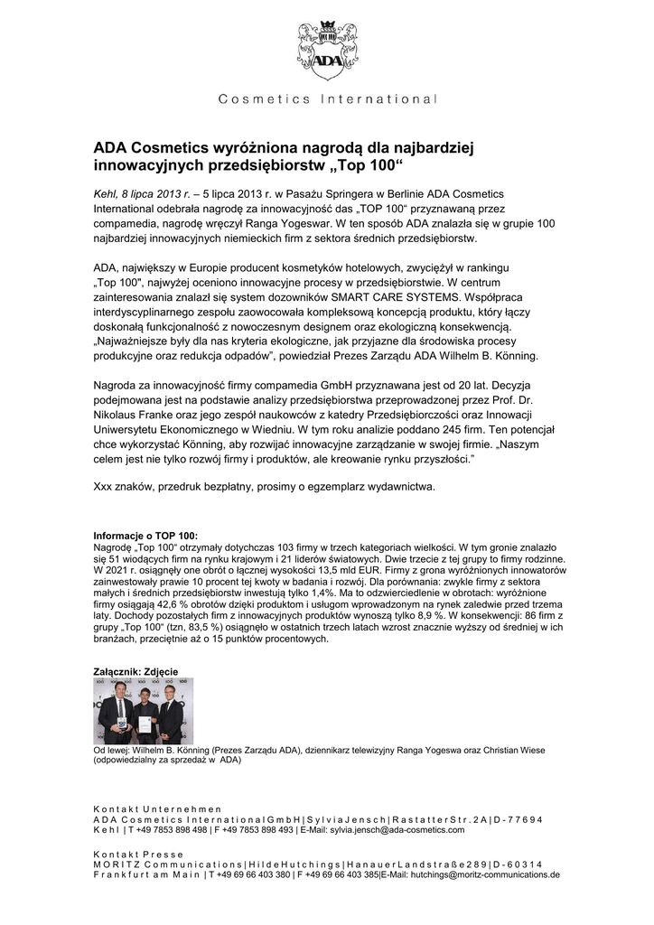 ADA Cosmetics wyróżniona nagrodą dla najbardziej innowacyjnych przedsiębiorstw „Top 100“ Kehl, 8 lipca 2013 r. – 5 lipca 2013 r. w Pasażu Springera w Berlinie ADA Cosmetics International odebrała nagrodę za innowacyjność das „TOP 100“ przyznawaną przez compamedia, nagrodę wręczył Ranga Yogeswar. W ten sposób ADA znalazła się w grupie 100 najbardziej innowacyjnych niemieckich firm z sektora średnich przedsiębiorstw. ADA, największy w Europie producent kosmetyków hotelowych, zwyciężył w rankingu „Top 100", najwyżej oceniono innowacyjne procesy w przedsiębiorstwie. W centrum zainteresowania znalazł się system dozowników SMART CARE SYSTEMS. Współpraca interdyscyplinarnego zespołu zaowocowała kompleksową koncepcją produktu, który łączy doskonałą funkcjonalność z nowoczesnym designem oraz ekologiczną konsekwencją. „Najważniejsze były dla nas kryteria ekologiczne, jak przyjazne dla środowiska procesy produkcyjne oraz redukcja odpadów”, powiedział Prezes Zarządu ADA Wilhelm B. Könning. Nagroda za innowacyjność firmy compamedia GmbH przyznawana jest od 20 lat. Decyzja podejmowana jest na podstawie analizy przedsiębiorstwa przeprowadzonej przez Prof. Dr. Nikolaus Franke oraz jego zespół naukowców z katedry Przedsiębiorczości oraz Innowacji Uniwersytetu Ekonomicznego w Wiedniu. W tym roku analizie poddano 245 firm. Ten potencjał chce wykorzystać Könning, aby rozwijać innowacyjne zarządzanie w swojej firmie. „Naszym celem jest nie tylko rozwój firmy i produktów, ale kreowanie rynku przyszłości.” Xxx znaków, przedruk bezpłatny, prosimy o egzemplarz wydawnictwa. Informacje o TOP 100: Nagrodę „Top 100“ otrzymały dotychczas 103 firmy w trzech kategoriach wielkości. W tym gronie znalazło się 51 wiodących firm na rynku krajowym i 21 liderów światowych. Dwie trzecie z tej grupy to firmy rodzinne. W 2021 r. osiągnęły one obrót o łącznej wysokości 13,5 mld EUR. Firmy z grona wyróżnionych innowatorów zainwestowały prawie 10 procent tej kwoty w badania i rozwój. Dla porównania: zwykle firmy z sektora małych i średnich przedsiębiorstw inwestują tylko 1,4%. Ma to odzwierciedlenie w obrotach: wyróżnione firmy osiągają 42,6 % obrotów dzięki produktom i usługom wprowadzonym na rynek zaledwie przed trzema laty. Dochody pozostałych firm z innowacyjnych produktów wynoszą tylko 8,9 %. W konsekwencji: 86 firm z grupy „Top 100“ (tzn, 83,5 %) osiągnęło w ostatnich trzech latach wzrost znacznie wyższy od średniej w ich branżach, przeciętnie aż o 15 punktów procentowych. Załącznik: Zdjęcie Od lewej: Wilhelm B. Könning (Prezes Zarządu ADA), dziennikarz telewizyjny Ranga Yogeswa oraz Christian Wiese (odpowiedzialny za sprzedaż w ADA) Kontakt Unternehmen ADA Cosmetics InternationalGmbH|SylviaJensch|RastatterStr.2A|D-77694 K e h l | T +49 7853 898 498 | F +49 7853 898 493 | E-Mail: [email protected] Kontakt Presse MORITZ Communications|HildeHutchings|HanauerLandstraße289|D-60314 F r a n k f u r t a m M a i n | T +49 69 66 403 380 | F +49 69 66 403 385|E-Mail: [email protected]
