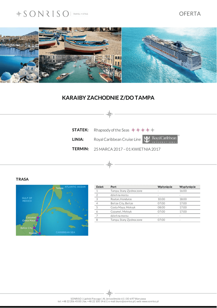 OFERTA KARAIBY ZACHODNIE Z/DO TAMPA STATEK: Rhapsody of the Seas LINIA: Royal Caribbean Cruise Line TERMIN: 25 MARCA 2017 – 01 KWIETNIA 2017 TRASA Dzień 1 2 3 4 5 6 7 8 Port Tampa, Stany Zjednoczone dzień na morzu Roatan, Honduras Belize City, Belize Costa Maya, Meksyk Cozumel, Meksyk dzień na morzu Tampa, Stany Zjednoczone Wpłynięcie 10:00 07:00 08:00 07:00 07:00 SONRISO | Lipiński Passage | Al. Jero zo limskie 61 | 00-697 Warszawa tel. +48 22 206 45 00 | fax. +48 22 100 14 61 | e-mail: biuro @so nriso .pl | web: www.so nriso .pl Wypłynięcie 16:00 18:00 17:00 17:00 17:00 - OFERTA CENA Typ kabiny Cena z osobę kabnia wewnętrzna od 503 EUR kabina zewnętrzna z oknem kabina zewnętrzna z balkonem od 636 EUR od 1 007 EUR CENA ZAWIERA DOTATKOWE OPŁATY zakwaterowanie w 2 - os. kabinie wybranej kategorii pełne wyżywienie: 3 posiłki, przekąski między posiłakmi, bufet o północy napoje do posiłków: woda stołowa, kawa, herbata oraz sok do śniadania serwis bagażowy podczas wejścia i zejścia ze statku 24 godzinny serwis kabinowy korzystanie z urządzeń sportowo - rekreacyjnych dostępnych na pokładzie (baseny, jacuzzi, boiska sportowe, kluby dla dzieci i młodzieży itp.) udział we wszystkich imprezach organizowanych na pokładzie (przedstawienia, pokazy, aukcje, animacje i inne) obowiązkowe opłaty portowe obowiązkową opłatę serwisową (napiwki) dla obsługi statku dojazd/przelot do portu rozpoczęcia i zakończenia rejsu transfery (lotnisko - port - lotnisko) ewentualne noclegi przed lub po rejsie wycieczki fakultatywne napoje: bezalkoholowe, alkoholowe, woda mineralna dostępne w restauracjach i barach (istnieje możliwość wykupienia pakietów napojów, o szczegóły zapytaj w biurze) korzystanie z mini baru w kabinie korzystanie z usług typu: SPA, salon piękności, pralnia itp. wydatki osobiste tj. zakupy w butikach, internet, kasyno itp. obowiązkowe ubezpieczenie turystyczne koszt wymaganych wiz ewentualna opłata paliwowa (linia w momencie wzrotu cen ropy zastrzega sobie prawo do dodania oplaty paliwowej do każdej rezerwacji) Na życzenie świadczymy dodatkowo usługi: rezerwacje hotelowe na całym świecie, rezerwacje biletów lotniczych, trasferów oraz parkingu w porcie, rezerwacje wycieczek fakultatywnych i innych atrakcji SONRISO | Lipiński Passage | Al. Jero zo limskie 61 | 00-697 Warszawa tel. +48 22 206 45 00 | fax. +48 22 100 14 61 | e-mail: biuro @so nriso .pl | web: www.so nriso .pl