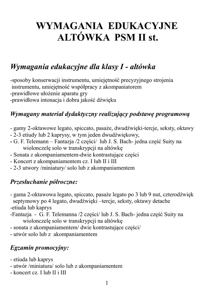 WYMAGANIA EDUKACYJNE ALTÓWKA PSM II st. Wymagania edukacyjne dla klasy I - altówka -sposoby konserwacji instrumentu, umiejętność precyzyjnego strojenia instrumentu, umiejętność współpracy z akompaniatorem -prawidłowe ułożenie aparatu gry -prawidłowa intonacja i dobra jakość dźwięku Wymagany materiał dydaktyczny realizujący podstawę programową - gamy 2-oktawowe legato, spiccato, pasaże, dwudźwięki-tercje, seksty, oktawy - 2-3 etiudy lub 2 kaprysy, w tym jeden dwudźwiękowy, - G. F. Telemann – Fantazja /2 części/ lub J. S. Bach- jedna część Suity na wiolonczelę solo w transkrypcji na altówkę - Sonata z akompaniamentem-dwie kontrastujące części - Koncert z akompaniamentem cz. I lub II i III - 2-3 utwory /miniatury/ solo lub z akompaniamentem Przesłuchanie półroczne: - gama 2-oktawowa legato, spiccato, pasaże legato po 3 lub 9 nut, czterodźwięk septymowy po 4 legato, dwudźwięki –tercje, seksty, oktawy detache -etiuda lub kaprys -Fantazja - G. F. Telemanna /2 części/ lub J. S. Bach- jedna część Suity na wiolonczelę solo w transkrypcji na altówkę - sonata z akompaniamentem/ dwie kontrastujące części/ - utwór solo lub z akompaniamentem Egzamin promocyjny: - etiuda lub kaprys - utwór /miniatura/ solo lub z akompaniamentem - koncert cz. I lub II i III 1 Wymagania edukacyjne dla klasy II – altówka - Doskonalenie aparatu gry - prawidłowa korelacja prawej i lewej ręki dbałość o prawidłową intonację i jakość dźwięku - doskonalenie smyczkowania spiccato, staccato i sautille - umiejętność koncentracji oraz opanowanie tremy podczas występu - zdolność dokonywania właściwej analizy swojej gry Wymagany materiał dydaktyczny realizujący podstawę programową -gamy 3-oktawowe legato, spiccato, staccato, sautille, pasaże po 9 legato, czterodźwięk septymowy - po 4; gamy w tercjach, sekstach i oktawach detache - 2 etiudy lub 2 kaprysy, w tym jeden dwudźwiękowy - Fantazja G. F. Telemanna /dwie części/ lub J. S. Bach- jedna część Suity na wiolonczelę solo w transkrypcji na altówkę -koncert z akompaniamentem fortepianu /cz. I lub II i III/ -sonata z akompaniamentem fortepianu –dwie kontrastujące części -2-3 utwory /miniatury / solo lub z akompaniamentem fortepianu Przesłuchanie półroczne: - gama 3-oktawowa legato, spiccato, pasaże legato po 3 lub 9 nut, czterodźwięk septymowy po 4 legato, dwudźwięki –tercje, seksty, oktawy detache -etiuda lub kaprys -G. F. Telemanna /2 części/ lub J. S. Bach- jedna część Suity na wiolonczelę solo w transkrypcji na altówkę - sonata z akompaniamentem/ dwie kontrastujące części/ - utwór solo lub z akompaniamentem Egzamin promocyjny: - etiuda lub kaprys - utwór /miniatura/ solo lub z akompaniamentem – koncert cz. I lub II i III 2 Wymagania edukacyjne dla klasy III – altówka -Doskonalenie aparatu gry - dbałość o prawidłową intonację i jakość dźwięku - praca nad zwiększaniem biegłości palcowej lewej ręki i swobodnym operowaniu smyczkiem - umiejętność frazowania i operowania zróżnicowaną barwą i sposobami artykulacji - ćwiczenie trylu i właściwa realizacja ozdobników. Wymagany materiał dydaktyczny realizujący podstawę programową - gama 3-oktawowa legato, spiccato, sautille, pasaże legato po 9, czterodźwięk septymowy legato po 4 nuty, dwudźwięki –tercje, seksty, oktawy detache - 2-3 etiudy lub kaprysy –w tym jeden dwudźwiękowy - Fantazja G. F. Telemanna /2 części/ lub J. S. Bach - Suita na wiolonczelę solo w transkrypcji na altówkę /jedna lub dwie części/ - sonata z akompaniamentem fortepianu /dwie kontrastujące części/ - koncert z akomp. cz. I lub II i III - 2-3 utwory /miniatury/ solo lub z akompaniamentem fortepianu. Przesłuchanie półroczne: - gama 3-oktawowa różnymi sposobami artykulacji, gama w tercjach, sekstach, oktawach, - etiuda lub kaprys - Fantazja G. F. Telemanna /2 części/ lub J. S. Bach - Suita na wiolonczelę solo w transkrypcji na altówkę /jedna część/ - utwór dowolny /miniatura/ solo lub z akompaniamentem - sonata z akompaniamentem –dwie kontrastujące części Egzamin promocyjny: - etiuda lub kaprys - koncert z akompaniamentem cz. I lub II i III - utwór dowolny solo lub z akompaniamentem 3 Wymagania edukacyjne dla klasy IV – altówka - dbałość o prawidłową intonację i jakość dźwięku - problematyka smyczkowania: arpeggio, ricochet - umiejętność frazowania, operowania barwą i zróżnicowanymi sposobami artykulacji - doskonalenie aparatu gry - umiejętność posługiwania się dynamiką i zastosowaniem właściwej agogiki - rozumienie pojęć muzycznych, samodzielne odnajdywanie środków wyrazu i określenie charakteru utworu Wymagany materiał dydaktyczny realizujący podstawę programową – gamy dur, moll 3-oktawowe legato, spiccato, staccato, sautille, pasaże po 3, 9 legato, czterodźwięk septymowy po 4 legato, dwudźwięki –tercje, seksty, oktawy detache - 2-3 etiudy lub 2 kaprysy, w tym jeden dwudźwiękowy, - Fantazja G. F. Telemanna /2 części/ lub J. S. Bach - Suita na wiolonczelę solo w transkrypcji na altówkę /jedna lub dwie części/ - koncert z akompaniamentem cz. I lub II i III - sonata z akompaniamentem fortepianu /dwie kontrastujące części/ - 2-3 utwory /miniatury/ solo lub z akompaniamentem fortepianu Przesłuchanie półroczne - gama 3-oktawowa legato, spiccato, staccato, sautille, pasaże, dwudźwięki tercje, seksty, oktawy, decymy, oktawy palcowane, gama chromatyczna - etiuda lub kaprys - Fantazja G. F. Telemanna /dwie części/ lub J. S. Bach - Suita na wiolonczelę solo w transkrypcji na altówkę /jedna lub dwie części/ - utwór dowolny solo lub z akompaniamentem fortepianu - sonata z akompaniamentem fortepianu –dwie kontrastujące części. Egzamin promocyjny: - etiuda lub kaprys - koncert z akompaniamentem cz. I lub II i III - utwór dowolny solo lub z akompaniamentem fortepianu 4 Wymagania edukacyjne dla klasy V – alt
